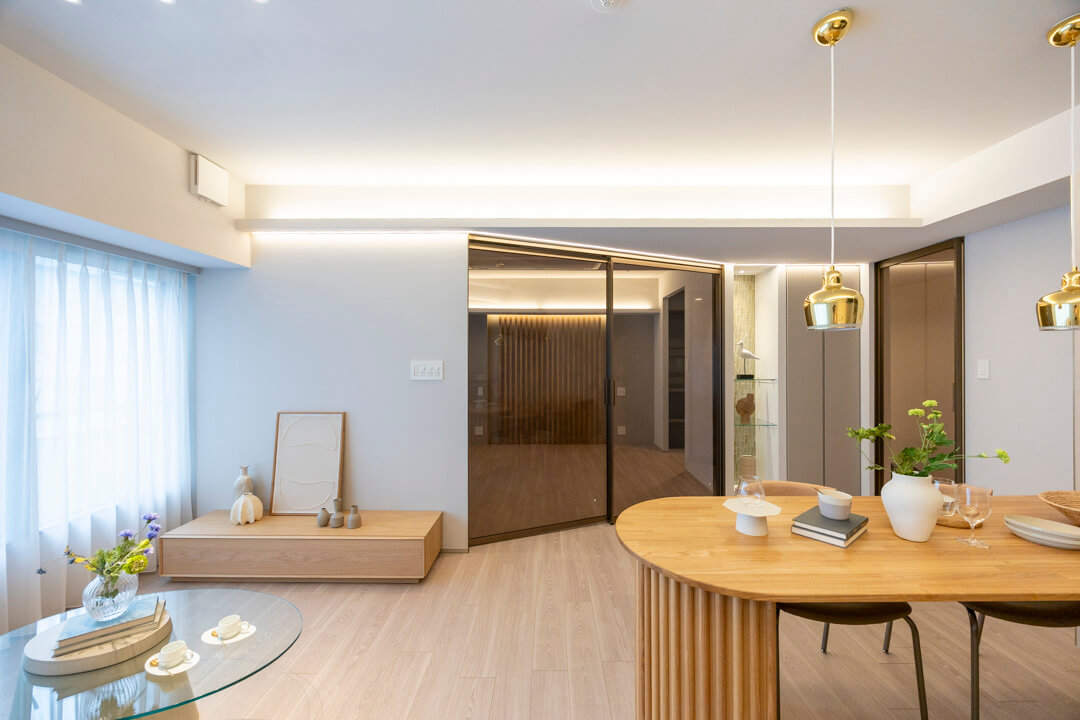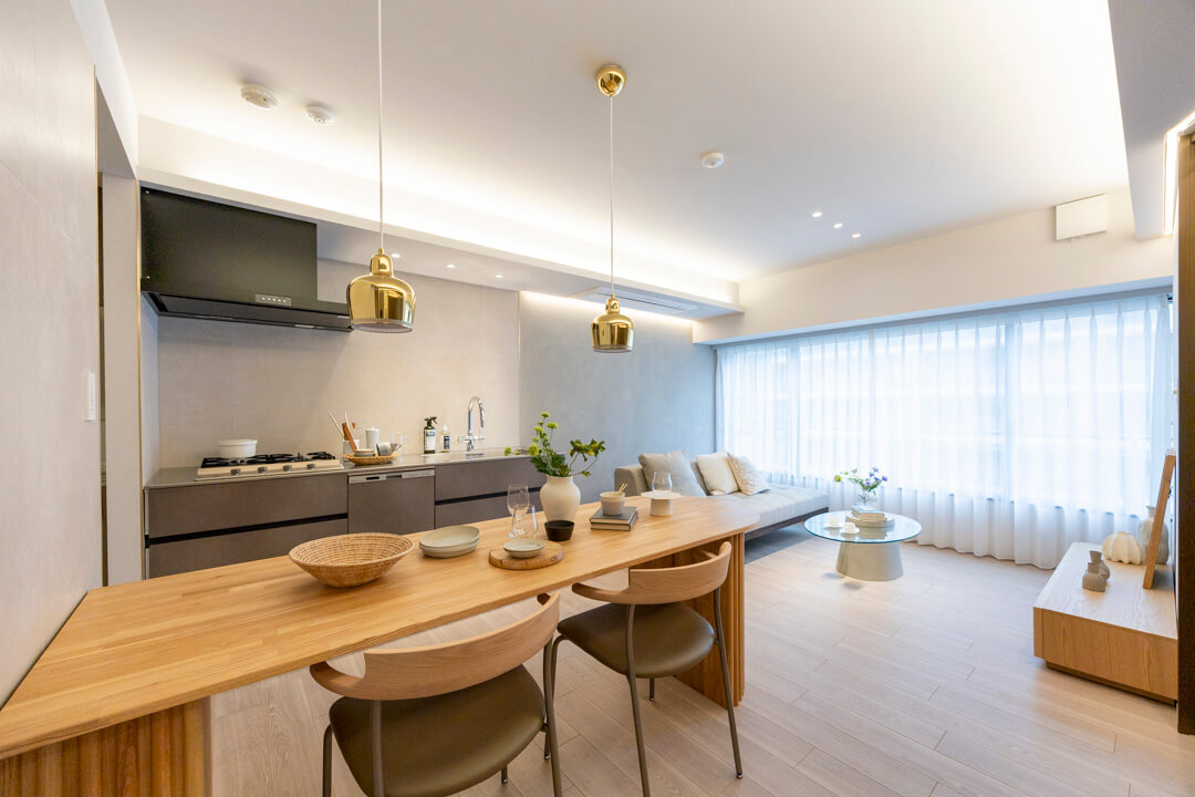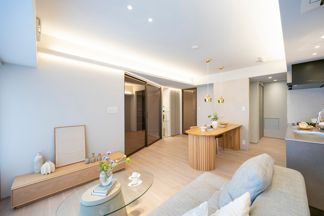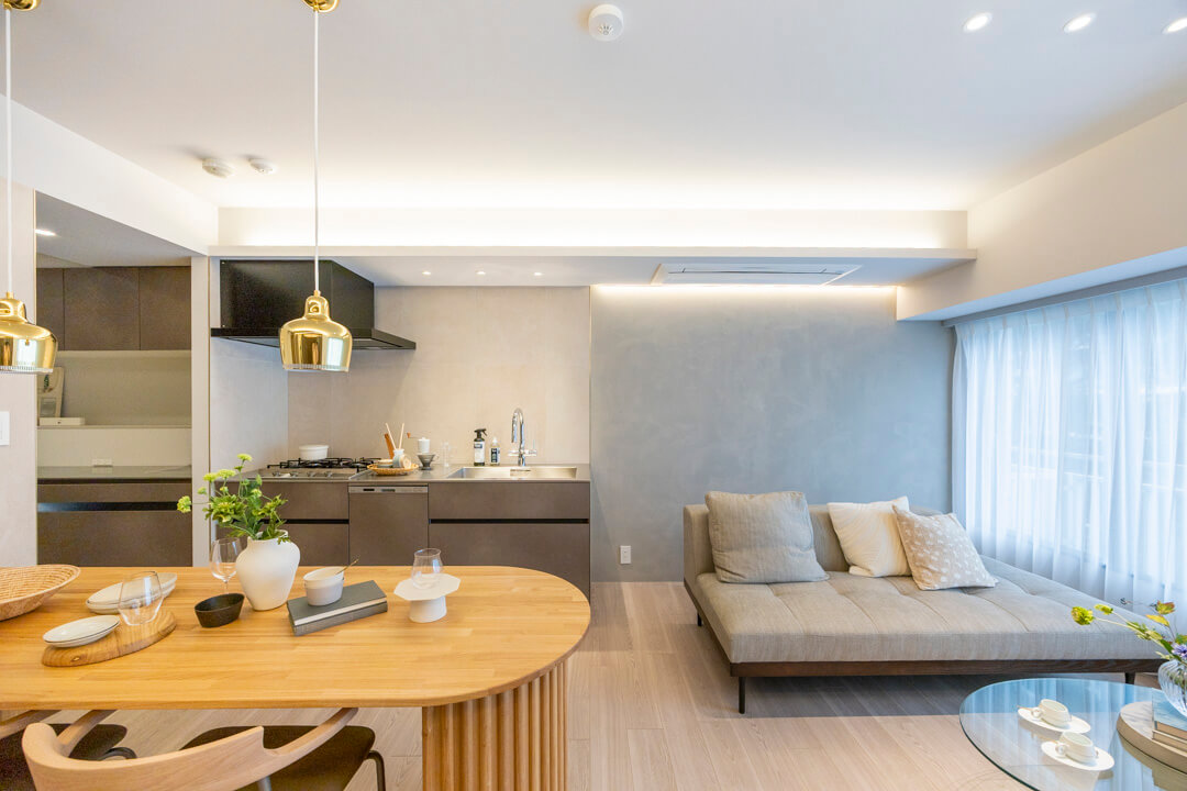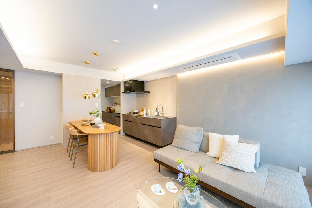 約15.37㎡の広々としたリビングダイニングキッチンです。天井や壁面には間接照明、アクセントクロスが設置されており、上品な雰囲気に包まれています。また、フローリングはナチュラルな風合いで美しい木目柄。どんな家具ともマッチするので、家具選びも楽しみになりそうです。