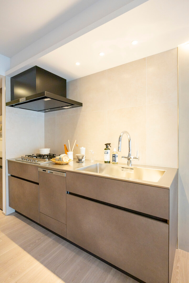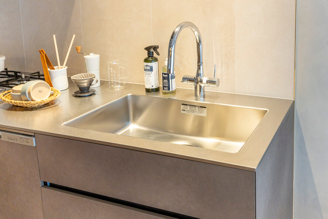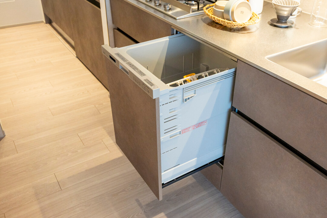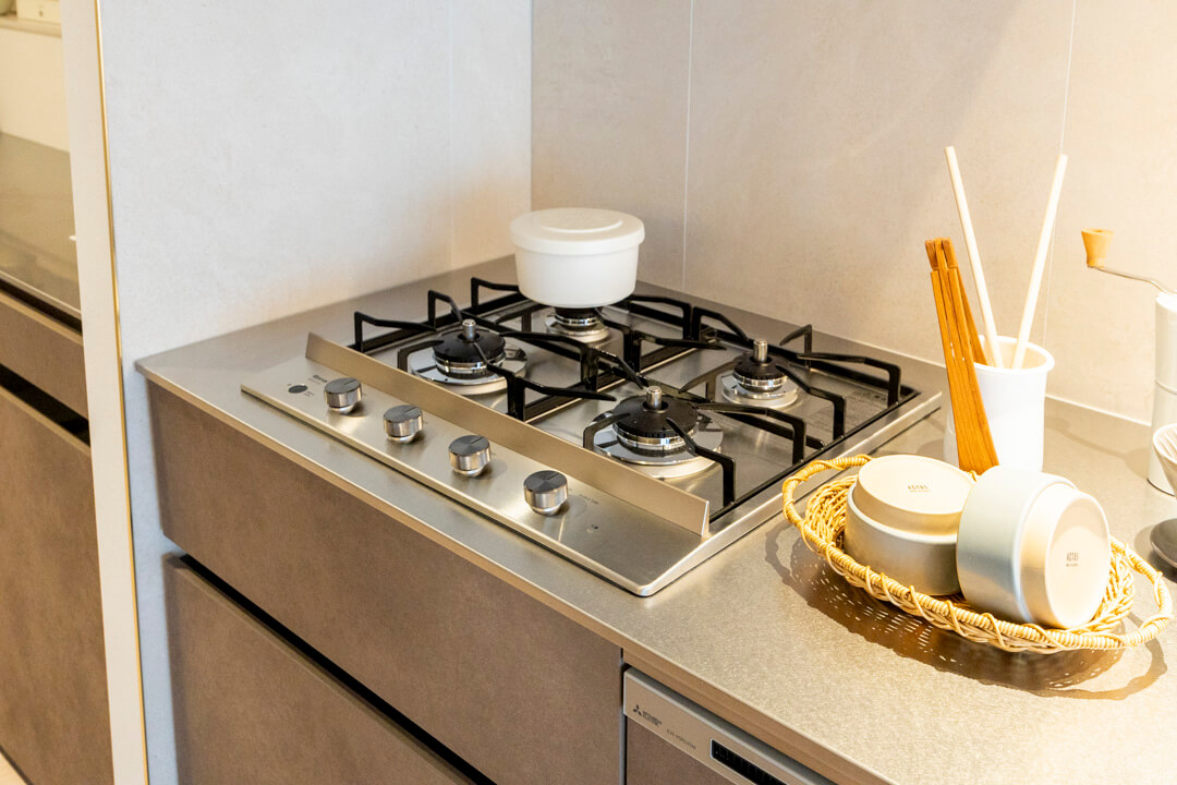 4口コンロ、食洗機付きと設備面も充実しています。シンクも広々としているので野菜などが洗いやすそうですよ。