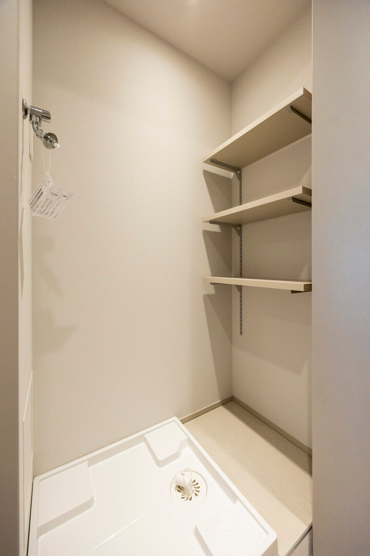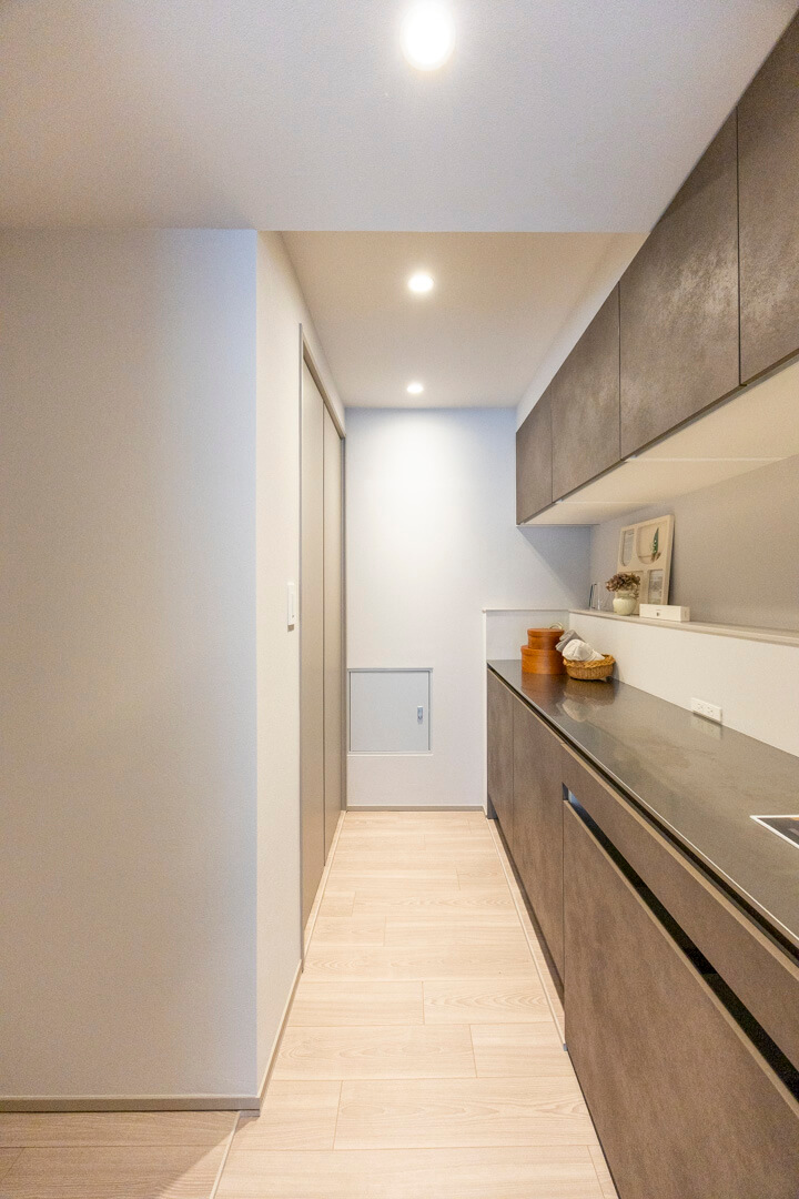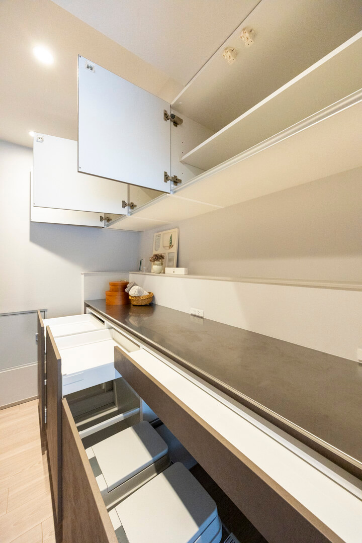 キッチン奥にはユーティリティが造られており、カップボードが設置されています。調味料や食器などを収納できるだけでなく、電子レンジなどを置くこともできるので便利です。扉付きの洗濯機置場もありますよ。