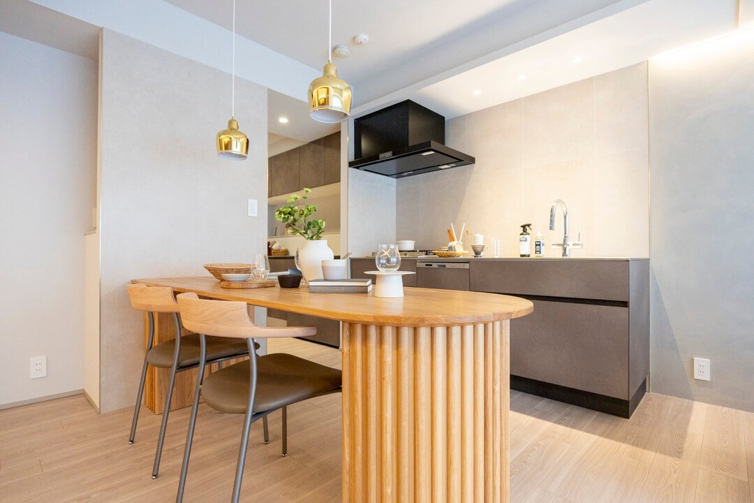 miratap「ウィッテ」を設置。エッジが際立つ究極のミニマルデザインで、ディテールまで美しさにこだわっています。造作のダイニングテーブルも丸みがあってアクセントになっています。