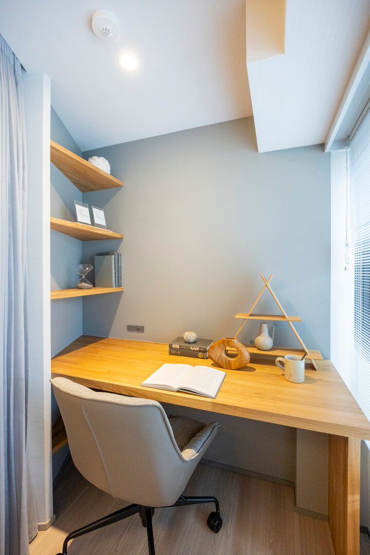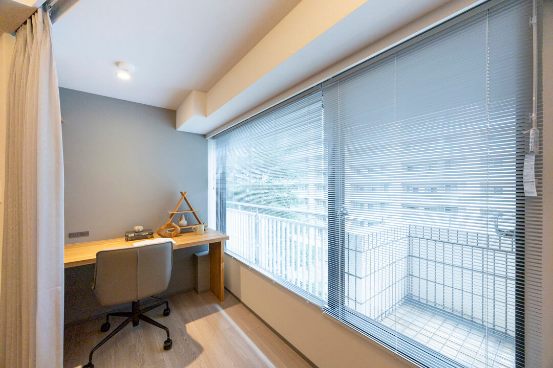 窓側のカーテンを引くと約1.90帖のDENがあります。書斎やリモートワークなどにもぴったりな空間です。コンセント付きでPC作業もできます。