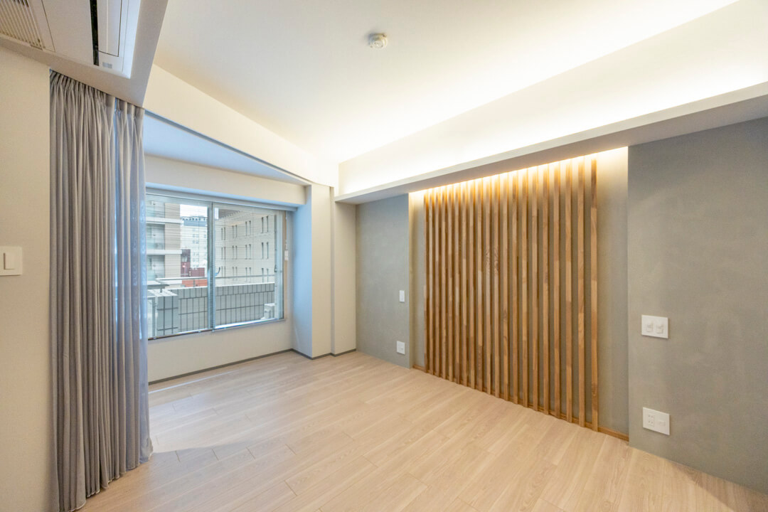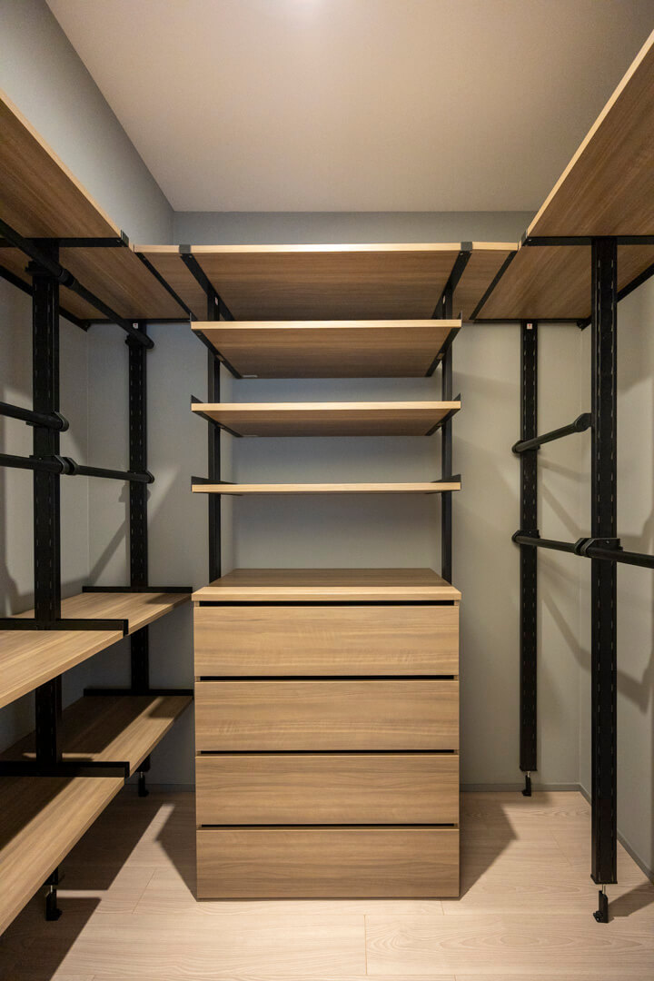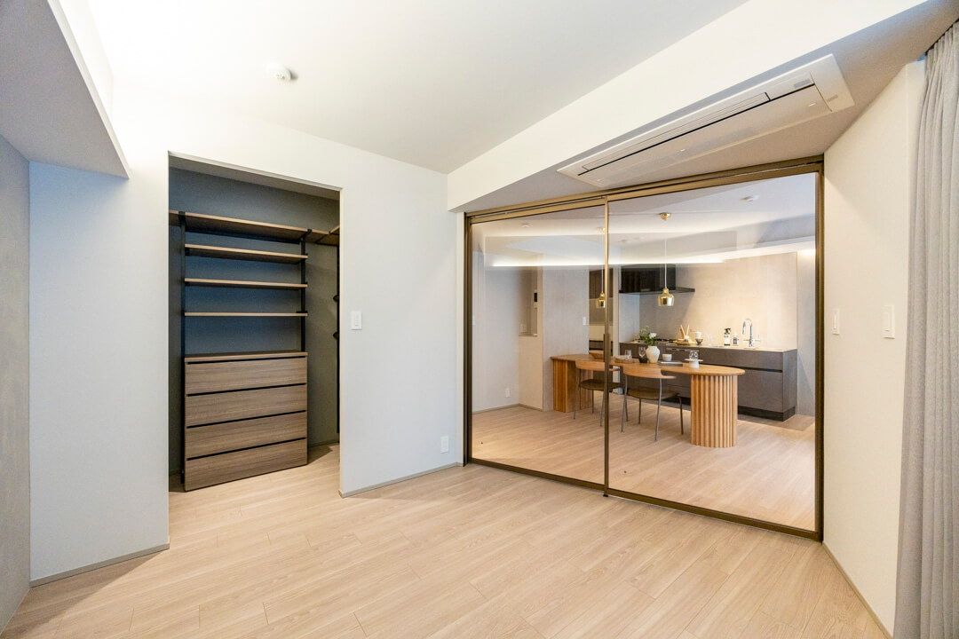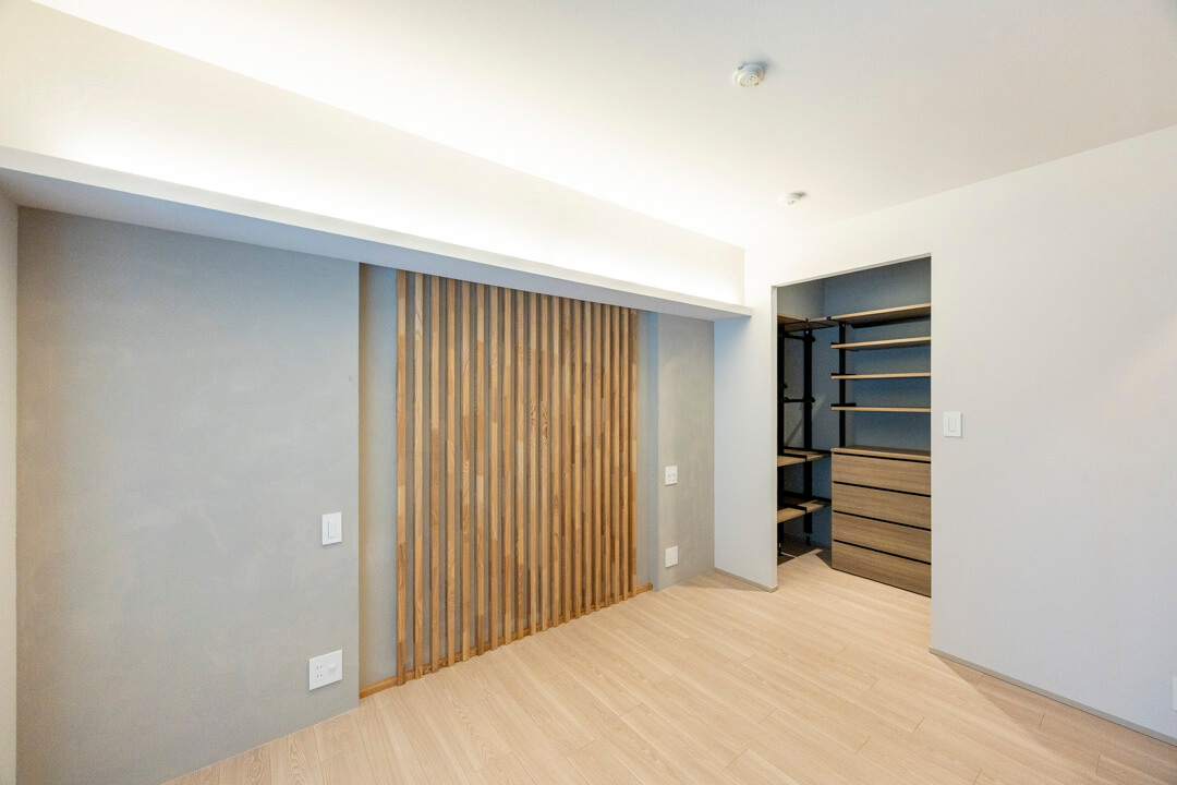約8.52㎡の寝室は、間接照明+アクセントウォールで穏やかな雰囲気。奥行きがあるウォークインクローゼット付きで、中には棚や引き出し、パイプハンガーが設置されています。色々な荷物を収納できて便利です。