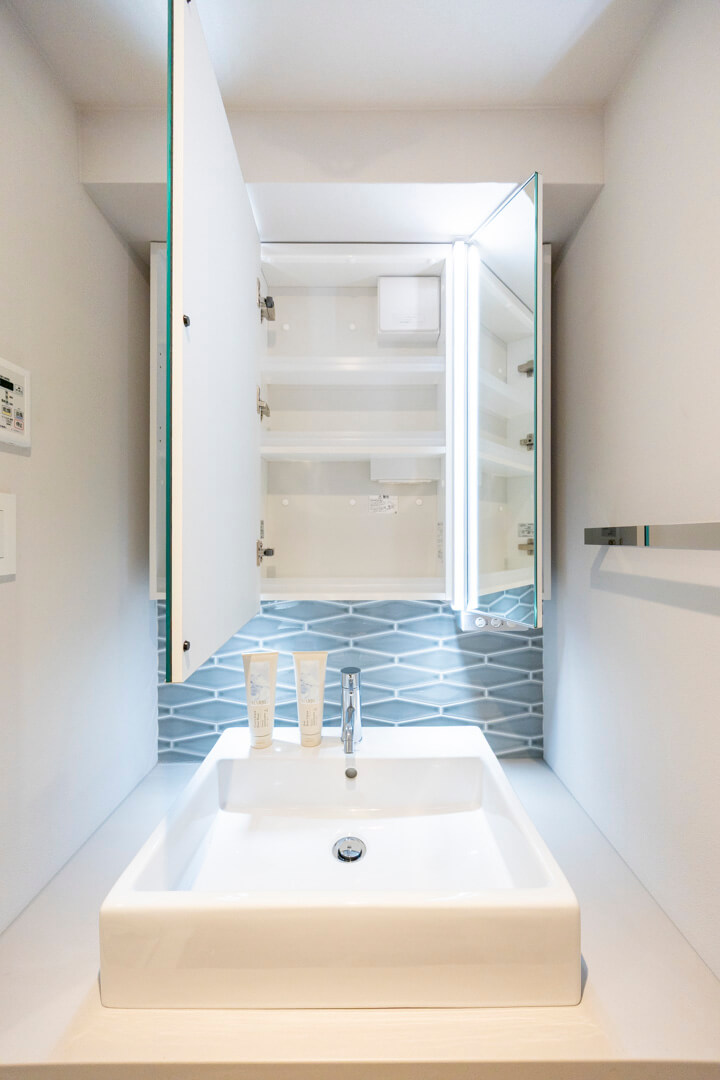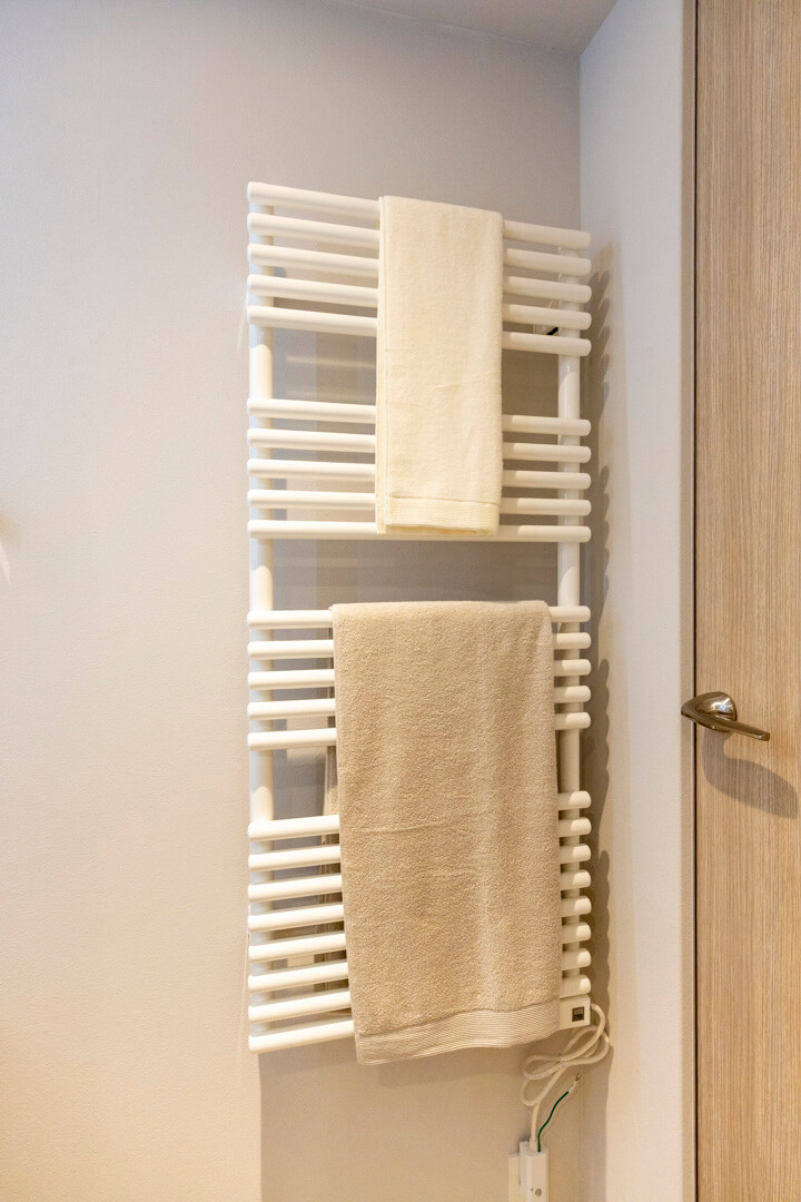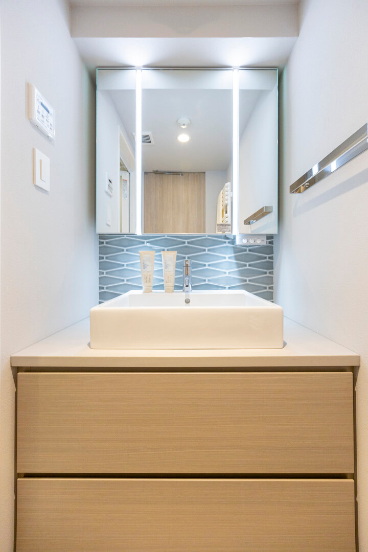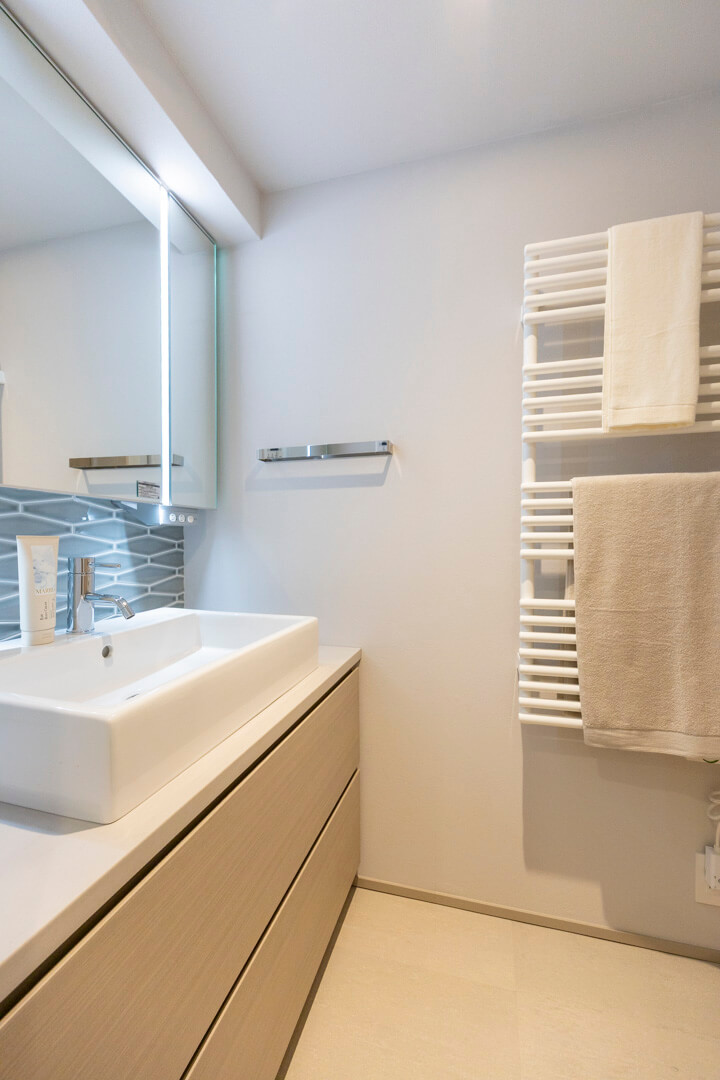 置き型式の洗面ボウルでおしゃれな印象の化粧台です。三面鏡の中に化粧品などが収納できて使い勝手が良好。照明は縦に配置されていて、顔に影をつくらないのも嬉しいですね。また、壁面にはタオルウォーマーが設置されています。入浴後、ふわっと暖かなタオルが優しく包み込んでくれますよ。