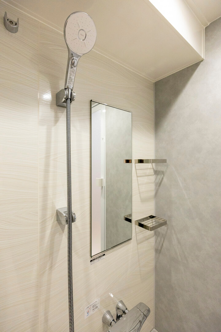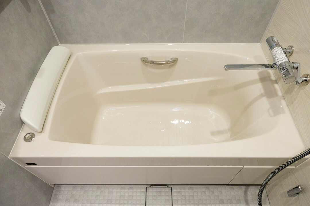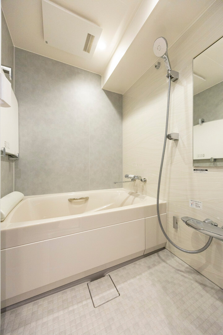 浴室はLIXIL製のスパージュを設置。のびやかなラインが特長の「ハイレスト浴槽」で、ヘッドレストが優しく足元を支えてくれます。また、浴室乾燥機には暖房・乾燥・換気・涼風の機能がついており、一年中快適に過ごすことができます。