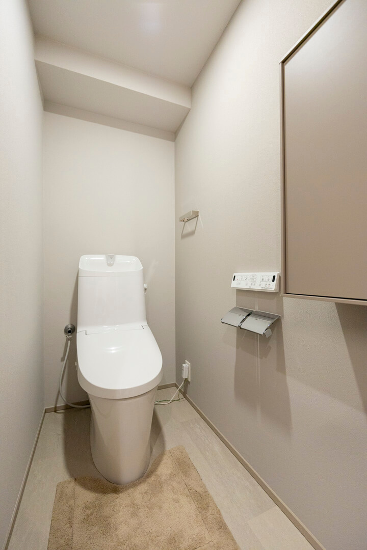 ウォシュレット一体型のトイレです。便器は新品の時の輝きが100年つづくアクアセラミック。普段通りに使うだけで簡単に節水できる超節水ECO5になっています。壁面には棚が設置されているので、サニタリー用品なども収納できます。