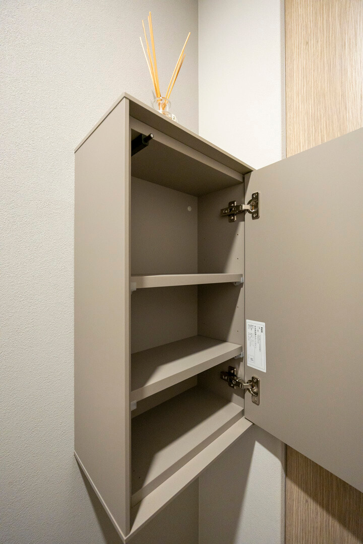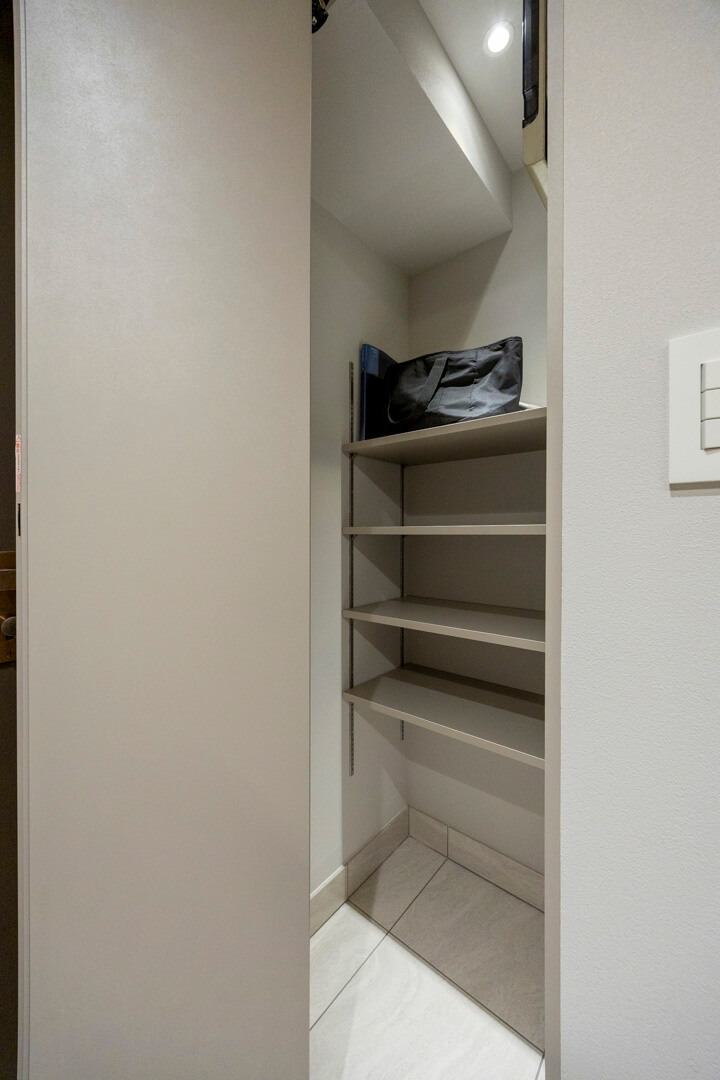 入口には飾り棚と収納棚が造られています。飾り棚には小物を飾ることができ、インテリアにも◎。また、収納棚には生活感が出がちな荷物をきちんと整頓できます。