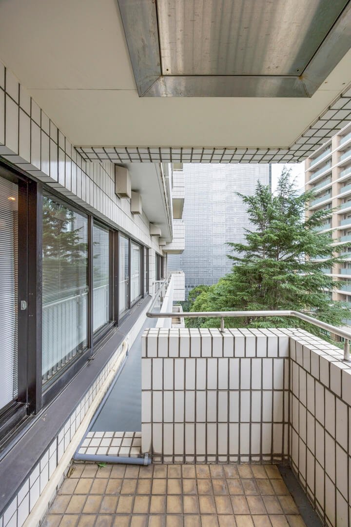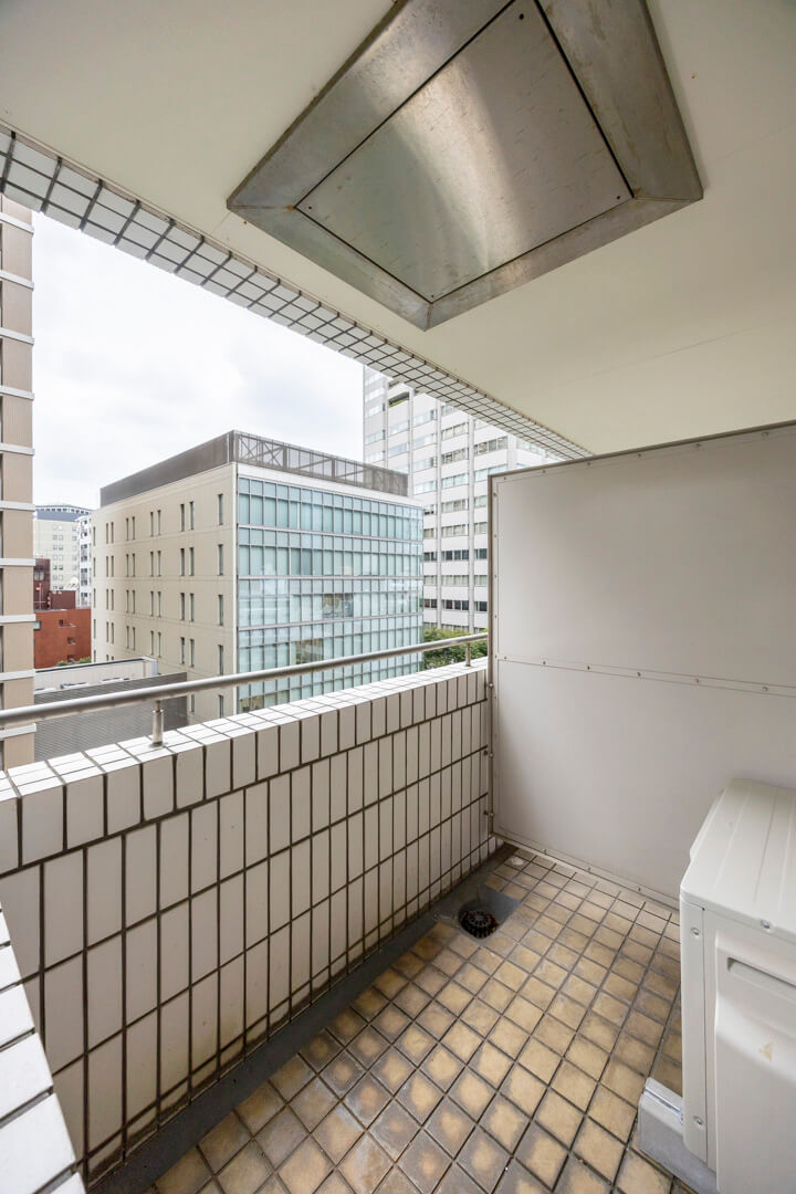 約6.83㎡のバルコニーは西向きです。奥行きがあるタイプで、屋根がしっかりとあります。8階部分で抜け感のある眺望となっています。