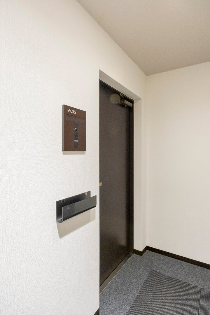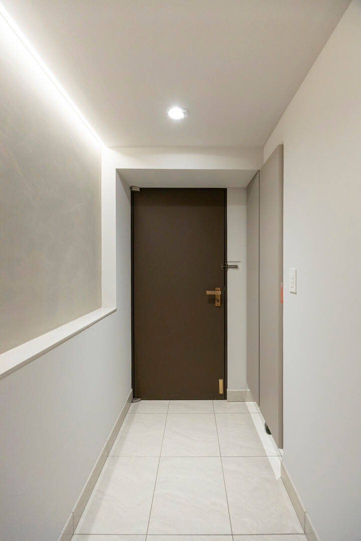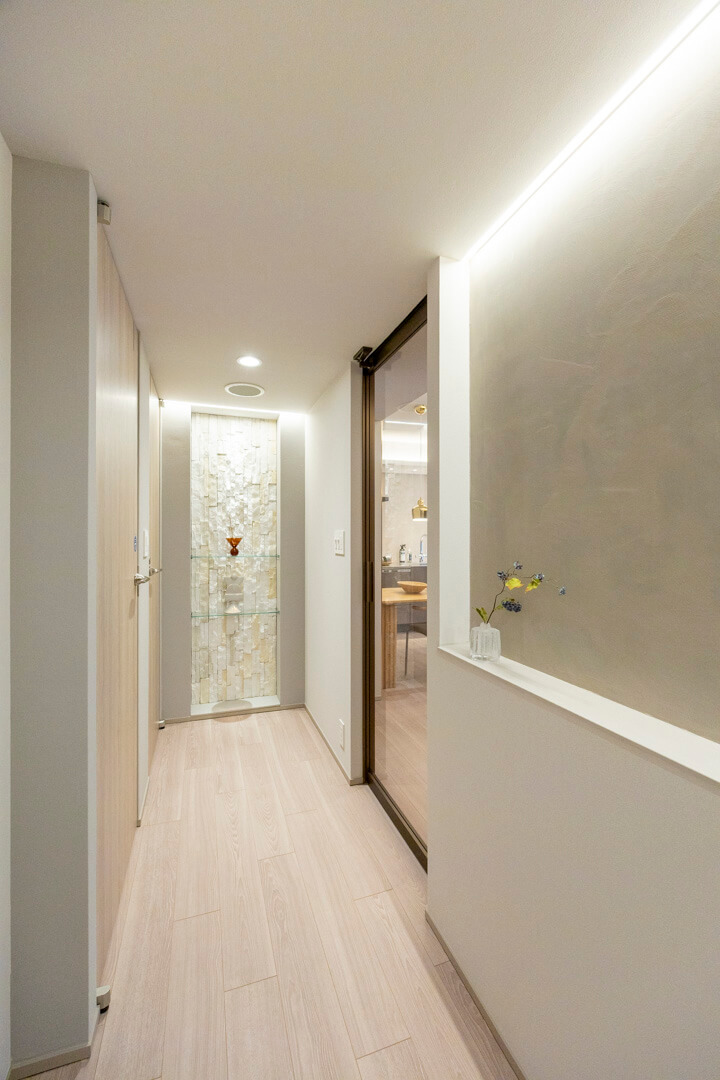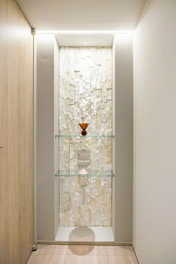 グレートーンで洗練された玄関・廊下です。入って左側にはクローゼットがあり、たくさんの靴が収納可能。廊下の突き当りには飾り棚が造られており、お気に入りの小物を飾ることができますよ。