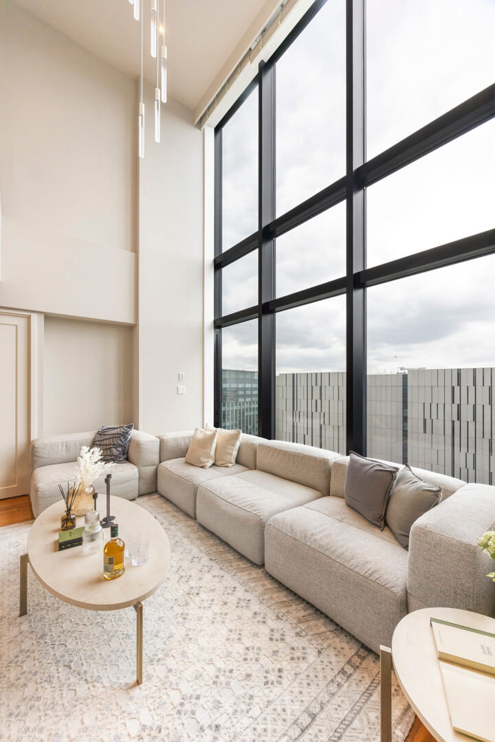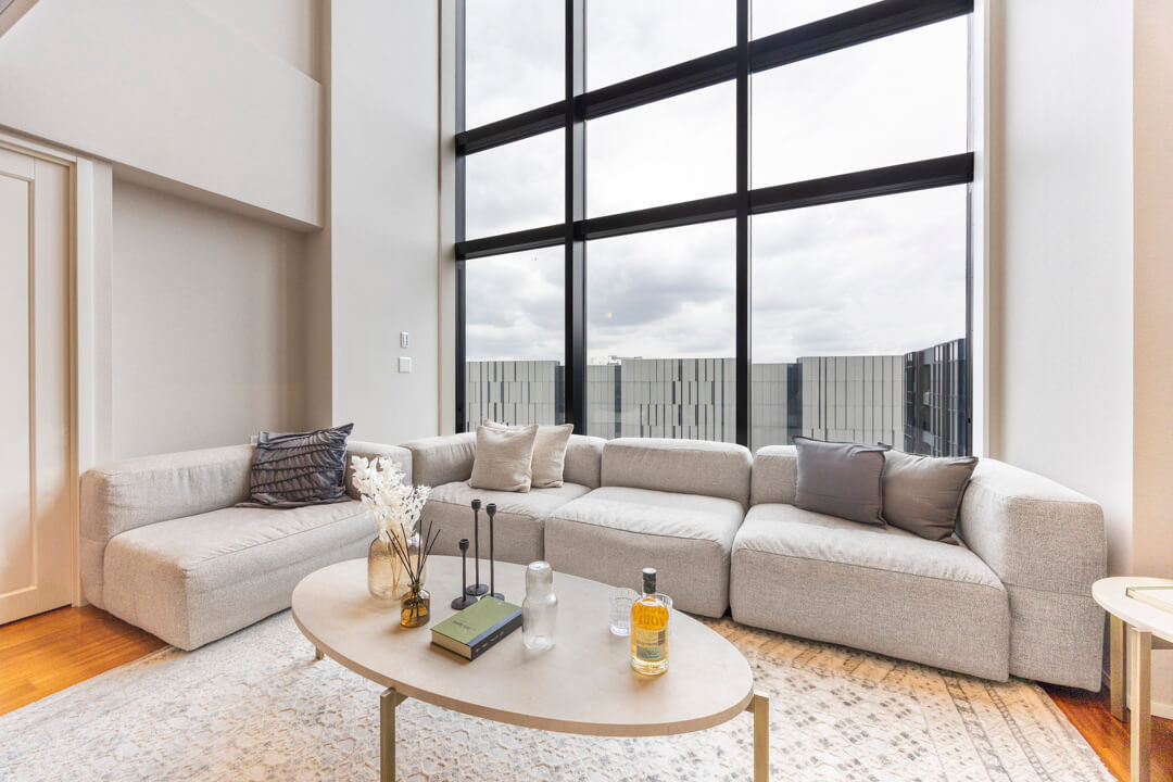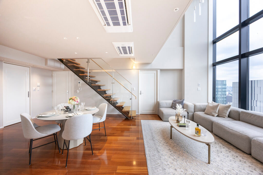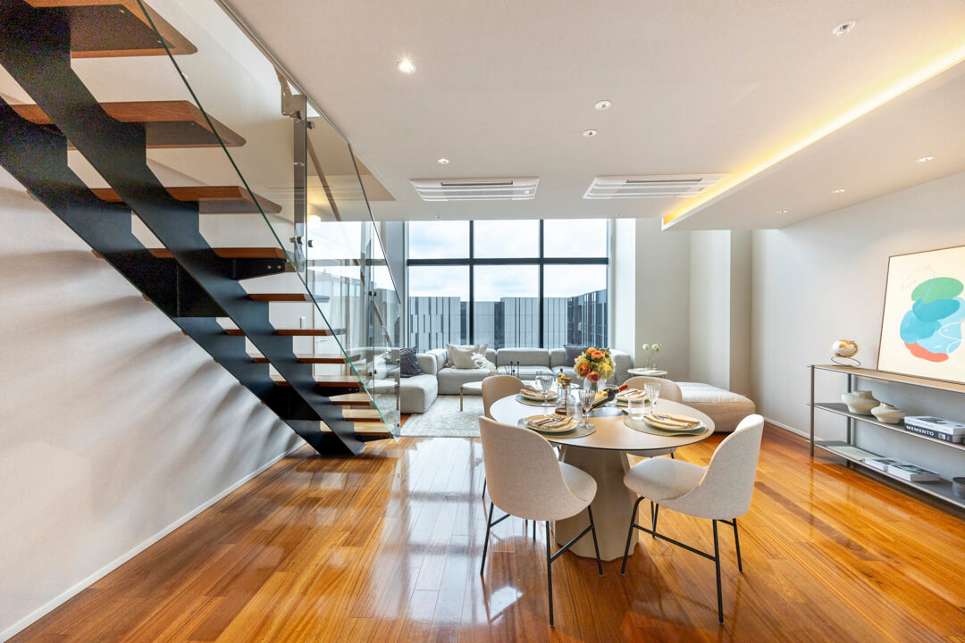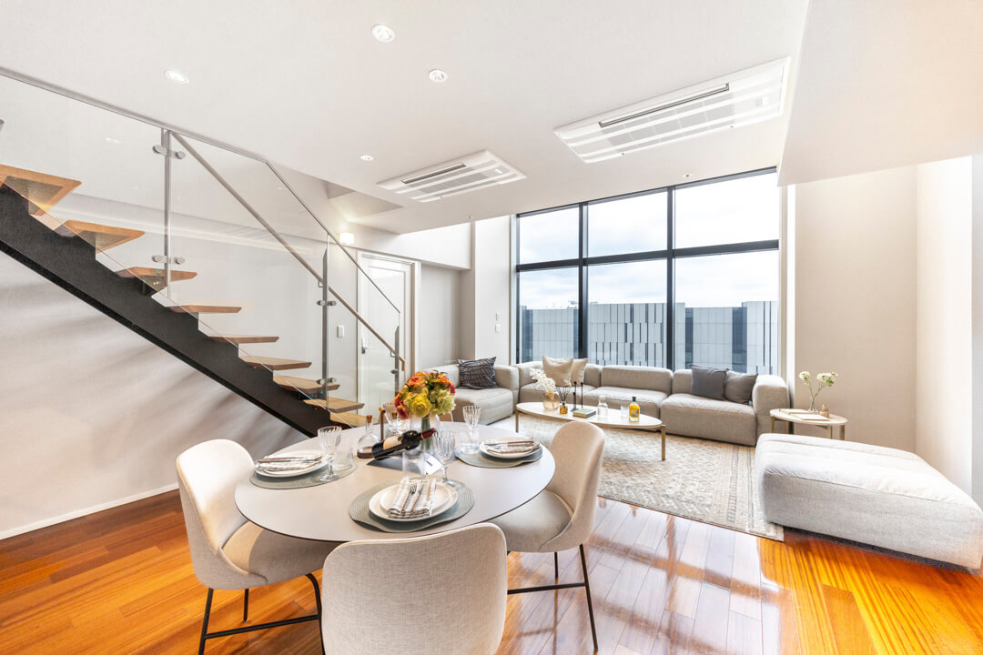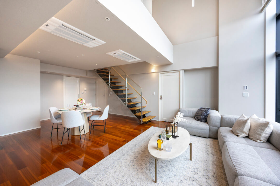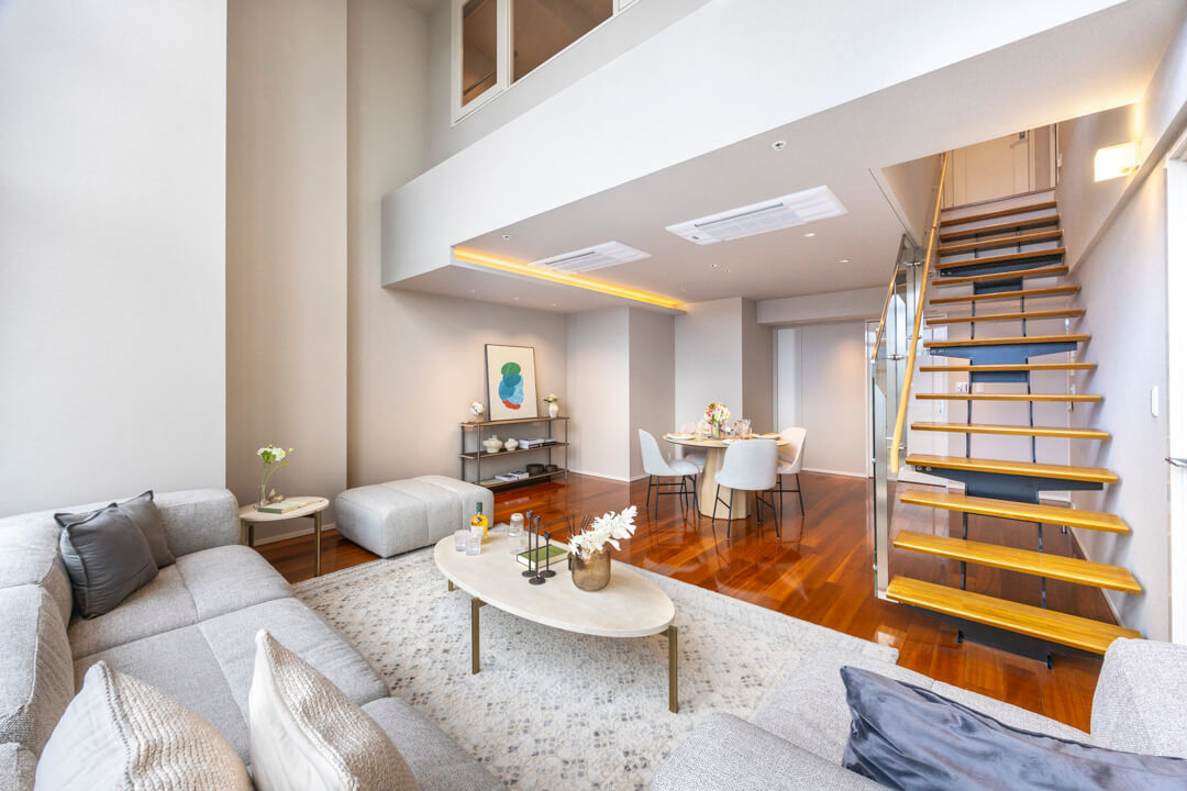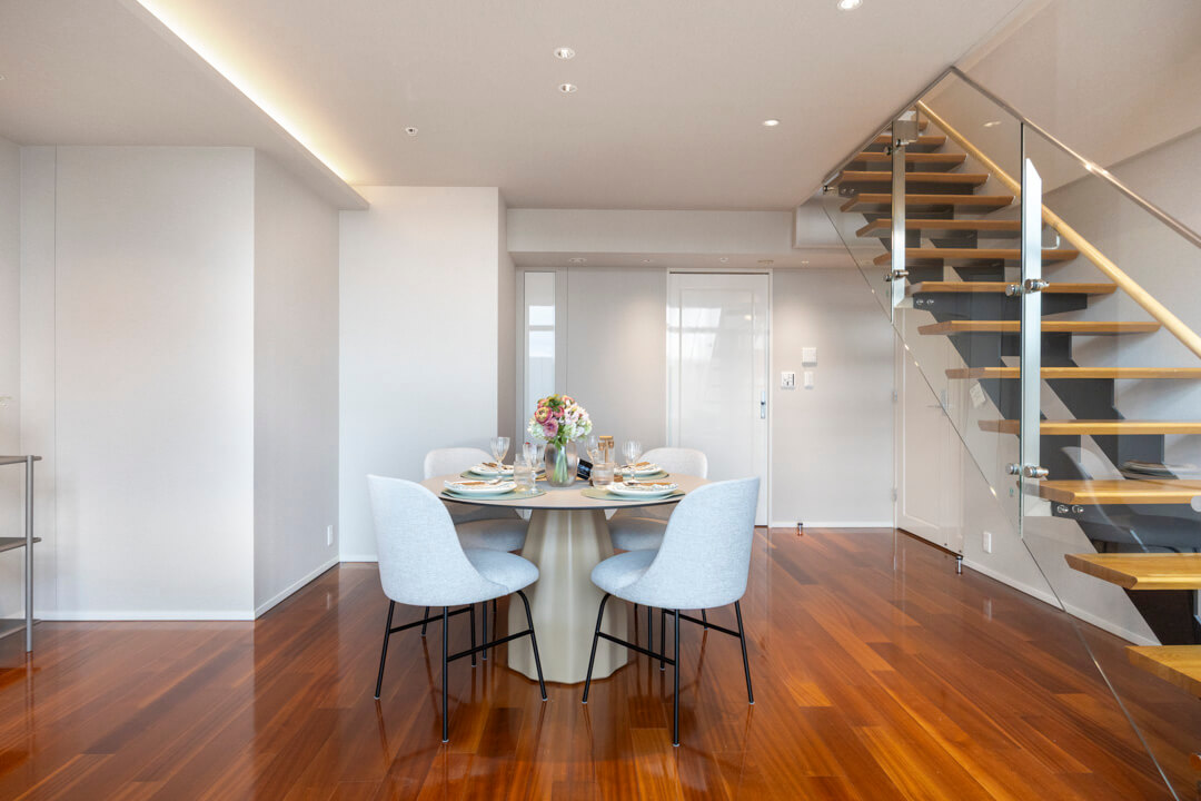 約24.0帖のリビングダイニング。38階~39階部のメゾネットタイプの住戸につき、リビングには吹き抜けがあり、広さに加え開放感もたっぷりと感じられます。方角は朝の光が心地よい東向き。吹き抜け部分まで続く存在感のある大きな窓からは見晴らしの良い景色が望めます。また、39階へと続く階段はデザイン性が高く、空間のアクセントとしても◎。一部の壁には間接照明も施されており、演出性も高めてくれます。