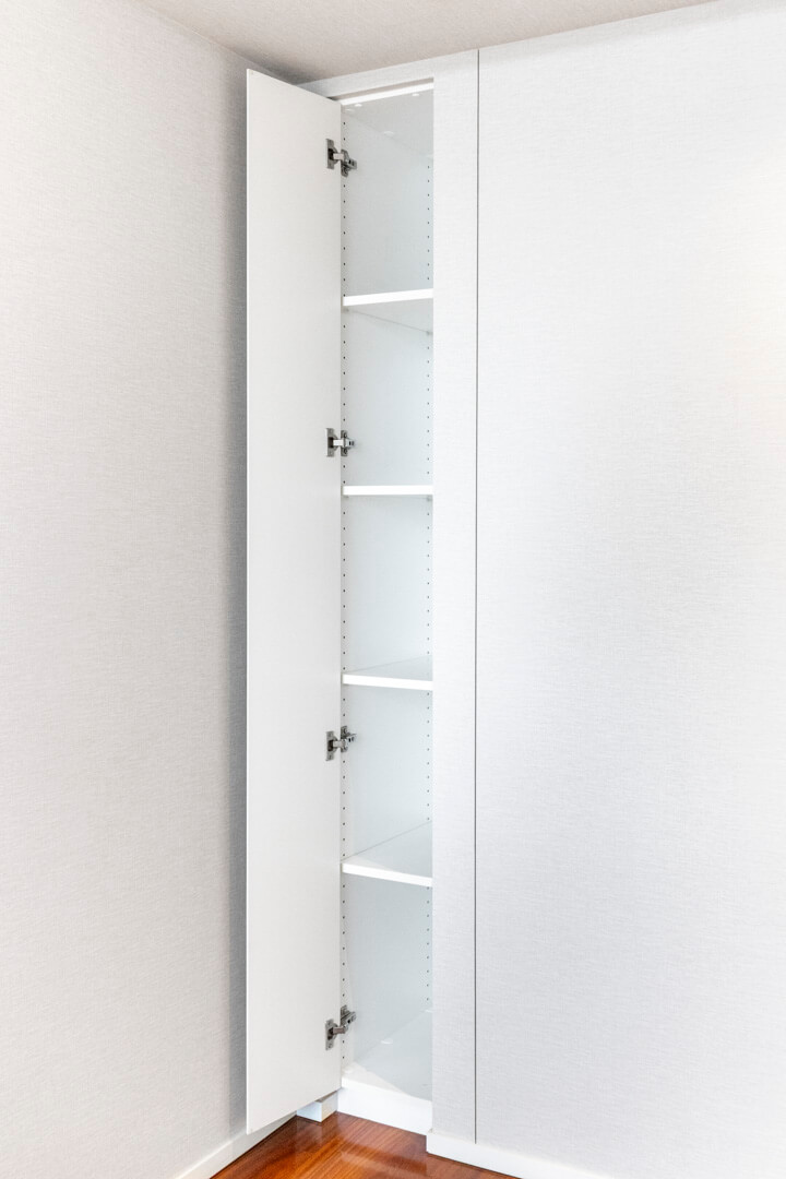 リビングダイニングとキッチンスペースが空間分けされており、生活感を感じさせないすっきりとした印象。キッチンスペースは扉付きで完全に目隠しもできます。また、リビングの一角にはコンパクトな収納スペースも完備。生活雑貨の整頓に便利です。