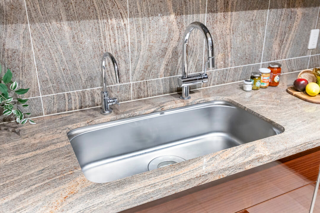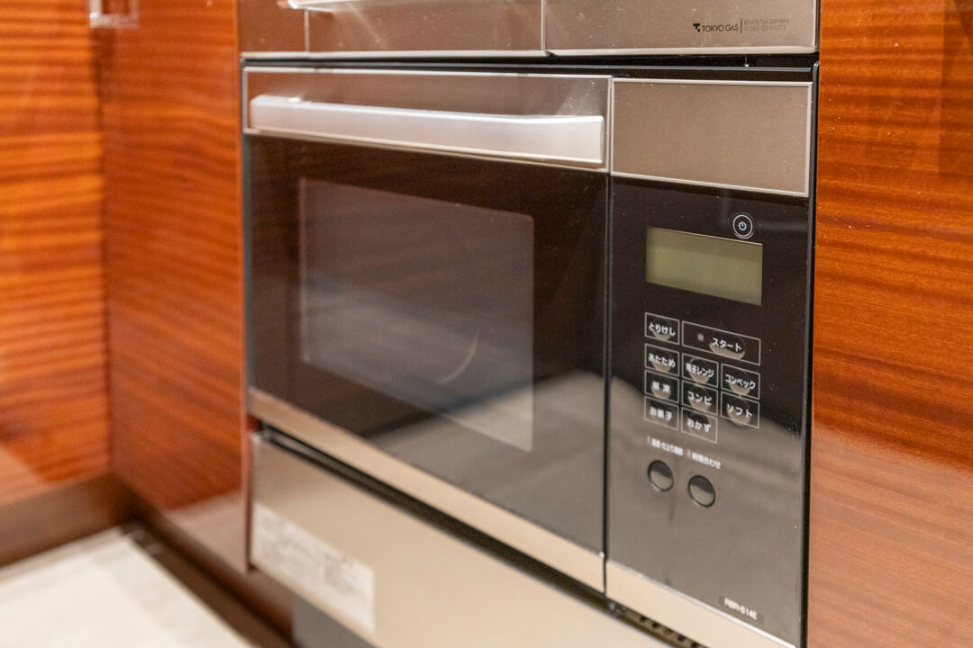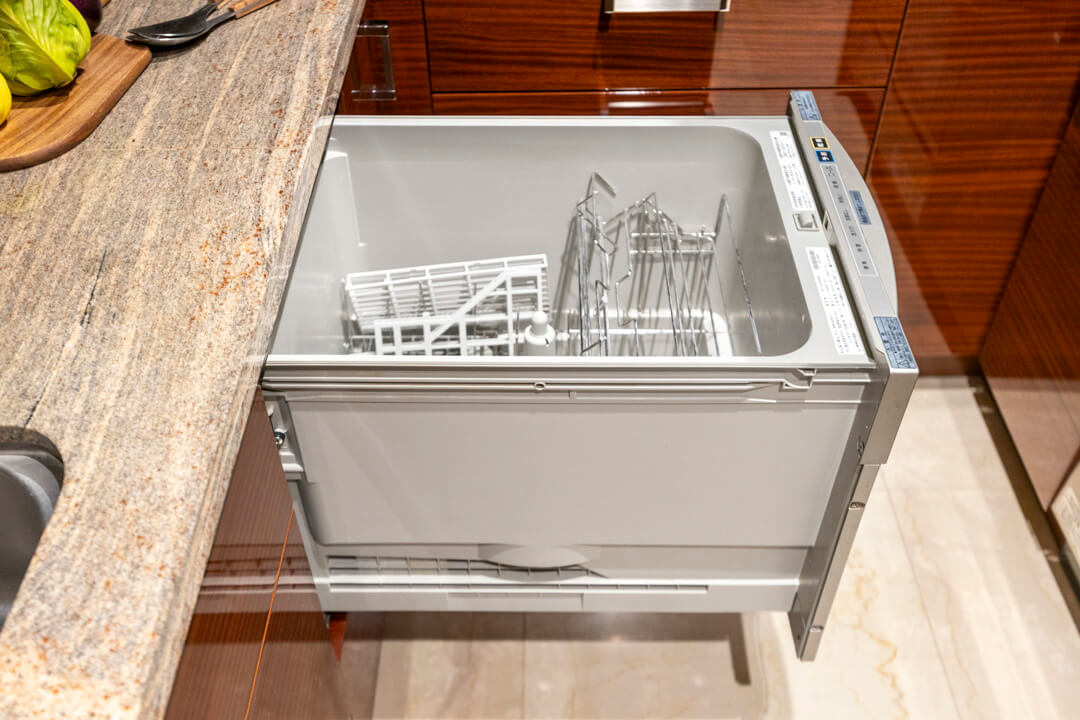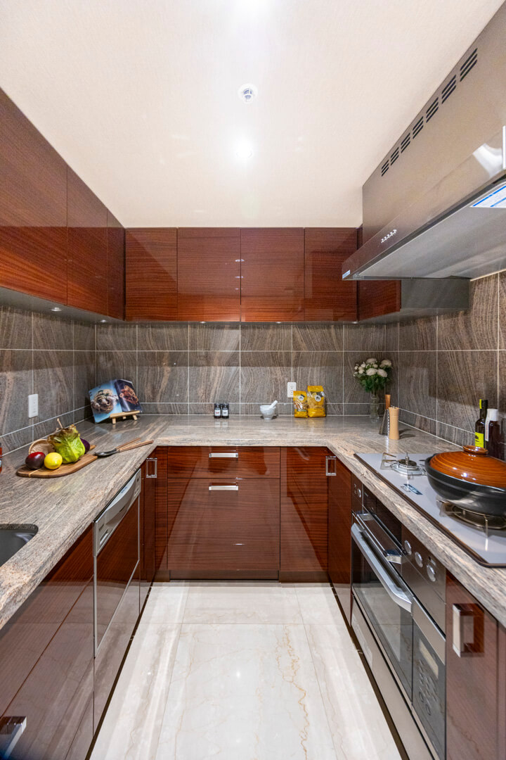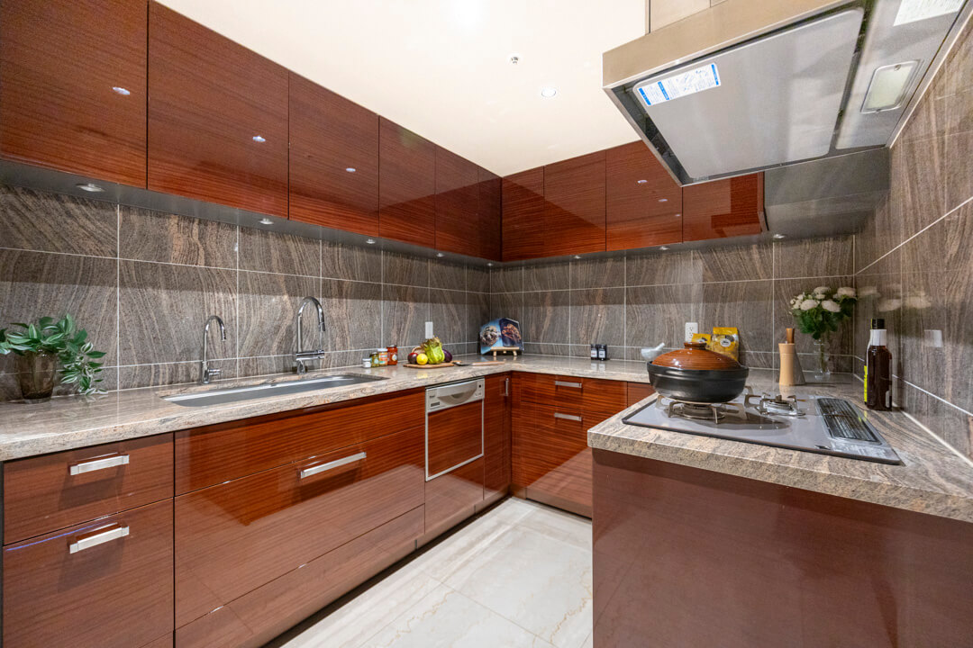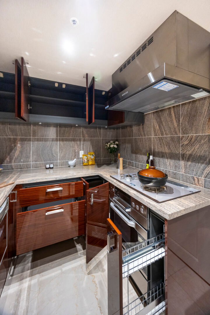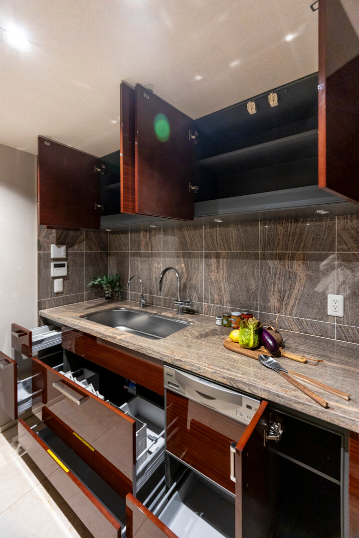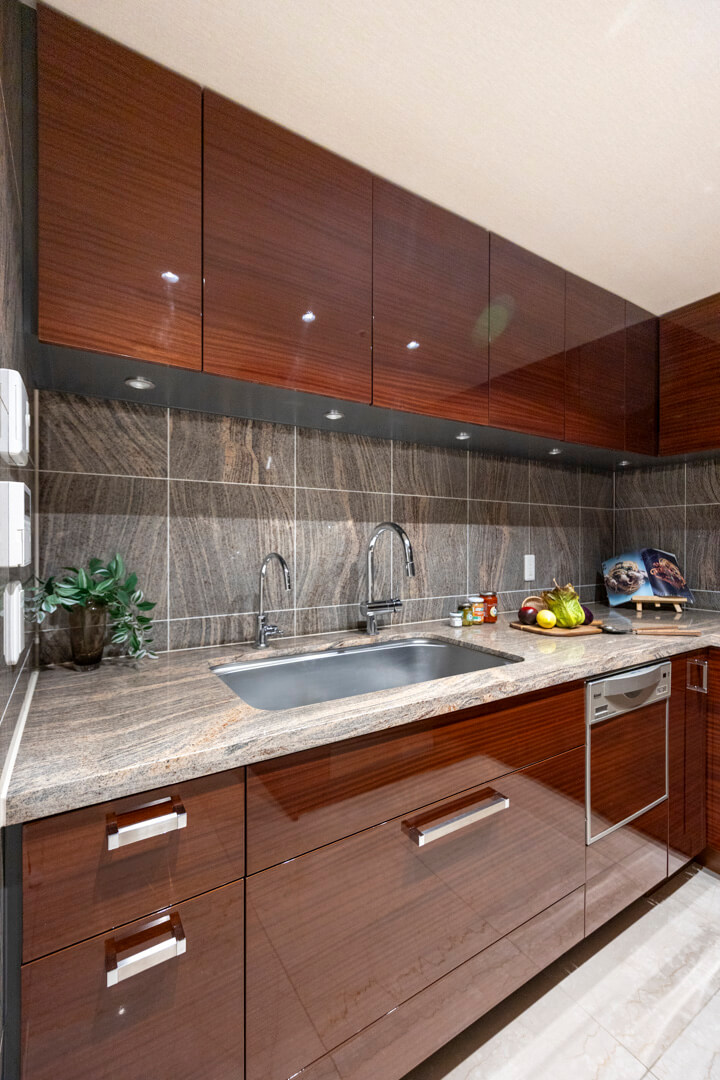 約4.9帖のキッチンスペース。リビングダイニングと空間分けされており、キッチンまわりの生活感をさりげなく目隠しできます。天然石調と深みのあるウッド調で重厚感と上質なデザイン。コの字型で作業スペースも広々使えます。ディスポーザー、食洗機、浄水器、3口ガスコンロ、オーブンレンジ付きで設備も充実しています。