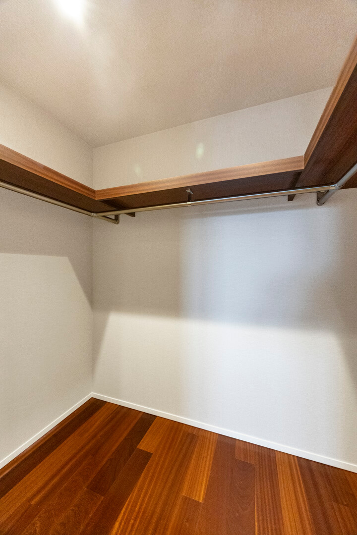 約1.9帖のWIC(ウォークインクローゼット)を完備。3方向にハンガーパイプが設置されていて、洋服をたっぷりと掛けることができます。