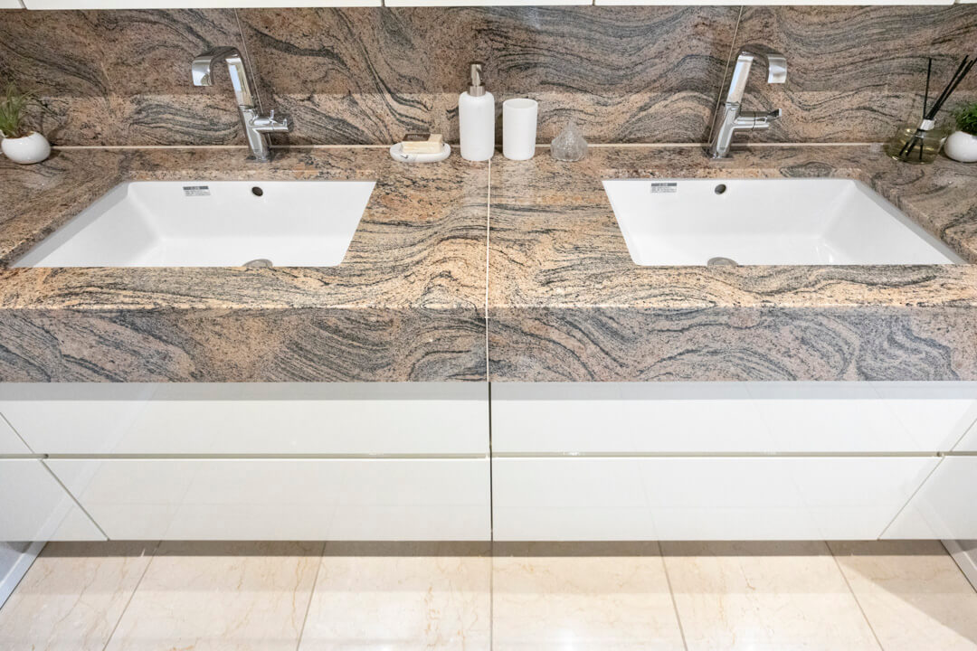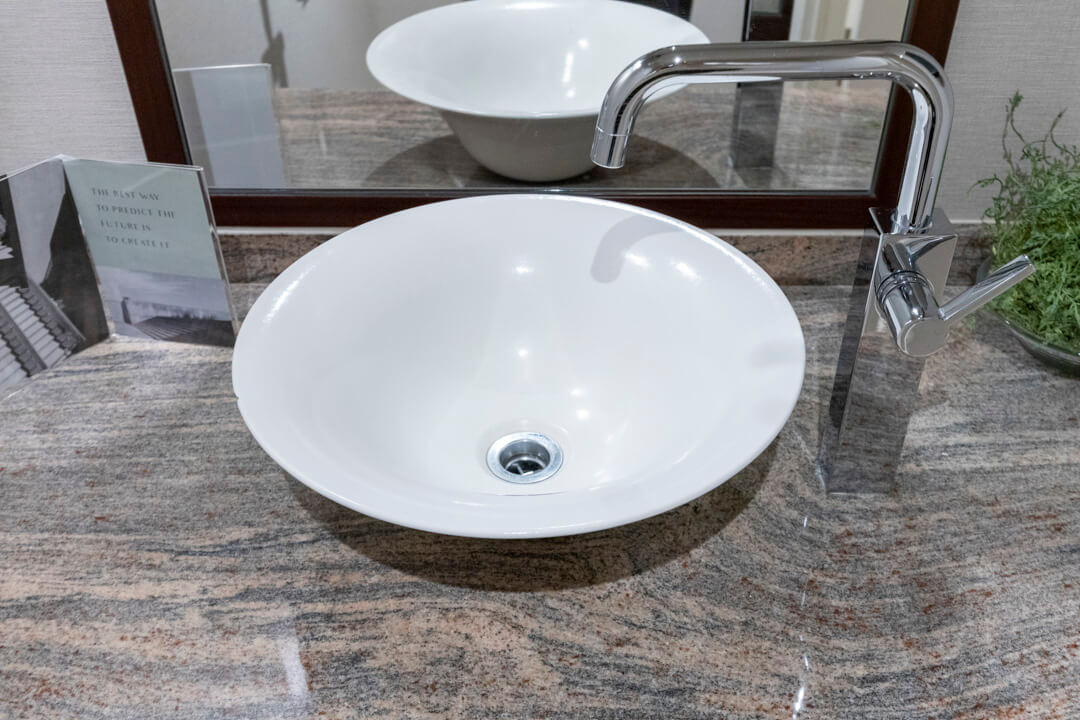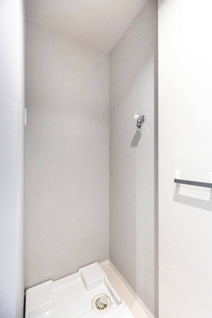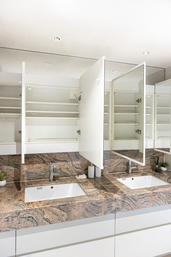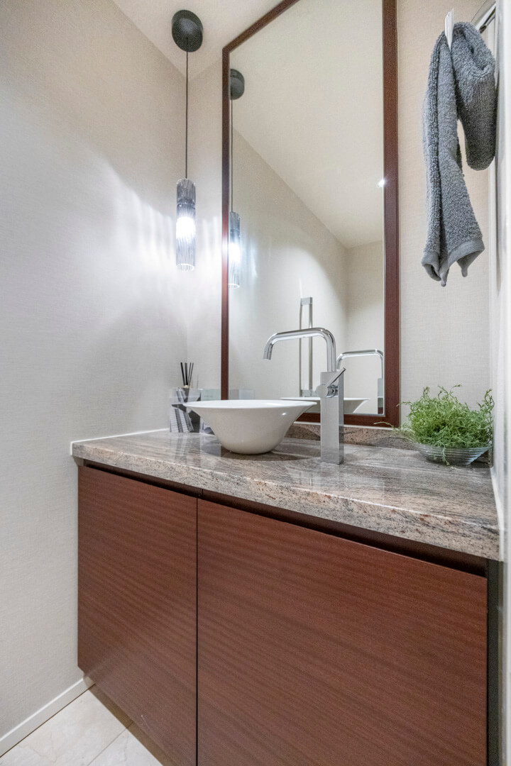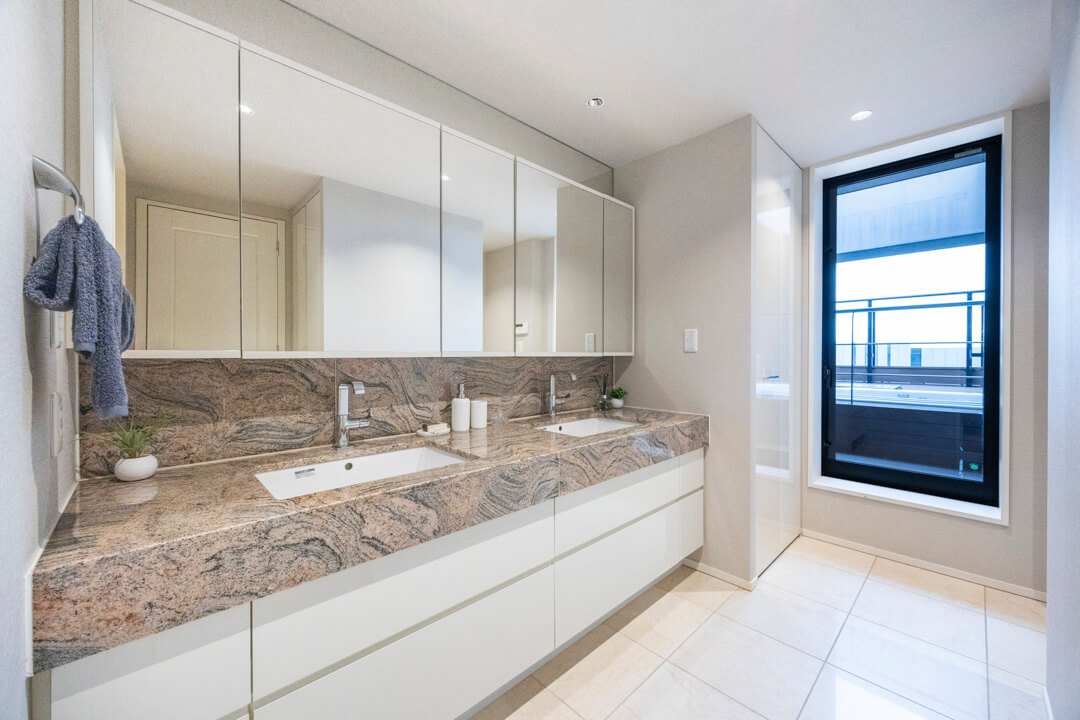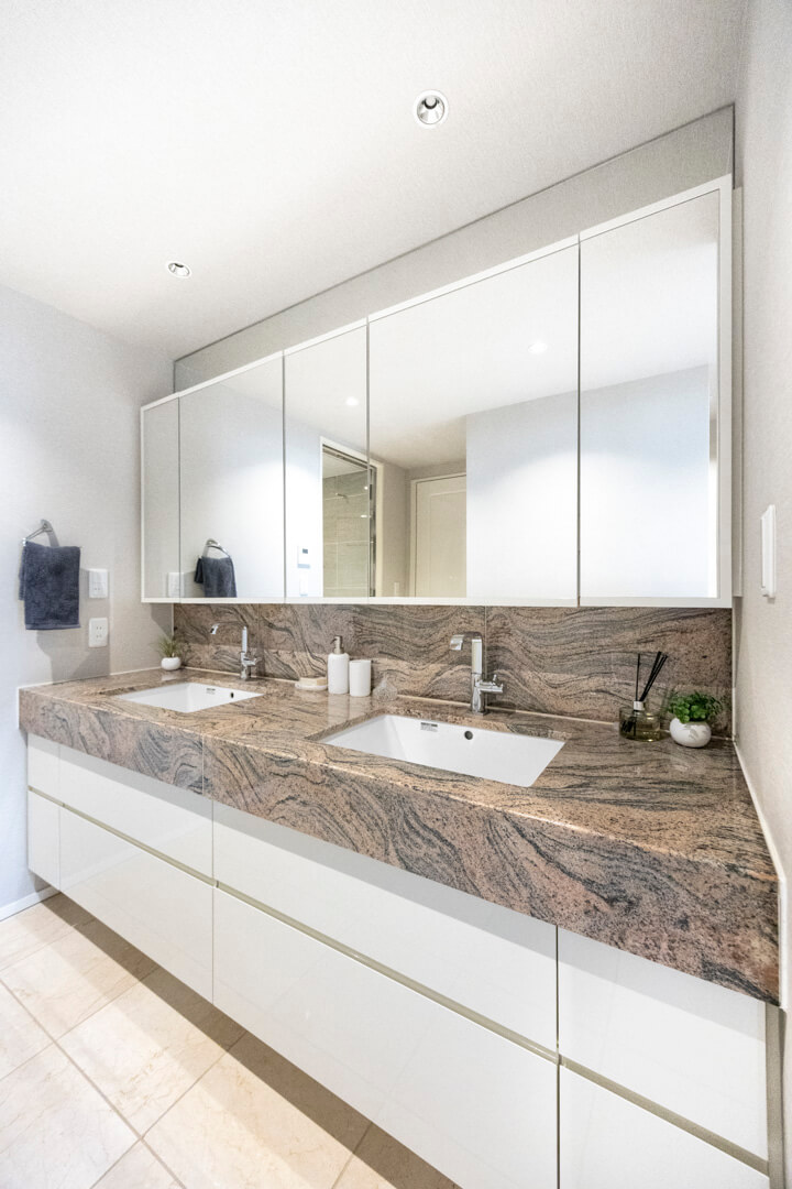 39階部に位置する洗面室。ホテルライクな2ボウルの洗面化粧台で、家族で使用時間が重なってもそれぞれゆっくり使えます。キッチン同様、天然石調のカウンターで、重厚感と上質な雰囲気。洗面まわりの小物がすっきり整頓できるミラーボックス、モノの出し入れがしやすい引き出し式のキャビネット付きで使い勝手の良さもポイントです。また、洗濯機置き場は扉付きで目隠し可能。生活感のないすっきりとした印象を保てます。その他に、リネン庫も設置されていて収納スペースも充実しています。