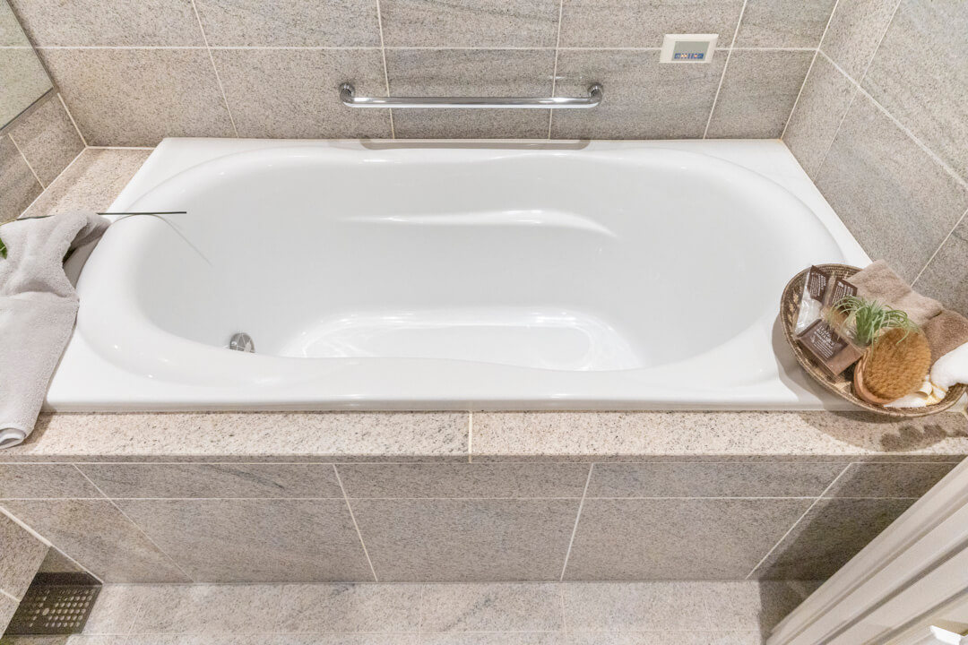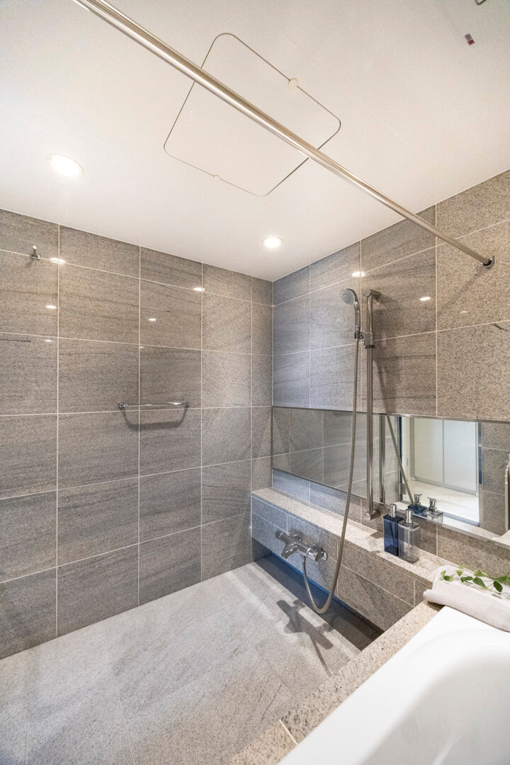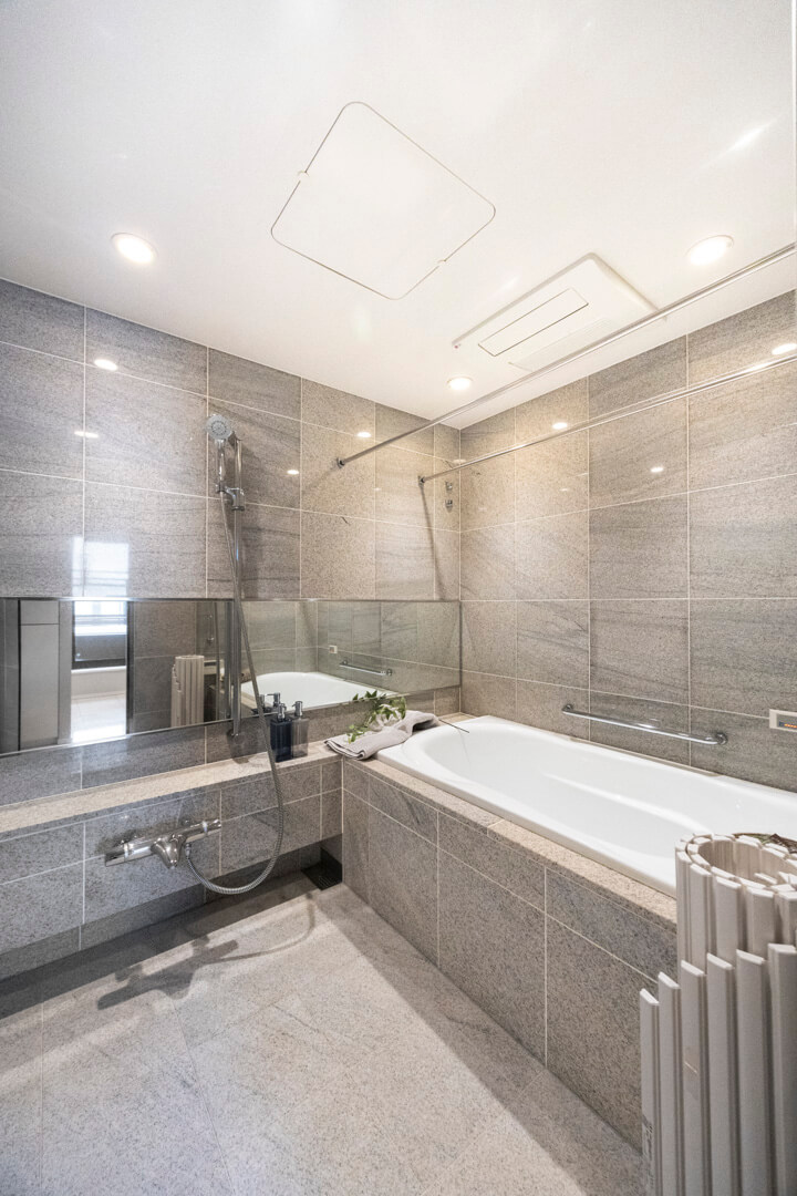 天然石調のタイル貼りで、高級感のある雰囲気のバスルーム。追い炊き機能の他、浴室換気乾燥機とランドリーパイプ2本付きで雨の日や冬場の洗濯にも困りません。