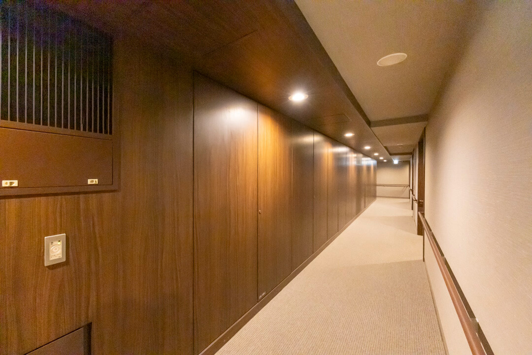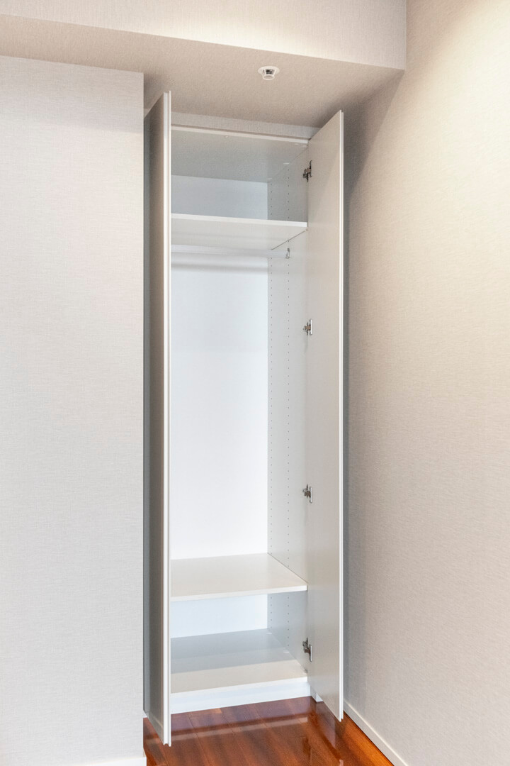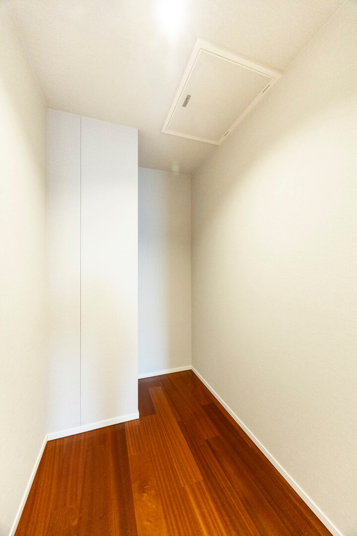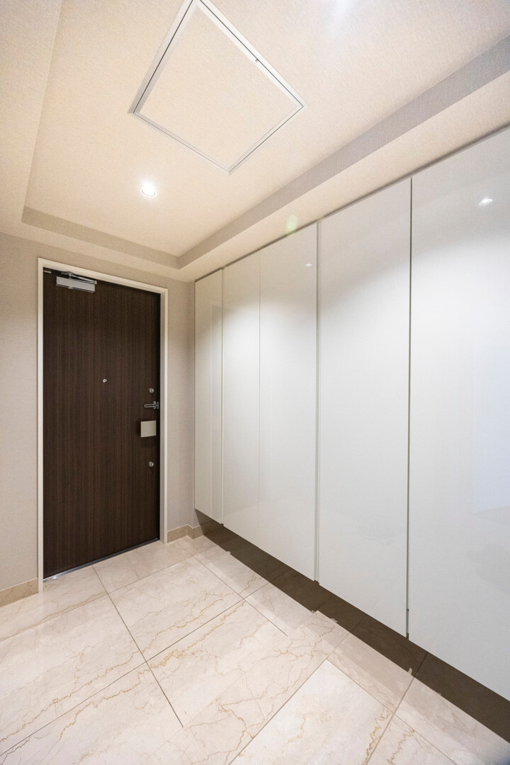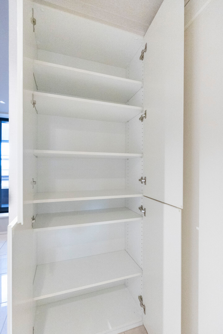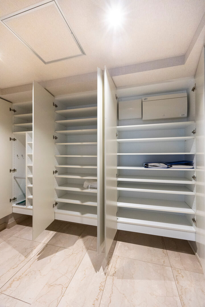 38階部に位置する玄関ホール。天井まで高さのあるシューズボックスがずらりと並んでおり、靴がたっぷりと収納可能。傘を収納できるスペースも確保されています。また、階段を上がって39階部の正面には、約1.6帖の収納スペースを完備。場所を取りやすい季節物の家電やスポーツ用品などの整頓に便利です。