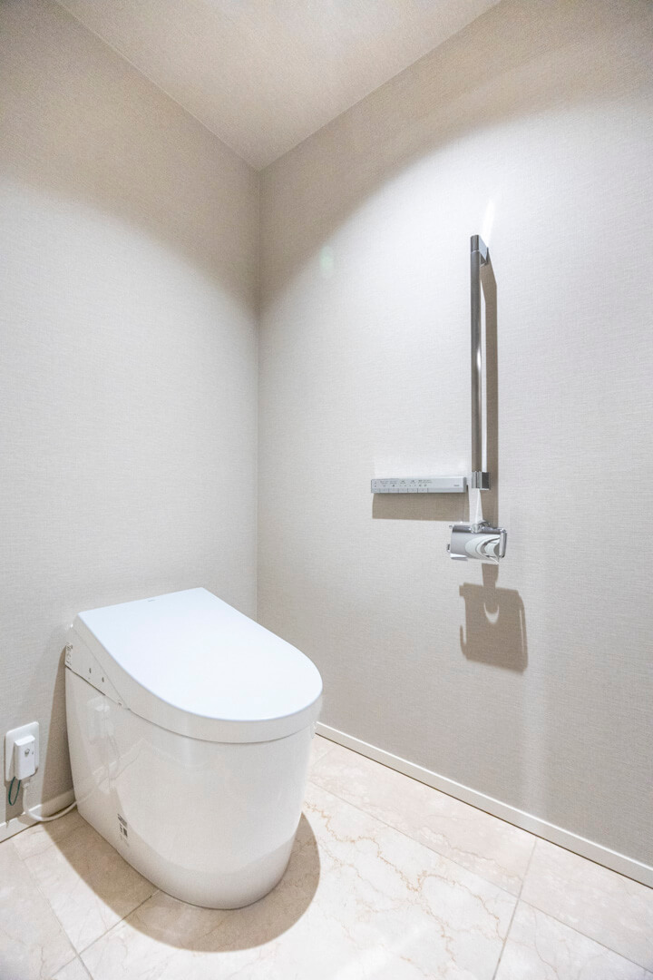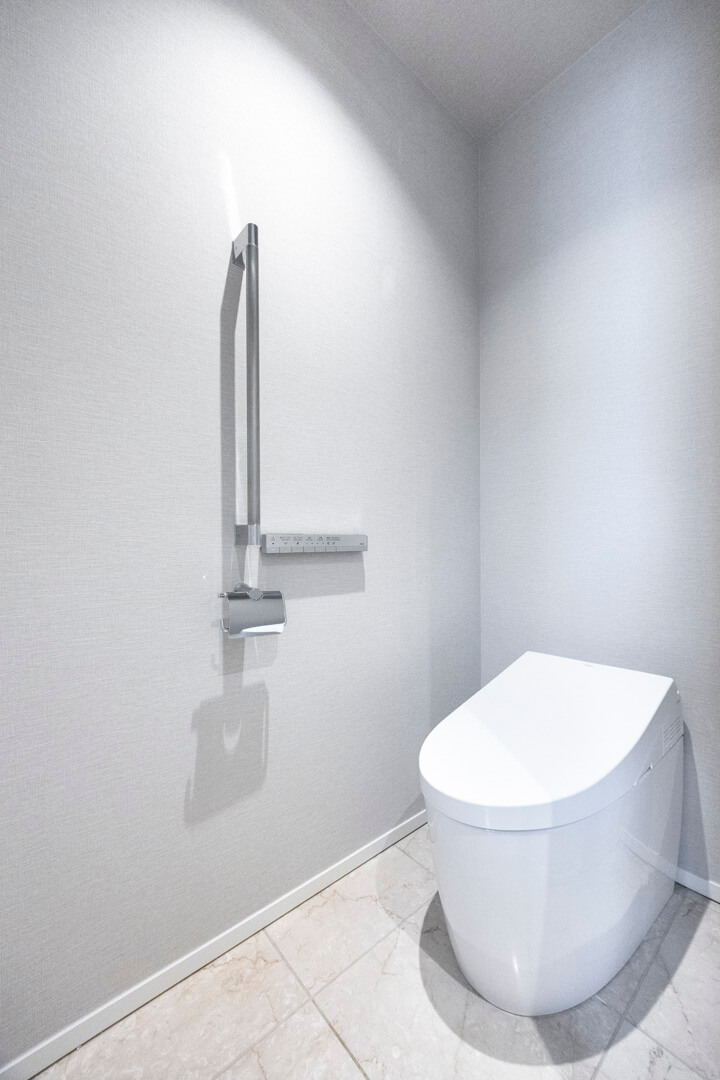 トイレは洗面室(39階)と廊下(38階)の各階に設置されています。どちらも空間がすっきり見えるタンクレストイレで、ウォシュレットリモコンもスティック型でスタイリッシュです。また、廊下のトイレには独立型の手洗いカウンターも備わっています。