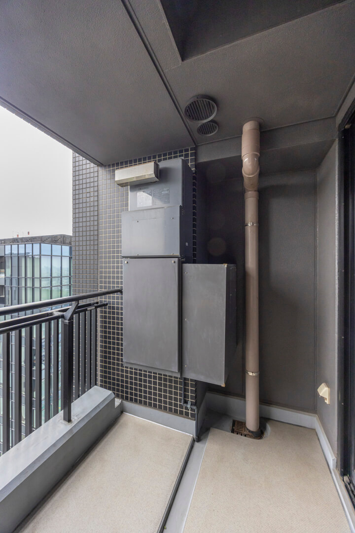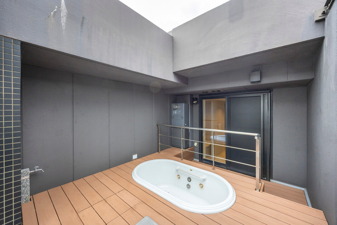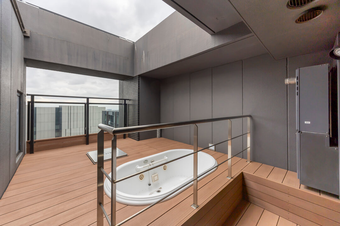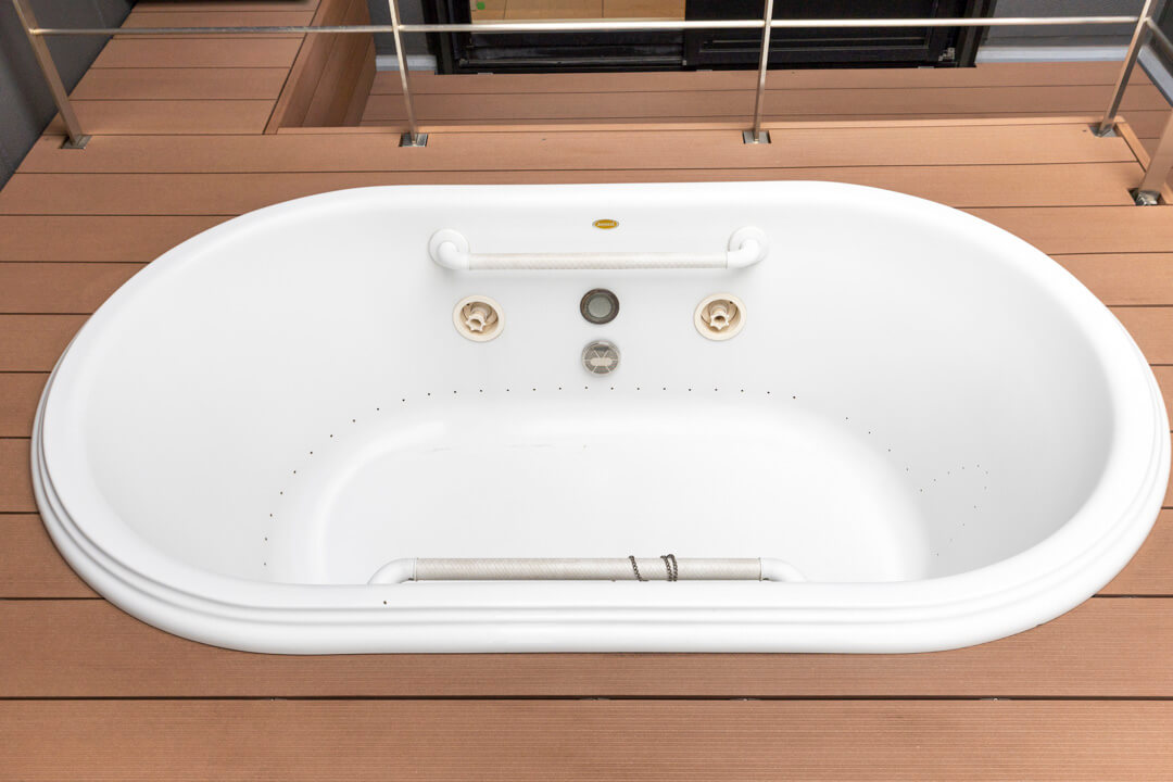 洗面室の勝手口へ出ると約14.26㎡のゆとりあるルーフバルコニーがあります。ジャグジーが設置されていて、青い空を眺めながら入浴を楽しめます。バルコニーチェアやテーブル、観賞植物なども置ける広さ。ホテルライクな空間づくりも楽しめそうですね。