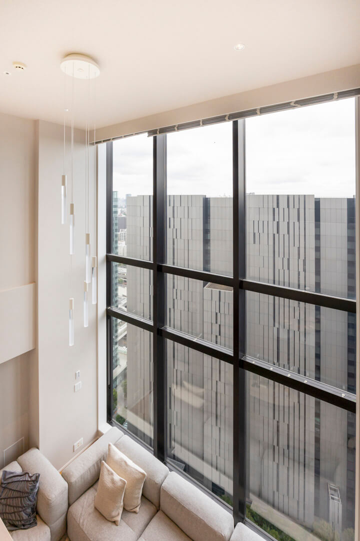39階部には主寝室があります。約11.5帖のゆとりある広さ。窓は38階部の吹き抜け部分に面した室内窓になっておりカーテンいらず。こちらのお部屋からも開放的な景色が望めます。リビングにいる家族の存在を感じられますね。