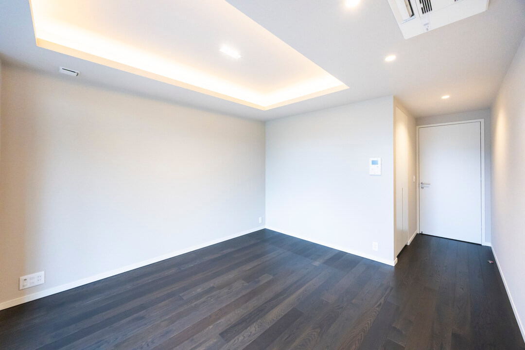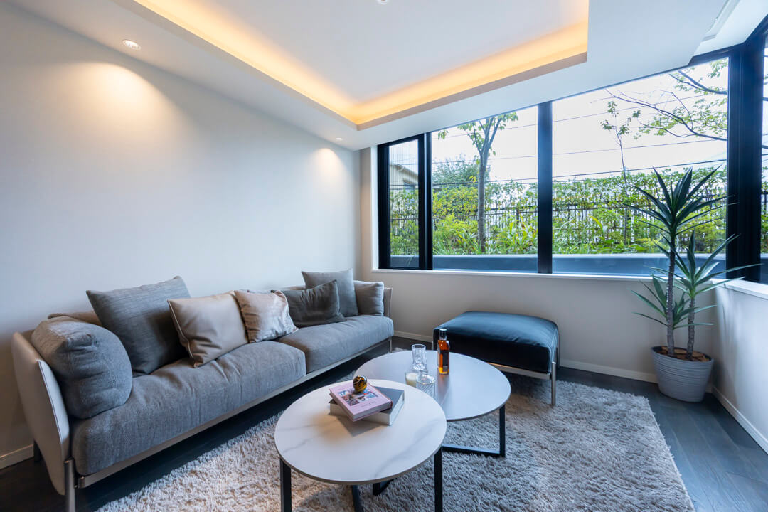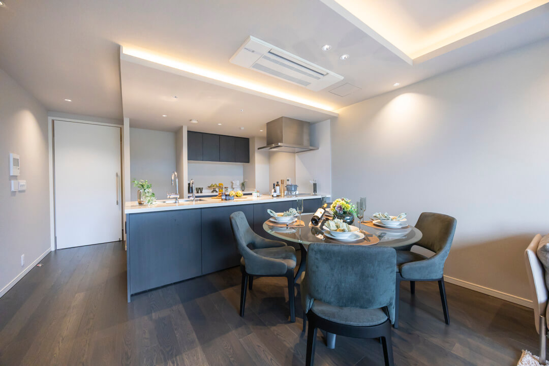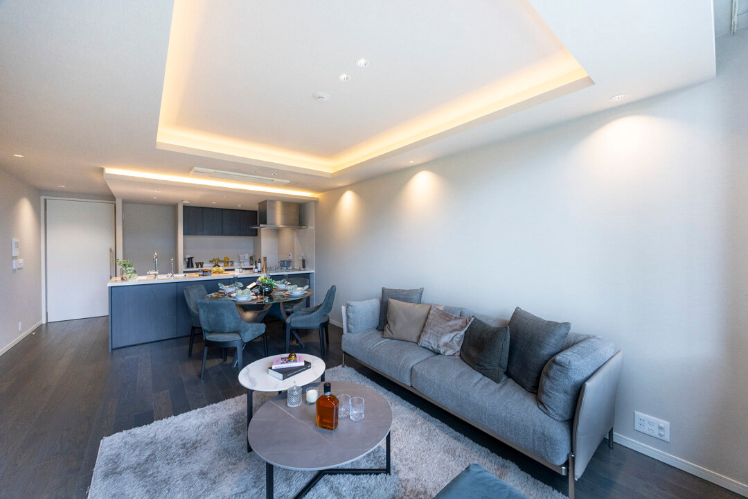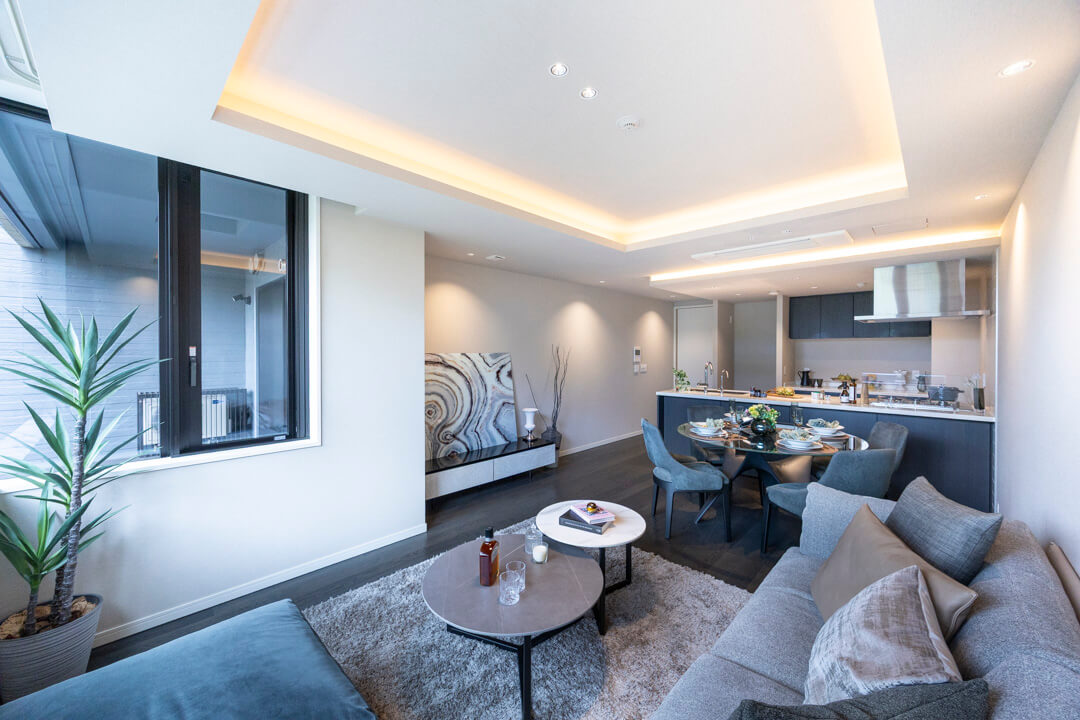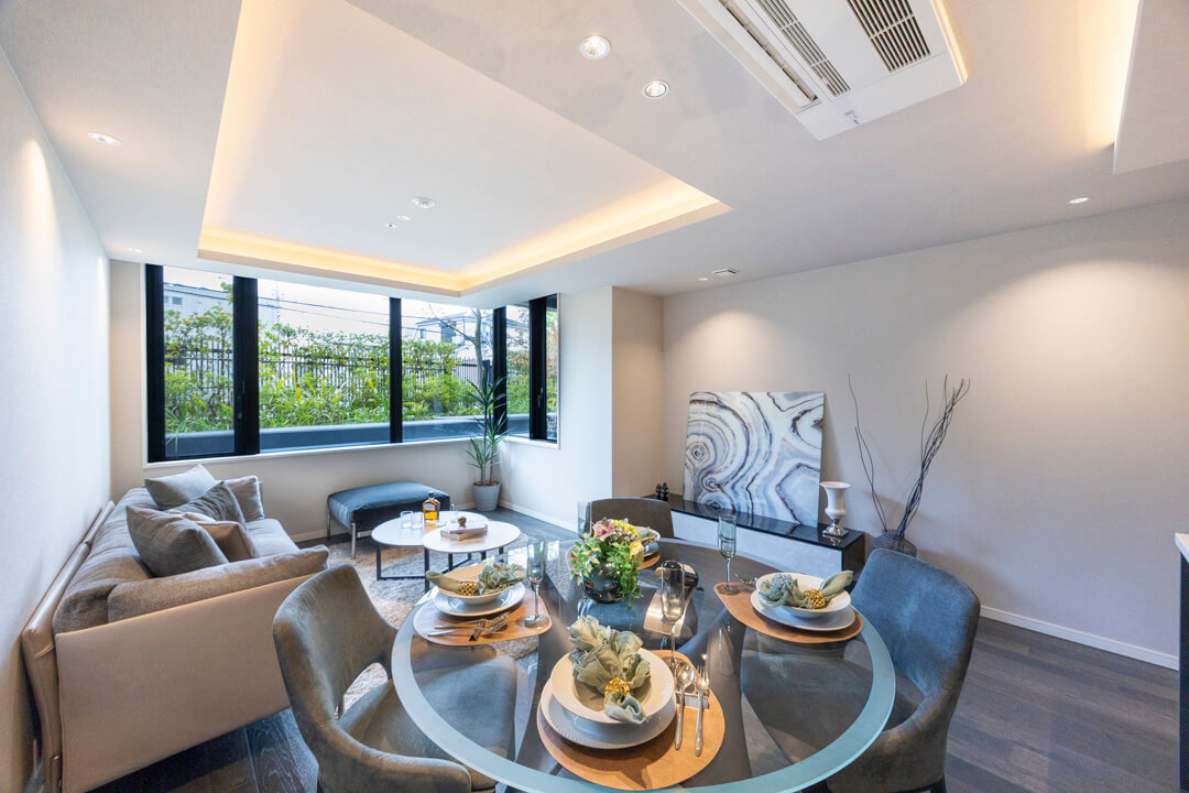 約19.6帖の広々としたLDK。窓から木々の緑を望む、洗練された空間です。エアコンにはすっきりとした見た目のビルトインタイプを採用。折り上げ天井には間接照明が施され、落ち着く空間を演出します。柔らかな明かりがリラックスタイムへ誘ってくれそうですね。
