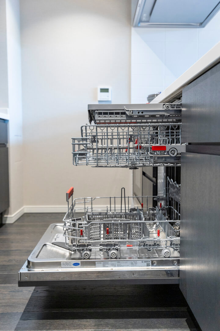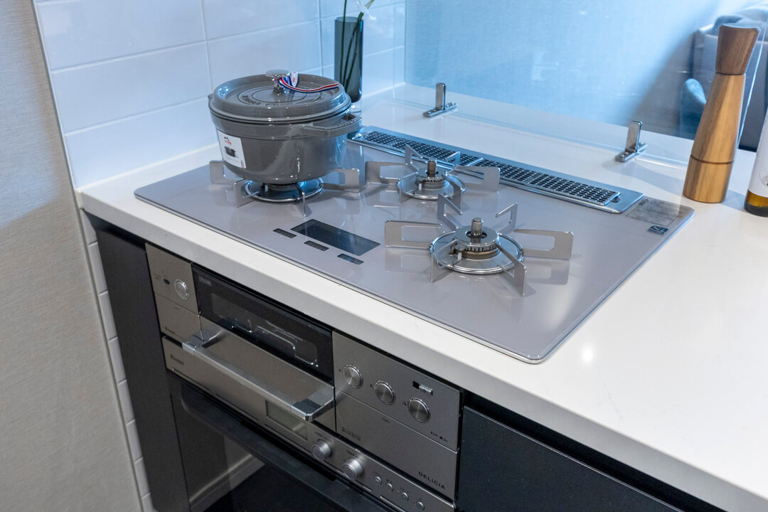 グリル付3口ガスコンロやオーブン、BOSCH製の大容量食洗機を完備しています。作業が捗り、料理のレパートリーも増えそうですね。さらに、シンクにはディスポーザーを内蔵。掃除の手間が軽減され、悪臭の原因を防いでくれます。