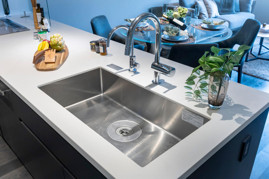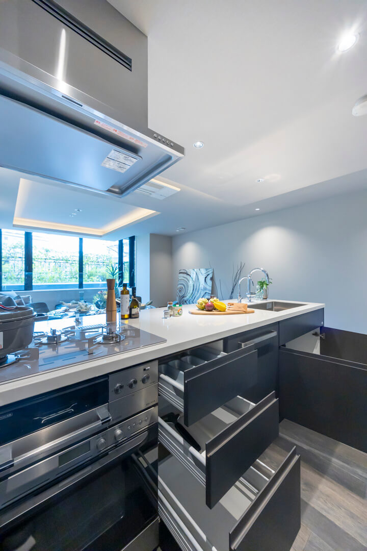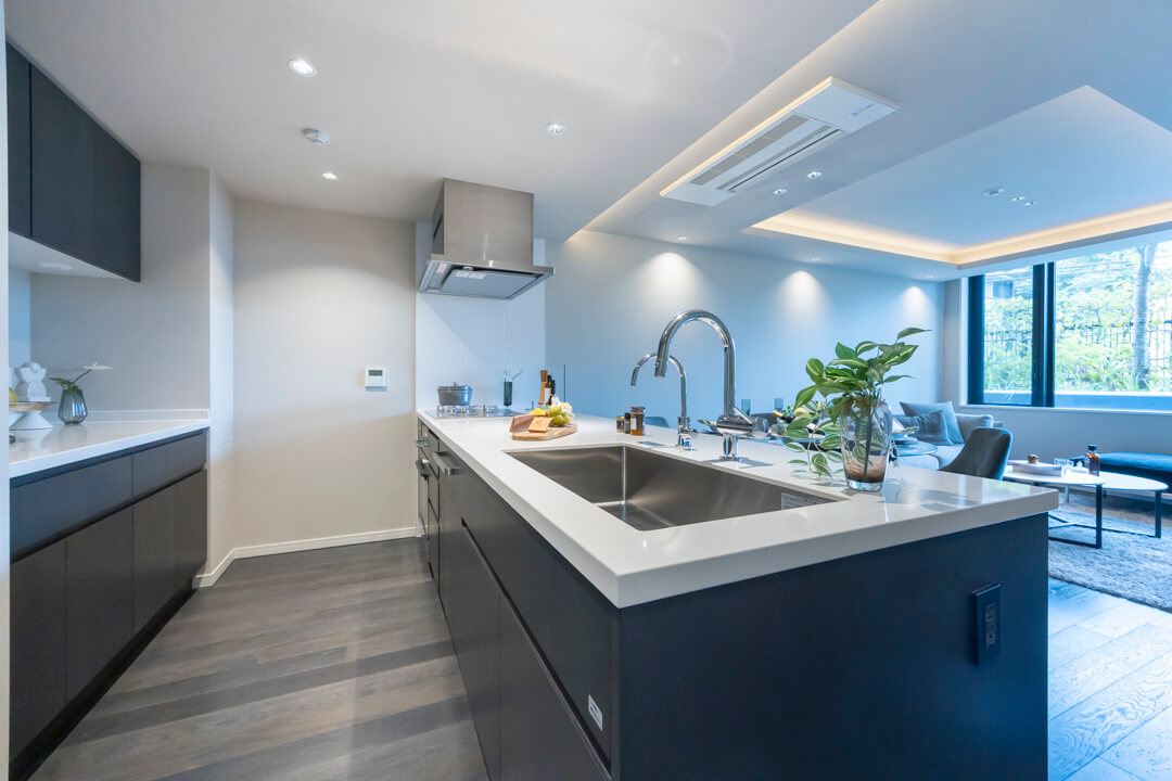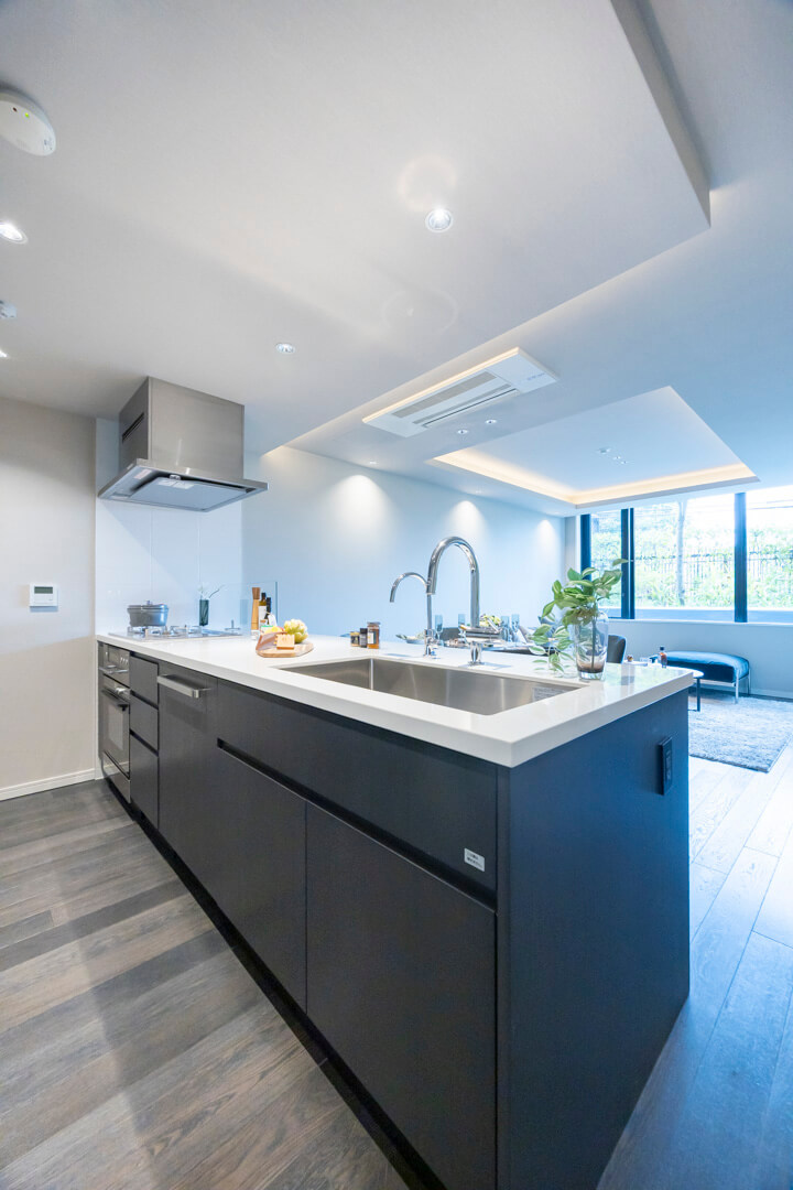 白と黒のコントラストが美しく、スタイリッシュなキッチン。リビングダイニングを見渡せる人気の対面タイプです。開放的な気分で調理ができ、家族のコミュニケーションも増えそう。楽しいキッチン時間になりますね。