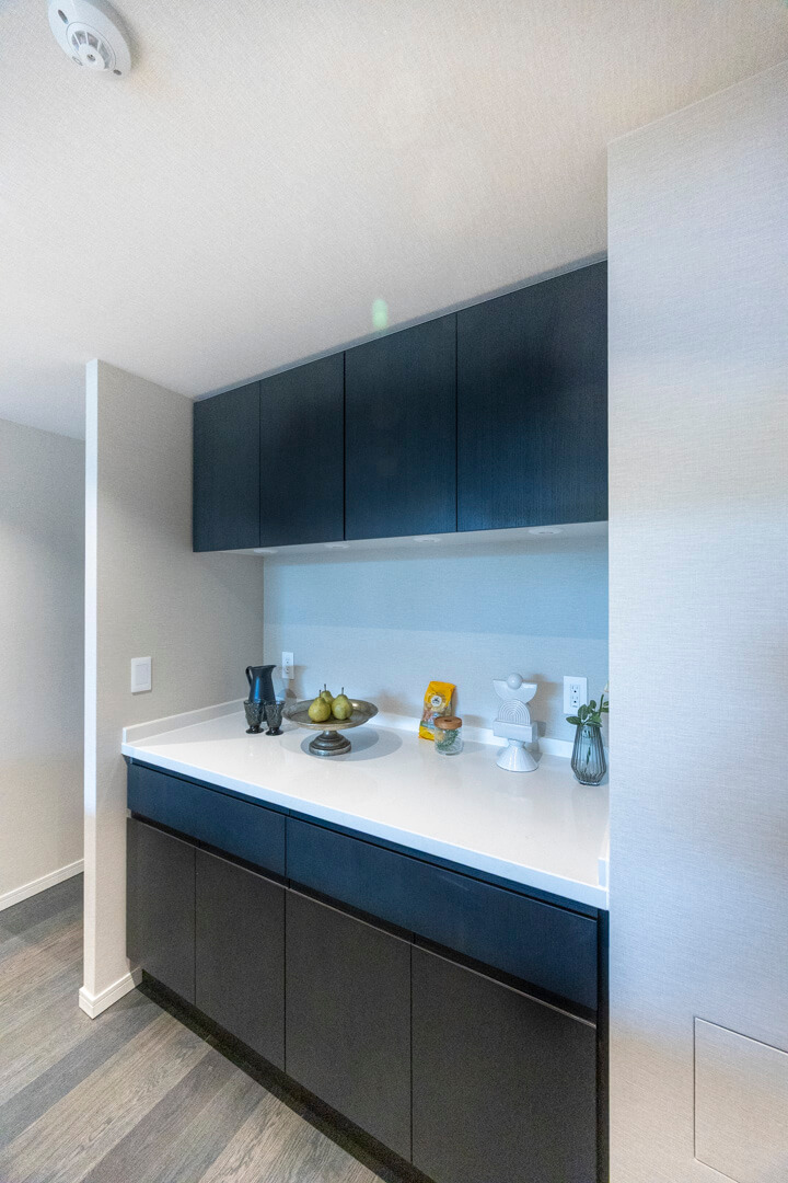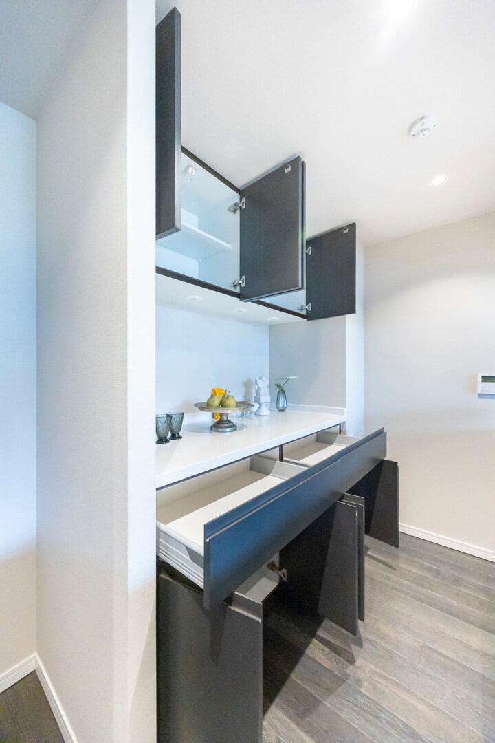 背面には収納力のあるカップボードを完備。キッチンと同じデザインで統一感があります。食料品のストックや食器類を整理整頓でき、ごちゃごちゃしがちなキッチンまわりがすっきり片付きそうですね。カウンターにはコンセントが付いているので、炊飯器やコーヒーメーカーといったキッチン家電の使用にも便利です。
