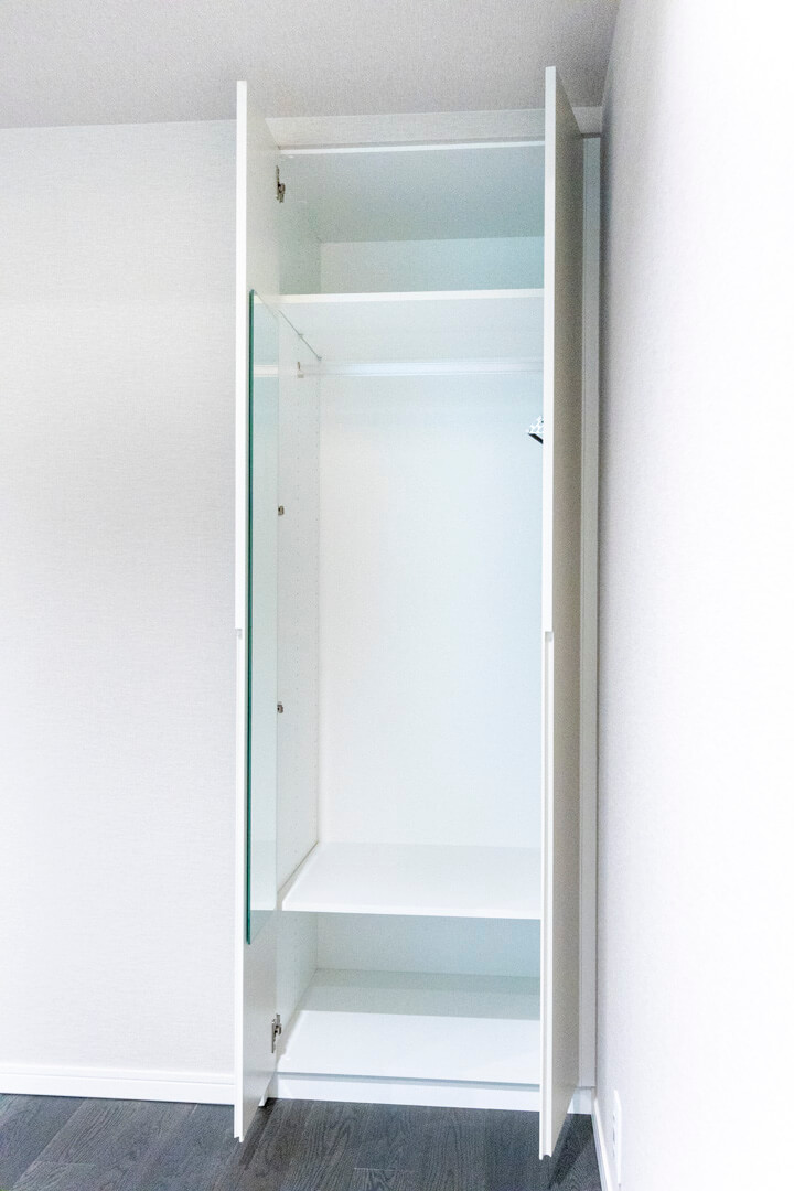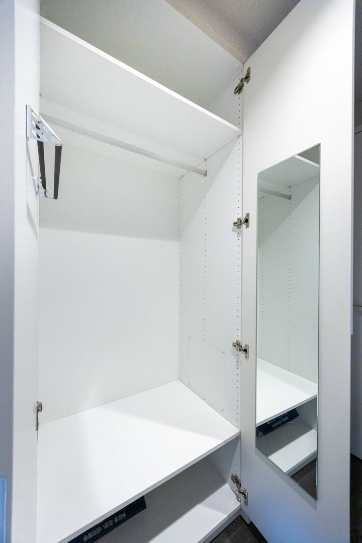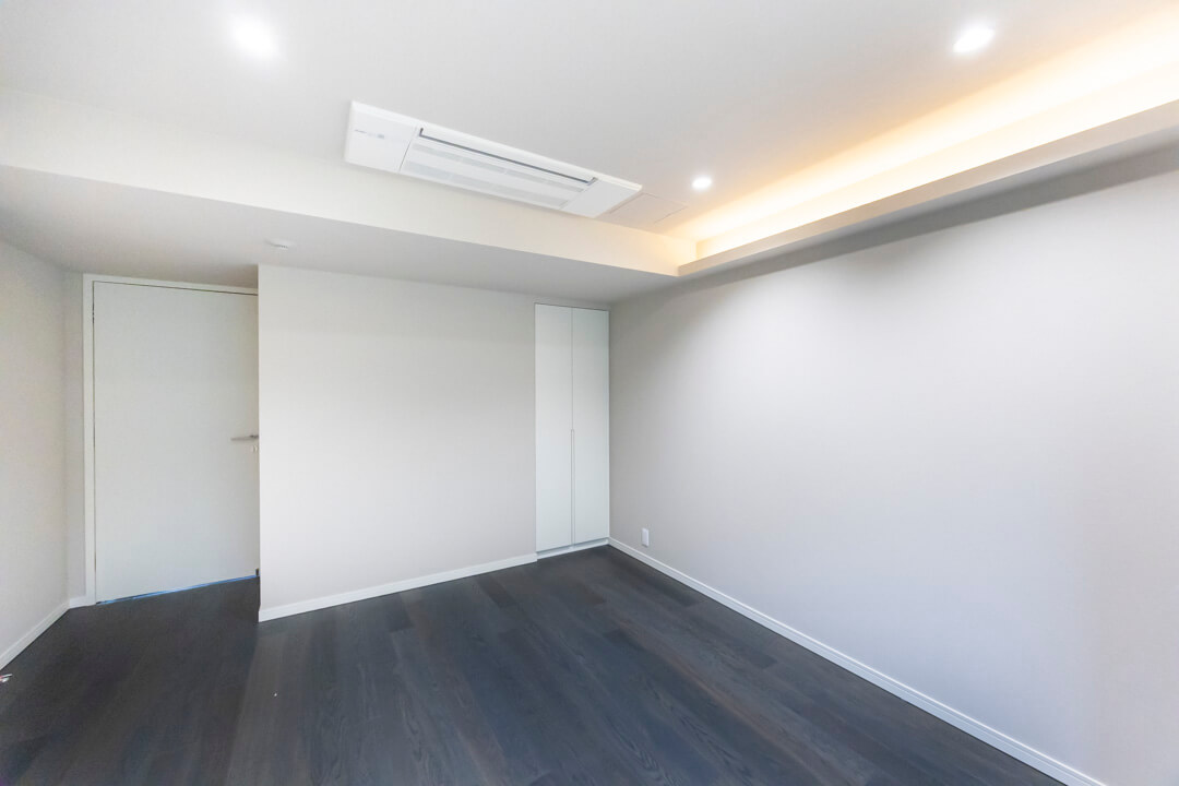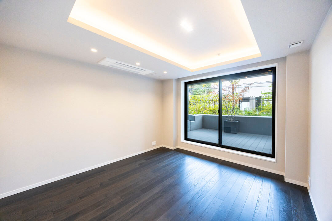 約10.3帖の主寝室。テラス付きの開放的な空間です。東向きの大きな窓から朝日が差し込み、爽やかな朝を迎えられそう。間接照明のやわらかな明かりが落ち着いた雰囲気を演出します。クローゼットは棚板&ハンガーパイプの高さを調節でき、使い勝手良好◎。扉裏に鏡が付いているのも嬉しいポイントです。