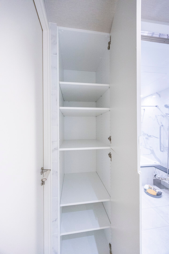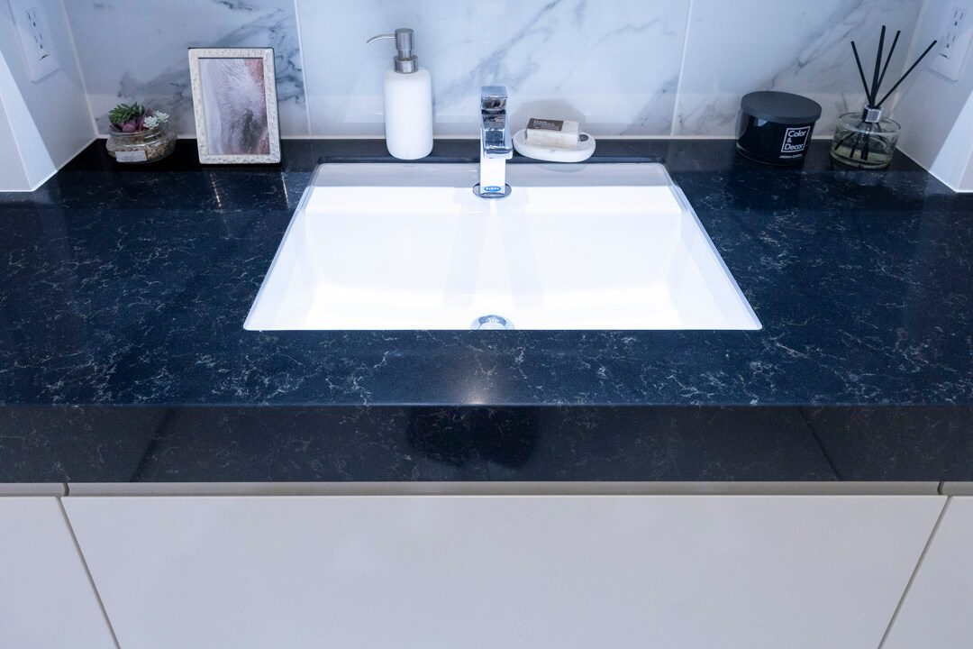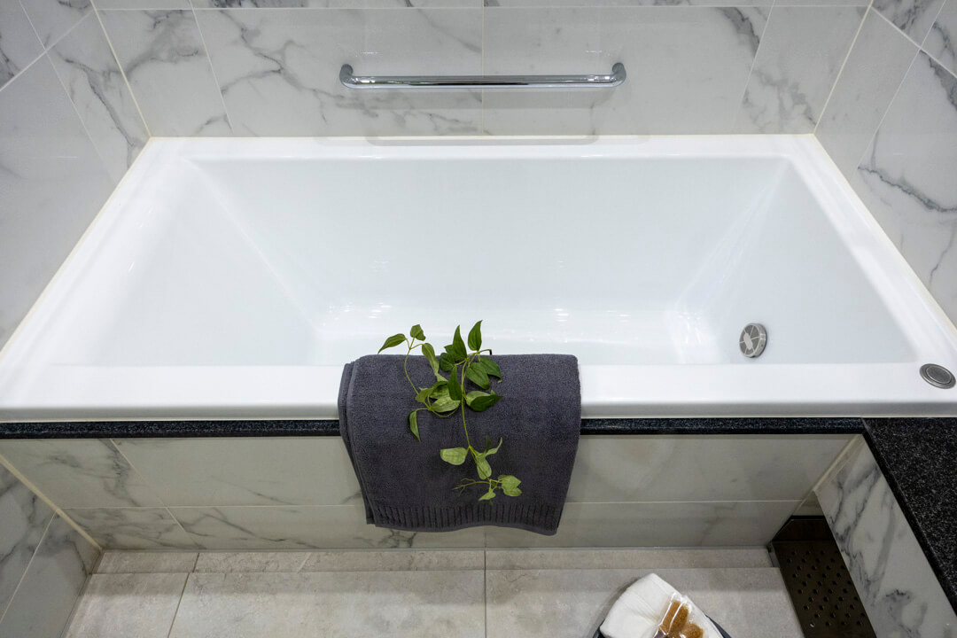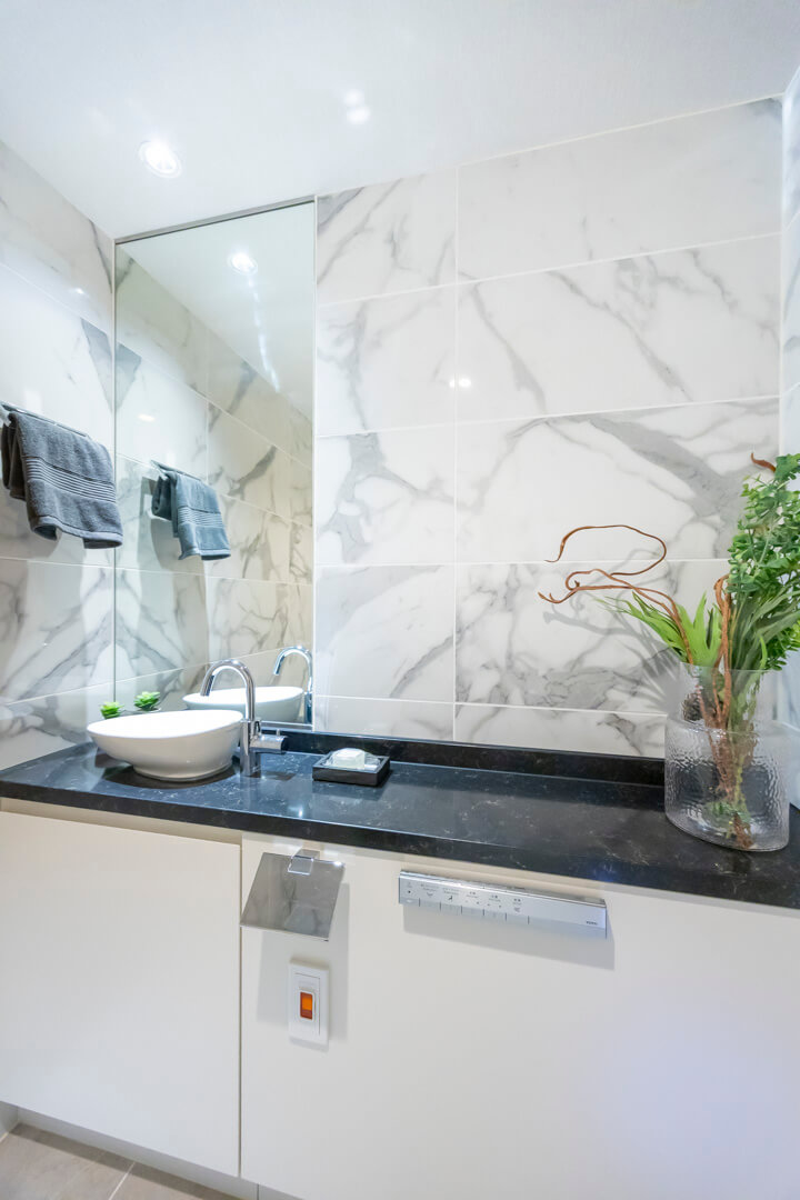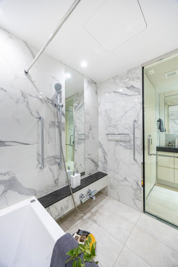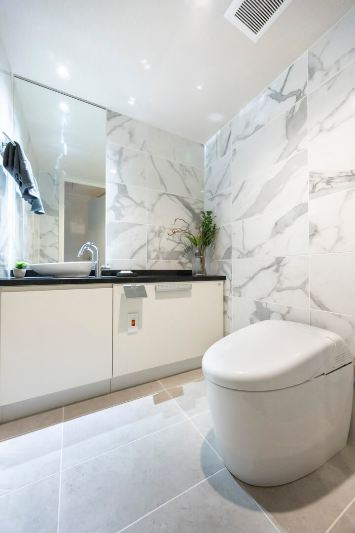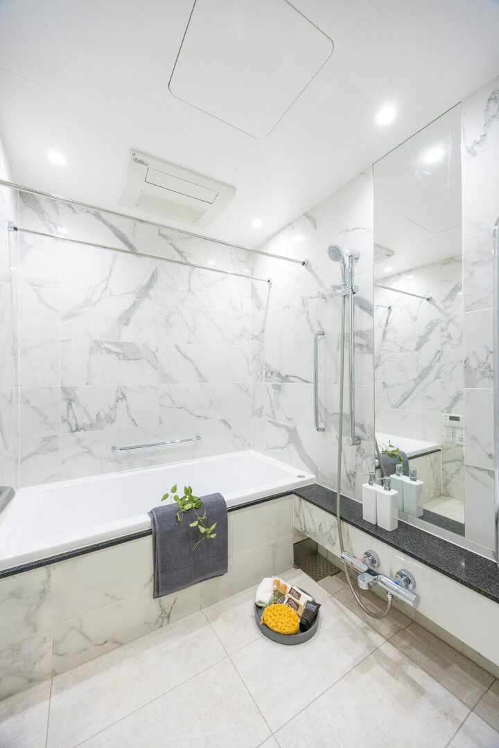 大理石デザインでラグジュアリーな雰囲気のバスルーム。換気・暖房・乾燥・涼風機能付きで1年中快適なバスタイムを過ごせます。追い焚き機能も付いているので、家族の入浴時間がずれてしまった時、半身浴をしたい時に助かります。