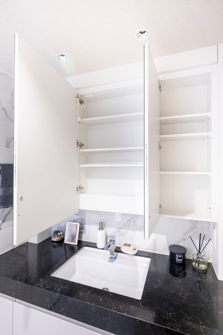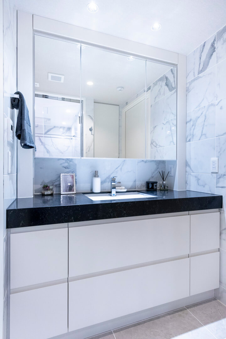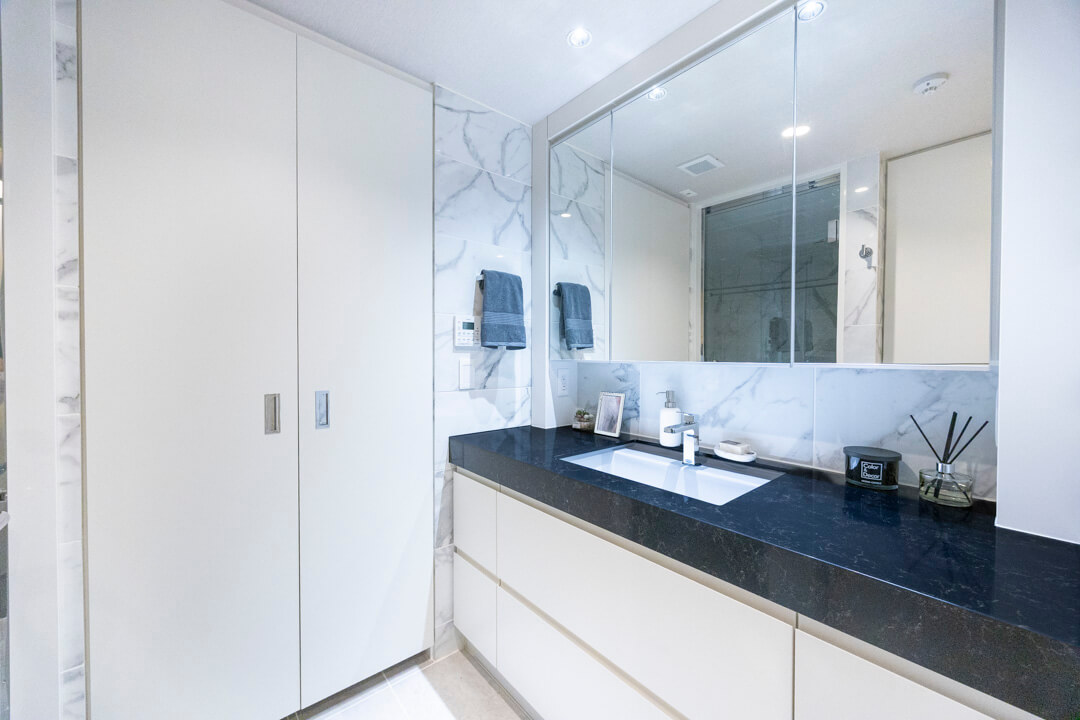 廊下の突き当たりにある洗面室。高級感の漂う洗面化粧台が設置されています。大きな三面鏡&広々カウンター付きで使い勝手◎。化粧品やドライヤーの仮置きができて便利ですね。洗面まわりの小物はミラーボックスに収納可能。リネン庫も設置されていて、いつも清潔な洗面室をキープできそうです。