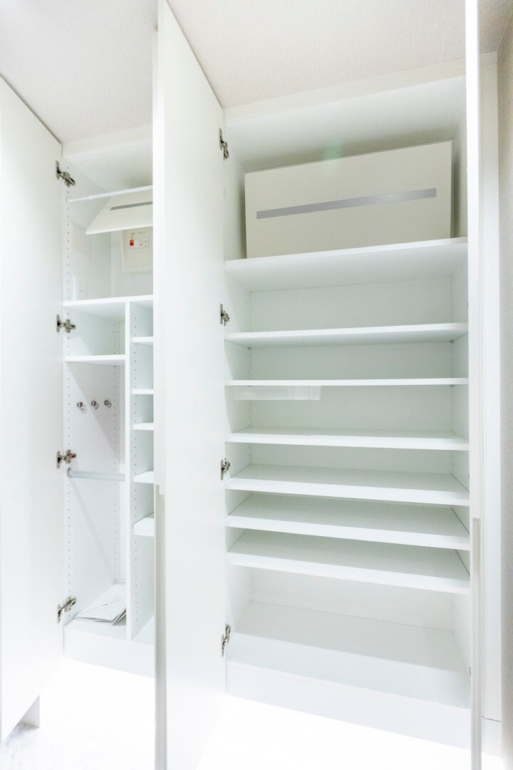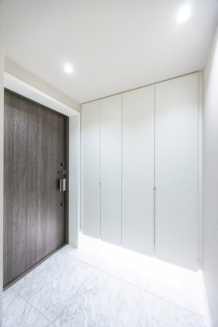 フットライトが幻想的な雰囲気を醸し出す玄関。大容量のシューズボックスが並び、散らかりがちな靴をすっきり収納できます。