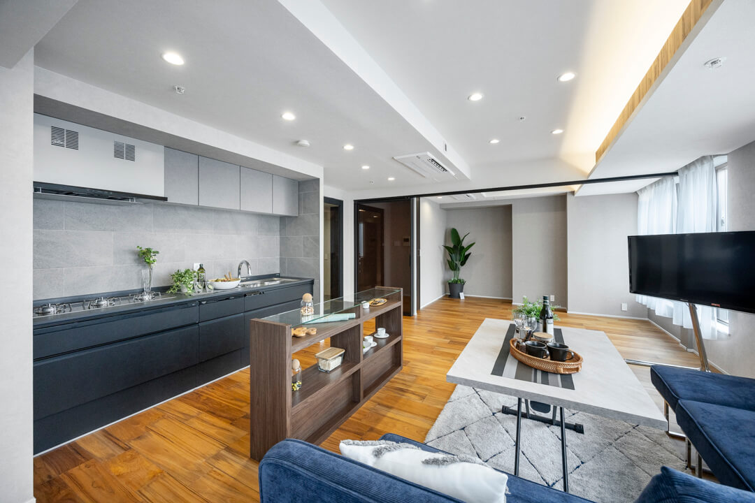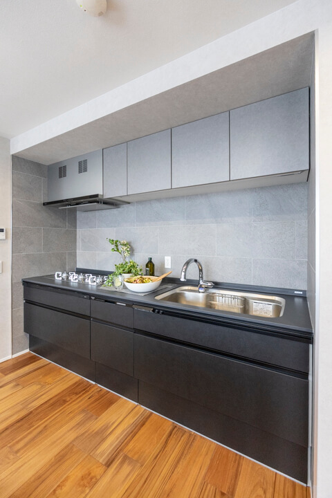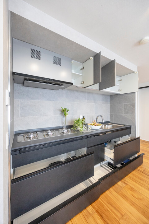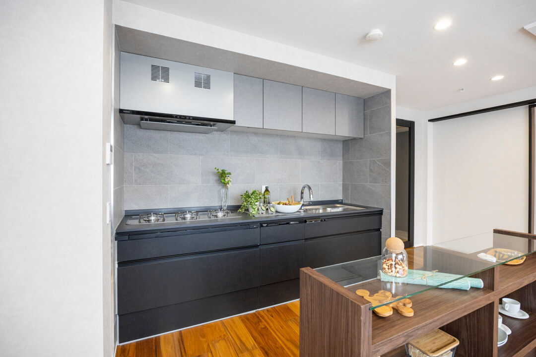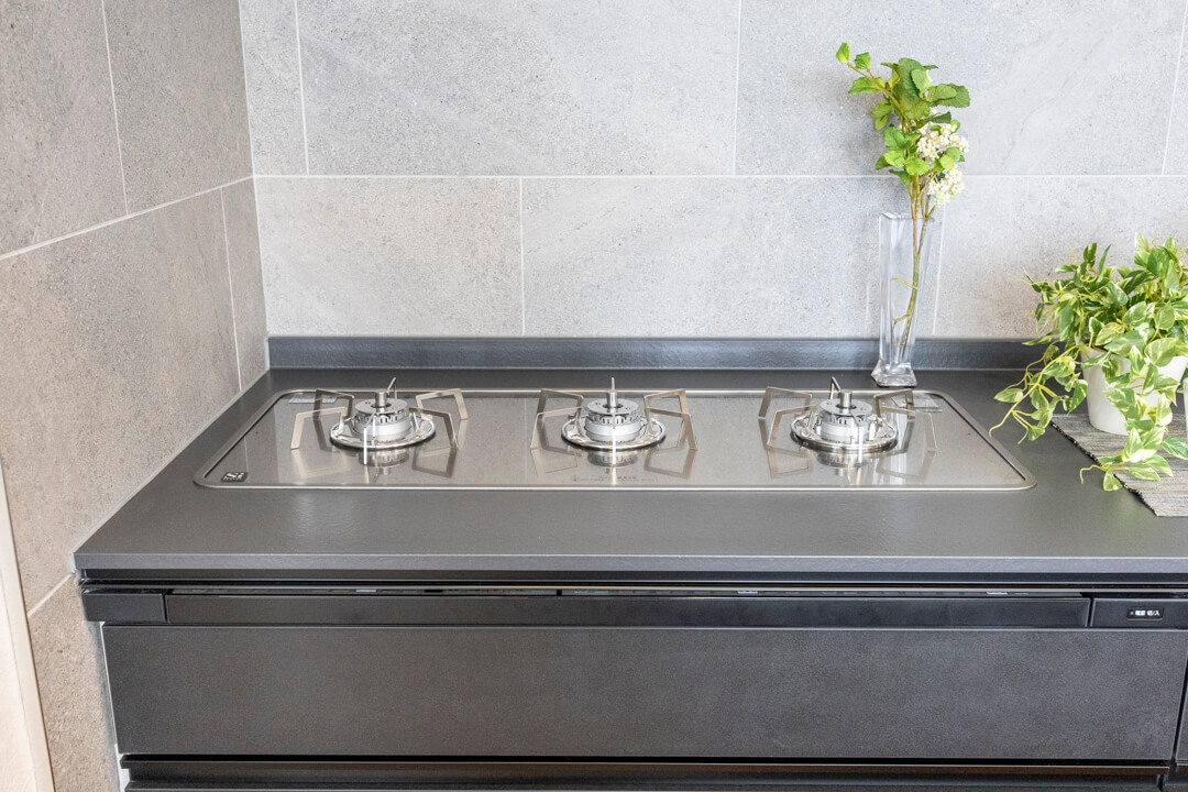 調理に集中しやすい壁付けキッチン。シックなデザインが空間のアクセントになっています。コンロは3つの鍋を横並びにしてゆったり使えるトリプルワイドタイプ。フライパンの持ち手が飛び出ず、引っかかってしまうことがないので安全です。手前のスペースが広く、盛り付けがしやすいのもポイントです。