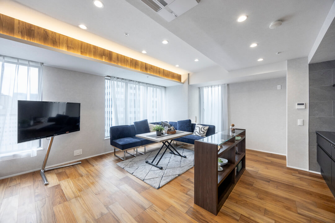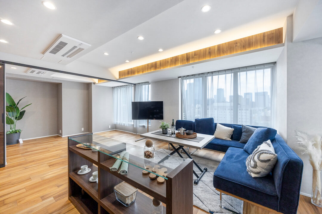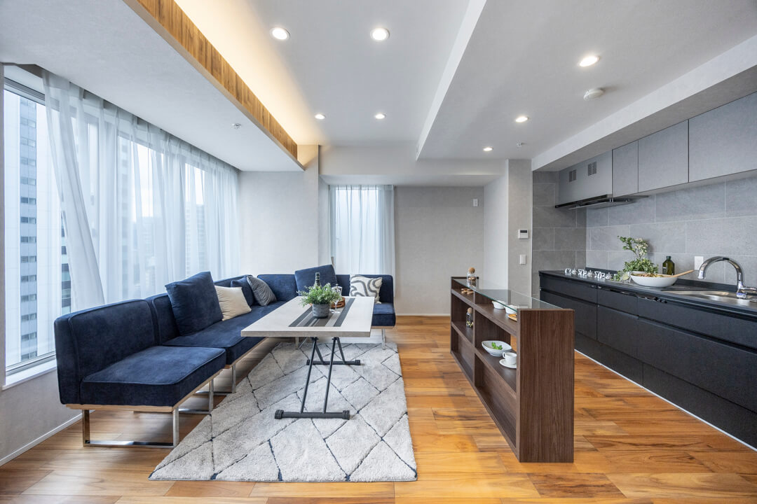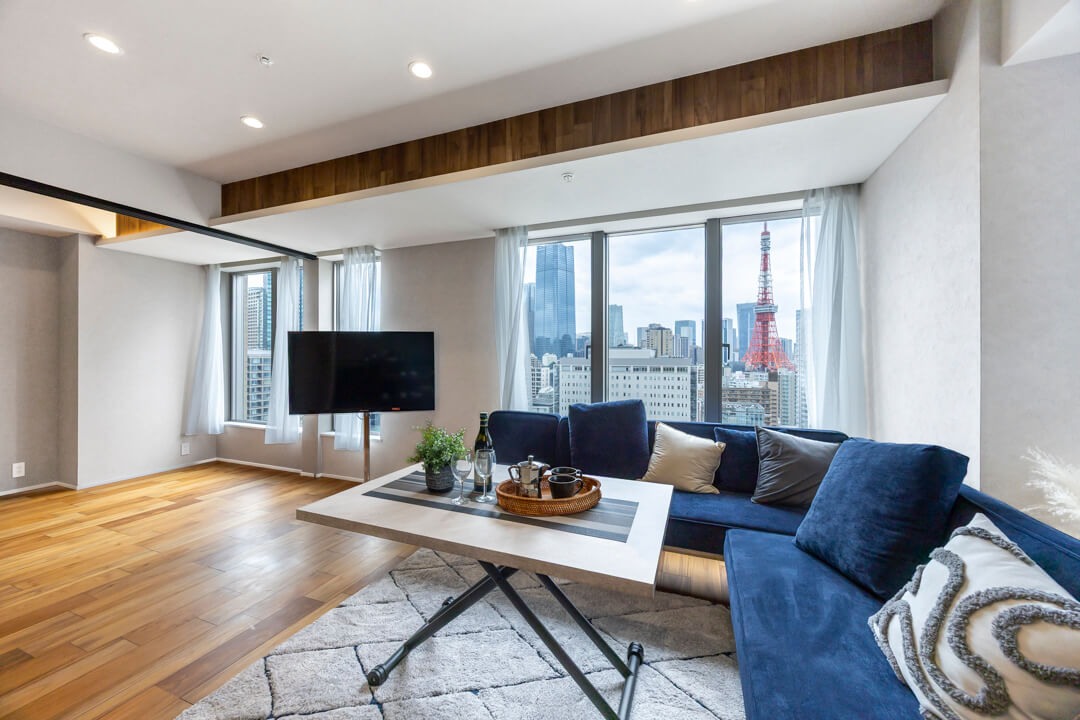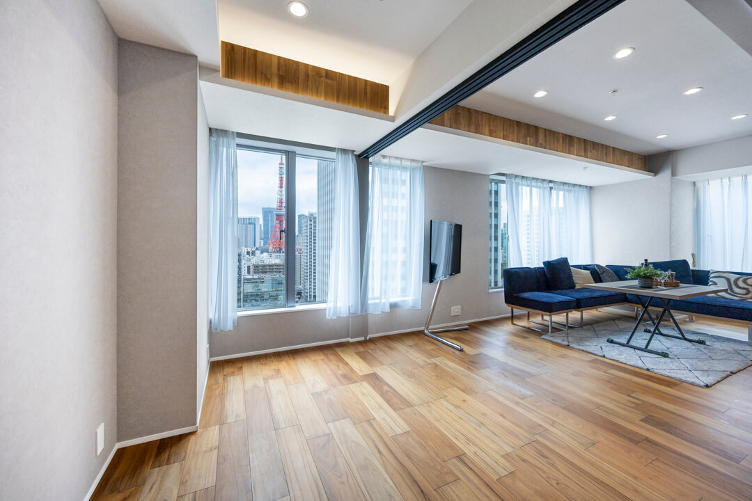 約16.0帖のLDK。2面採光で明るく風通しの良い空間です。北側の窓からは東京タワーを望むことができますよ。ライトアップを楽しみながら、リラックスタイムを過ごせそうですね。