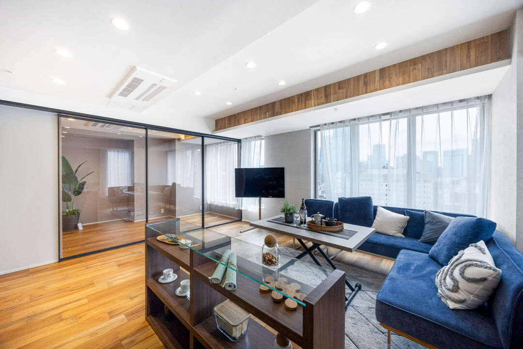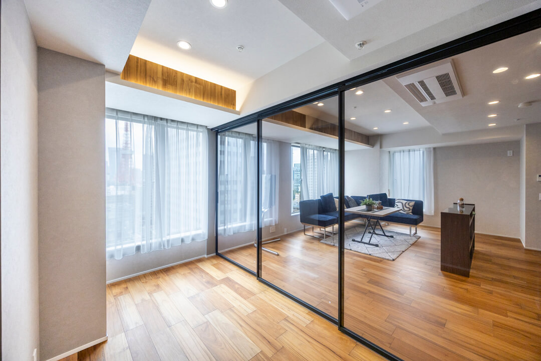LDKに隣接する約5.0帖の寝室2。ブラックフレームのスライドドアでスタイリッシュな印象です。扉を開放して拡張リビングにしたり、閉めてワークスペースにしたり。シーンに合わせてフレキシブルに活用できる空間です。こちらのお部屋からも東京タワーが見えます。