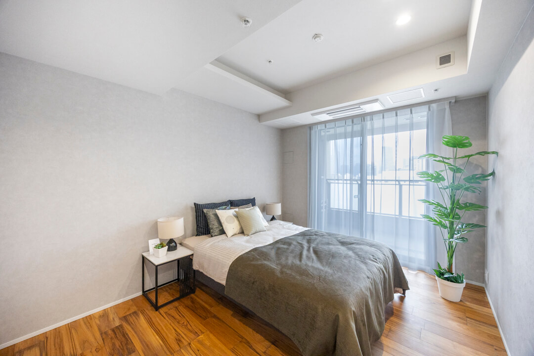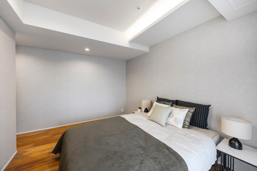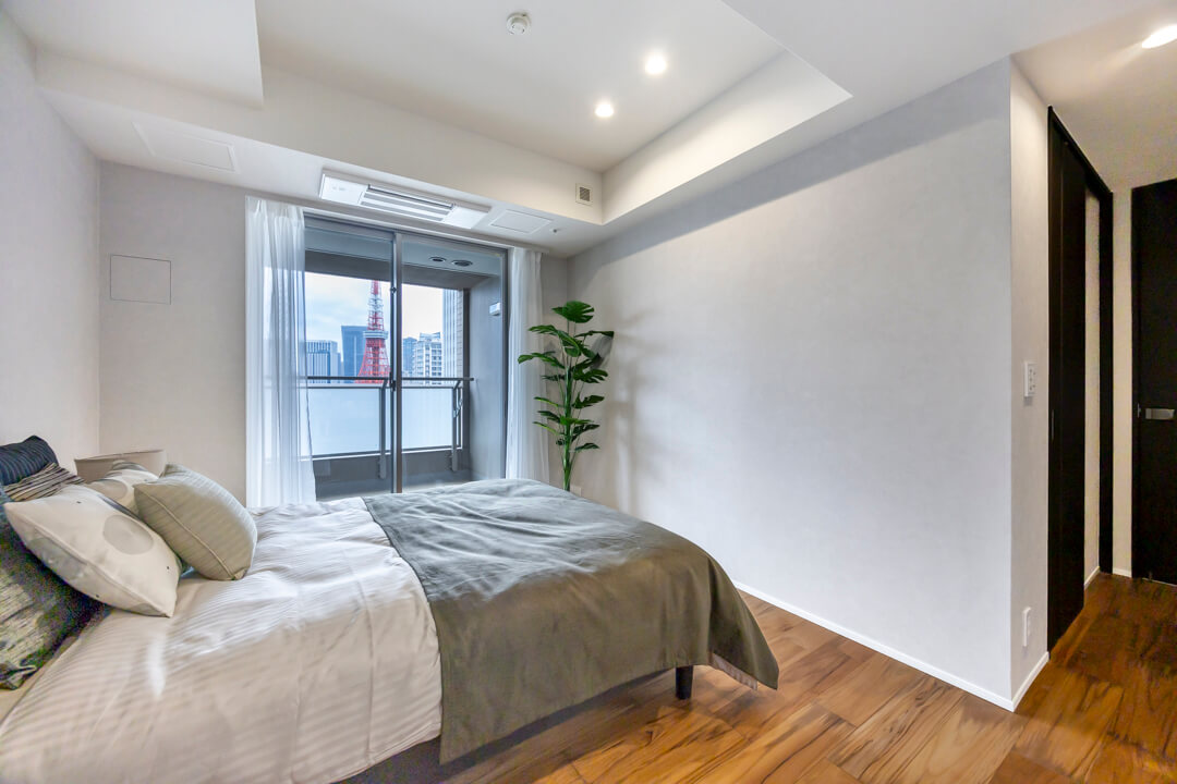 約9.7帖の寝室1。ゆとりある広さで主寝室にぴったりです。バルコニー付きで開放感があり、大きな窓からは東京タワーが見えますよ。間接照明のやわらかな明かりがリラックスタイムへ誘ってくれそうです。