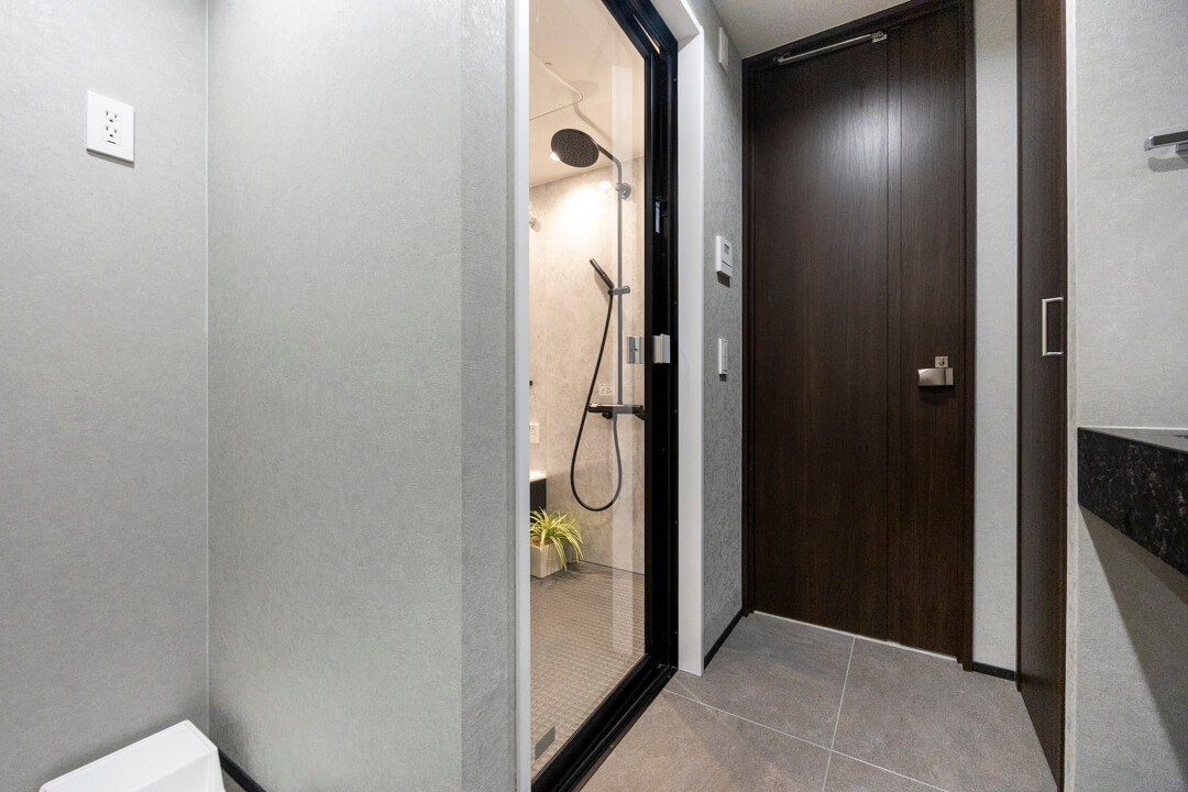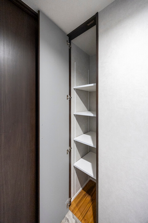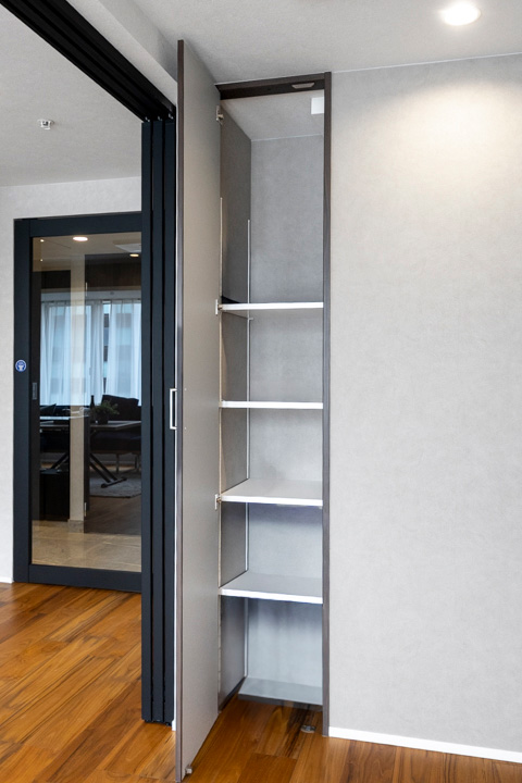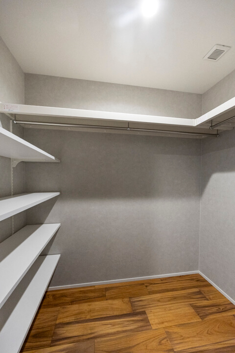 お部屋に入ってすぐ右手には大容量のWIC(ウォークインクローゼット)を完備。ハンガーパイプ&可動棚備え付けで荷物を整理整頓しやすいです。衣類はもちろん、トランクケースやゴルフバッグといった大きな荷物も収納でき、居室空間を広々と使うことができます。