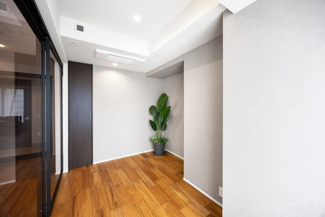 木の質感を感じるフローリングが印象的な内装。梁部分にも使用され、間接照明との調和がぬくもり溢れる空間を演出します。エアコンにはすっきりとした見た目のビルトインタイプを採用しています。