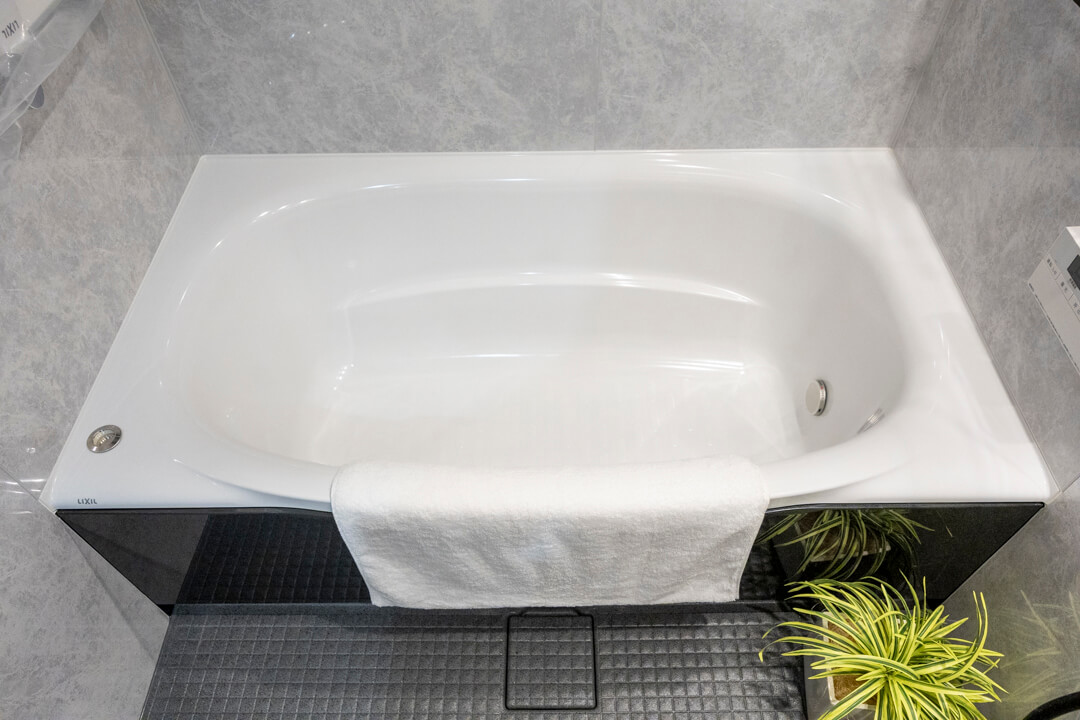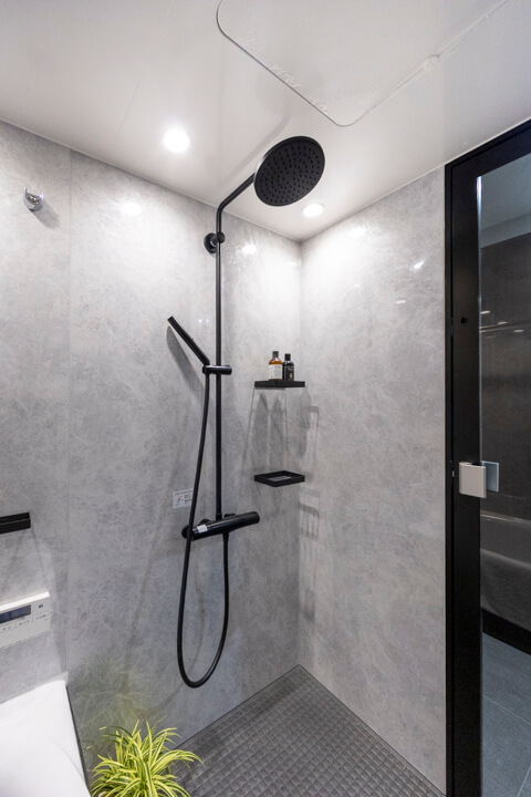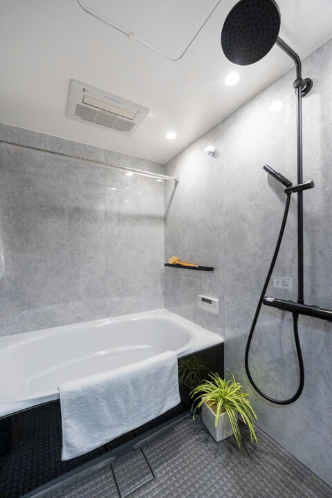 1418サイズのバスルーム。グレートーンで洗練された印象です。浴室換気乾燥暖房機・追い焚き機能搭載で、1年中快適なバスタイムを過ごせます。半身浴をしたい時も便利ですね。シャワーは2種類設置。全身でシャワーを浴びることができるオーバーヘッドシャワーでは、高い保温効果が期待できますよ。用途によってハンドシャワーと使い分けられるのも嬉しいポイントです。