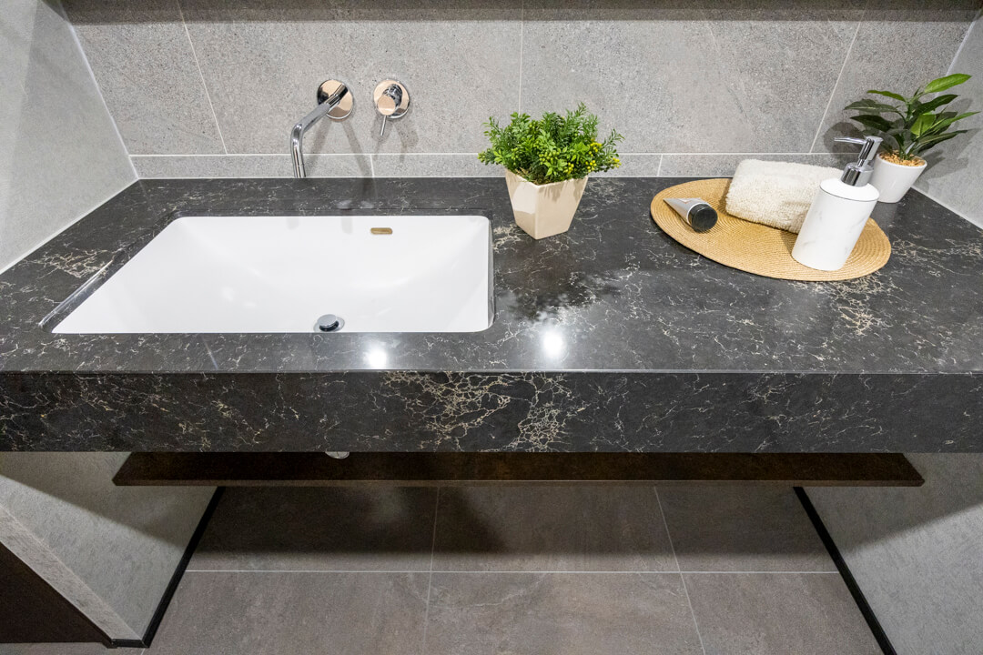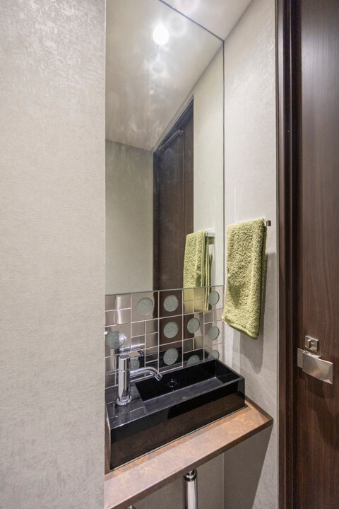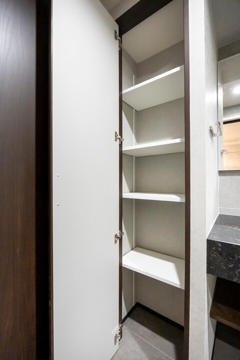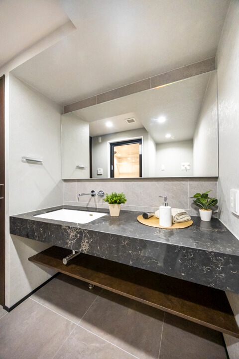 石調カウンターが高級感を演出する洗面化粧台。洗面ボウルが片側に寄せられていて、カウンタースペースが広く確保されています。化粧品やドライヤーの仮置きができ、忙しい朝の身支度がスムーズに行えそうですね。可動棚仕様のリネン庫が設置されていて、収納スペースも充実しています。