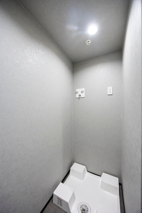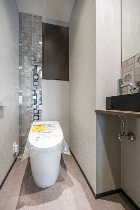 廊下に面していて独立性の高いレストルーム。スタイリッシュなアクセントウォールが印象的な空間です。すっきりとした見た目のタンクレストイレに交換済み。TOTO製の洗浄機能付きで、便フタが自動開閉式なのも嬉しいポイントです。手洗いカウンター&収納棚付きで使い勝手の良い空間です。