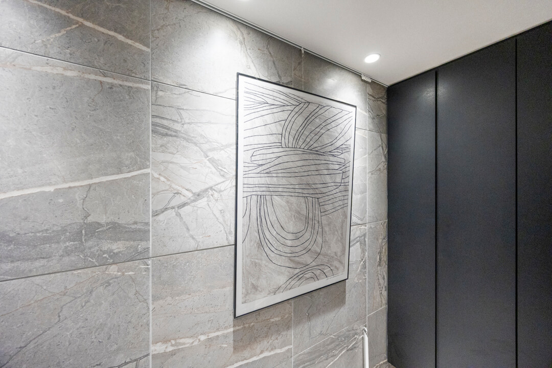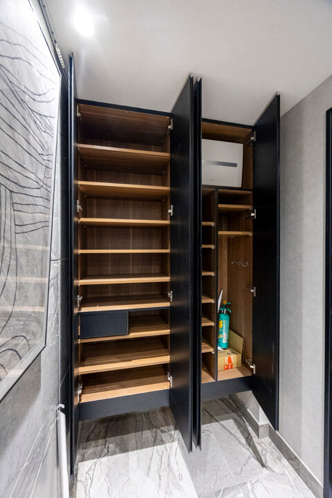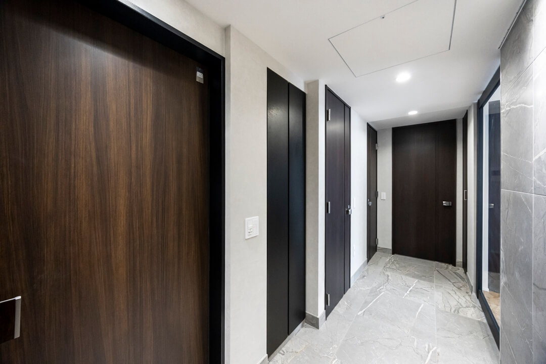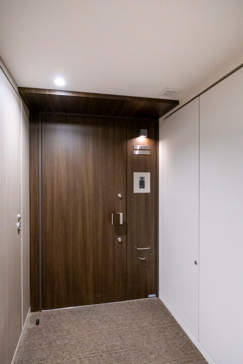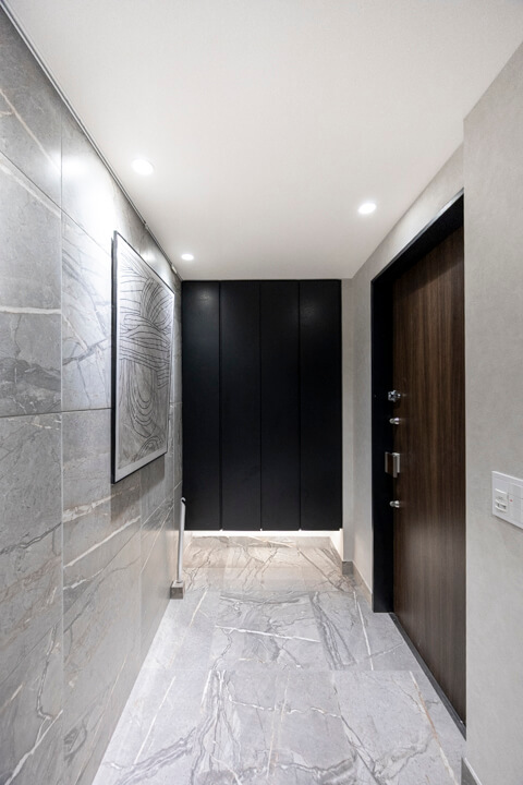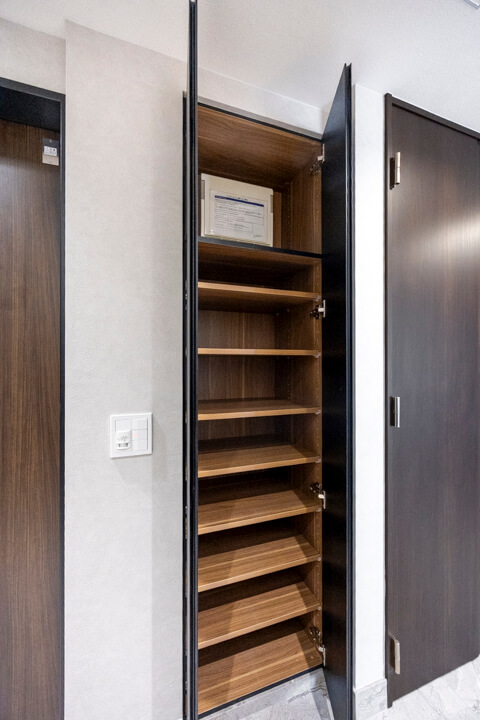 タイル貼りでホテルライクな玄関ホール。入って正面の壁にはピクチャーレールが設置されており、お気に入りのアートを飾ってインテリアを楽しむことができます。大容量のシューズボックスと2つの廊下収納があり、収納も豊富◎。靴はもちろん、日用品ストックや掃除用品の収納に重宝しそうです。