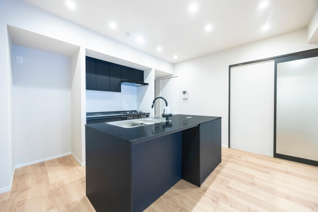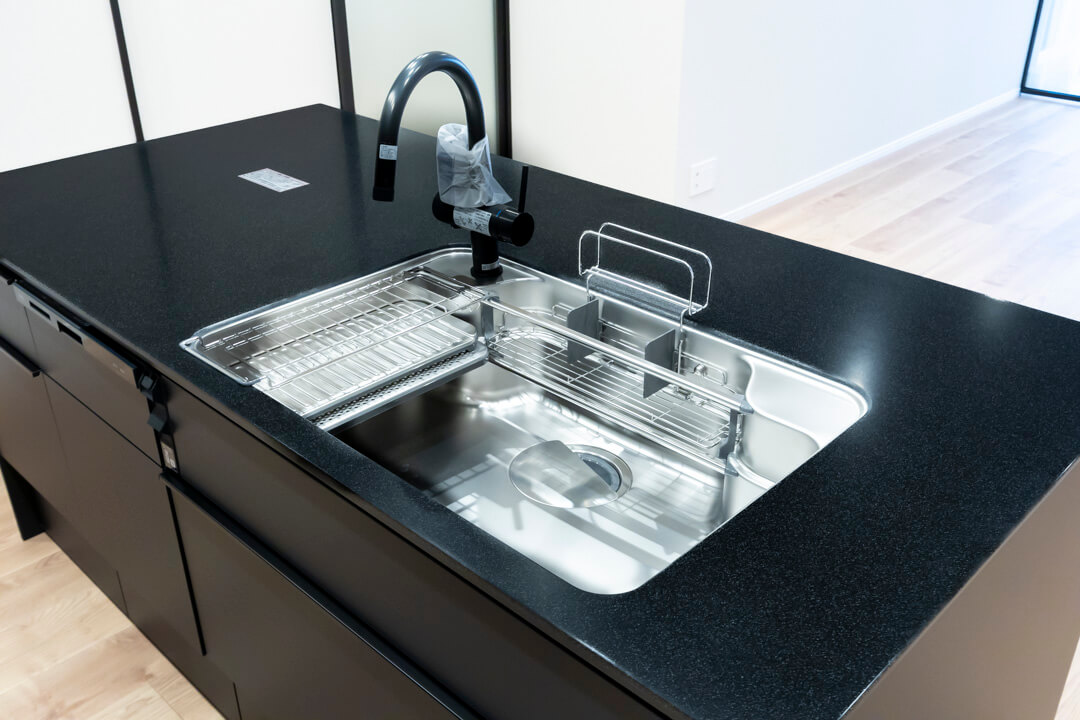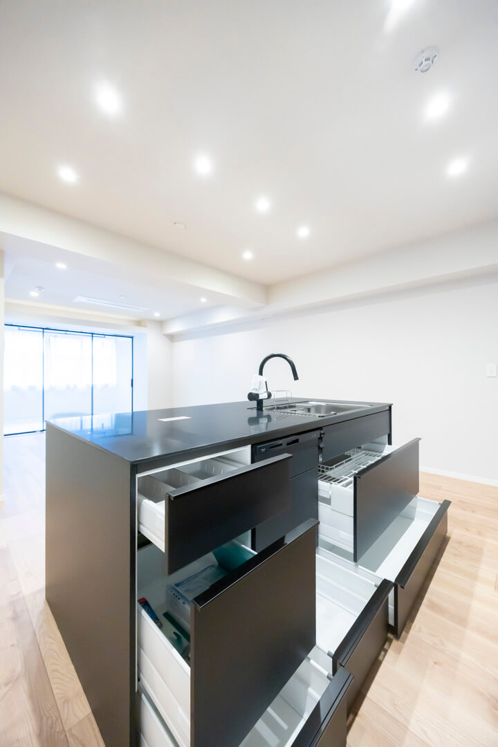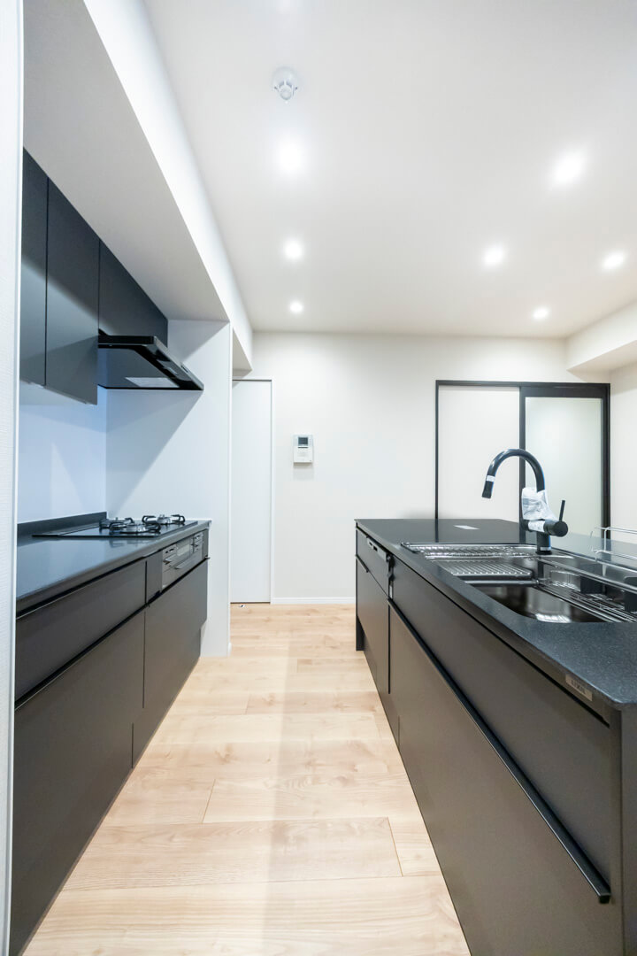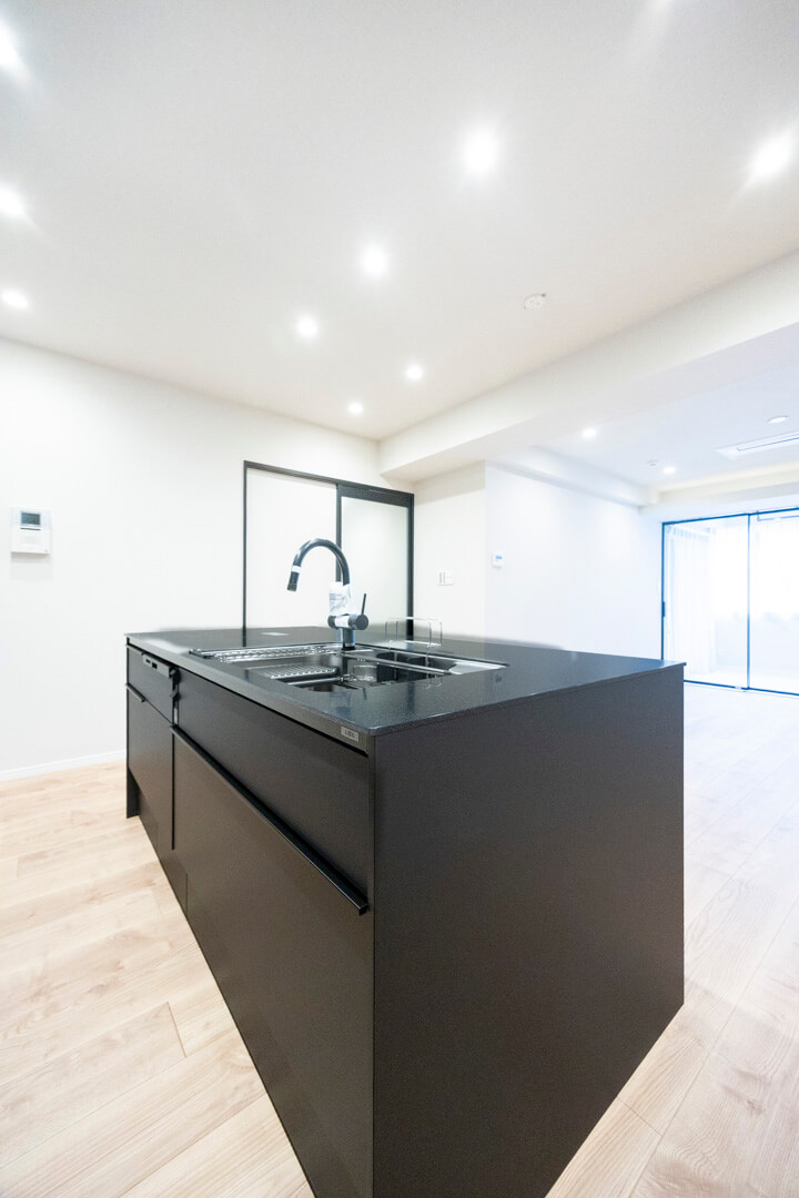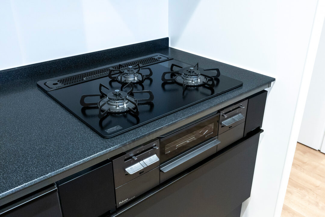 開放感たっぷりのアイランドキッチン。リビングダイニングを見渡せ、家族やゲストとのコミュニケーションも取りやすくなっています。Ⅱ型のシステムキッチンで、作業スペースも広々。マットな質感のブラックカラーでスタイリッシュな空気感も◎。家事の時短に心強い食洗機、料理が捗る3口ガスコンロ付きで設備も充実しています。