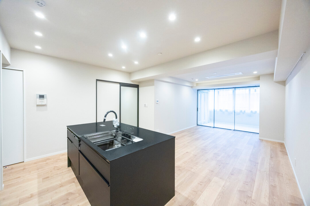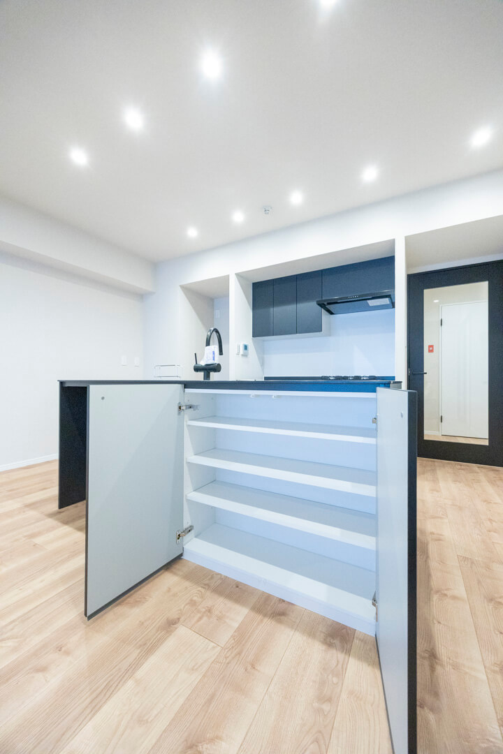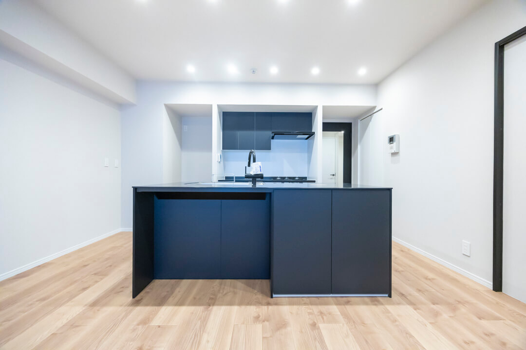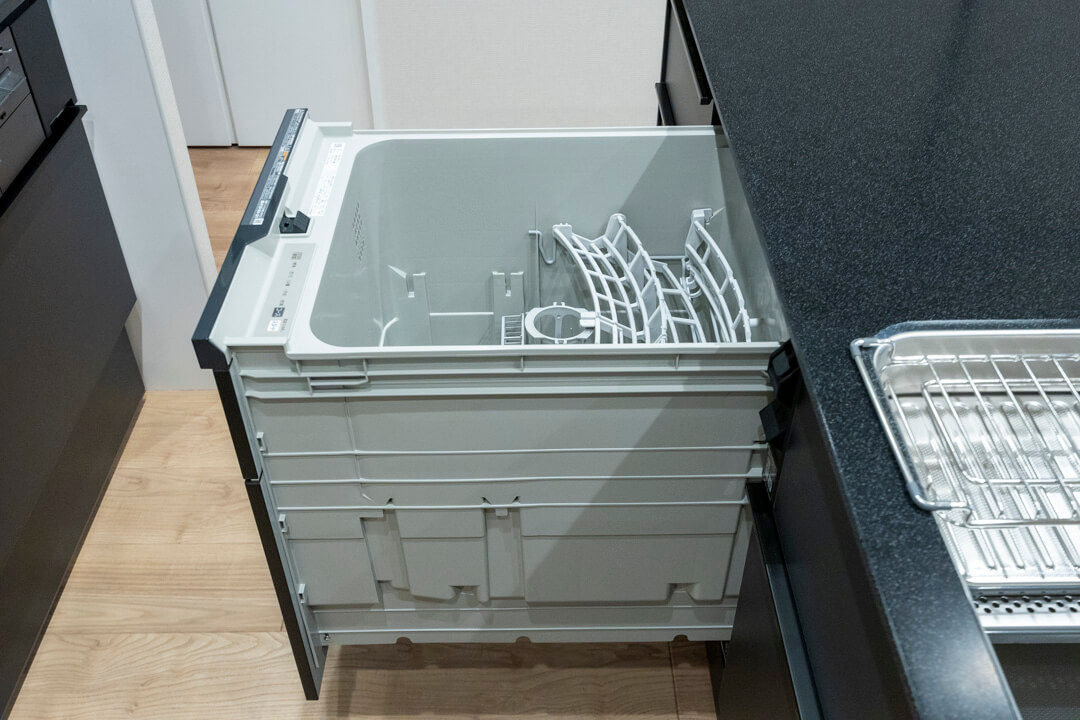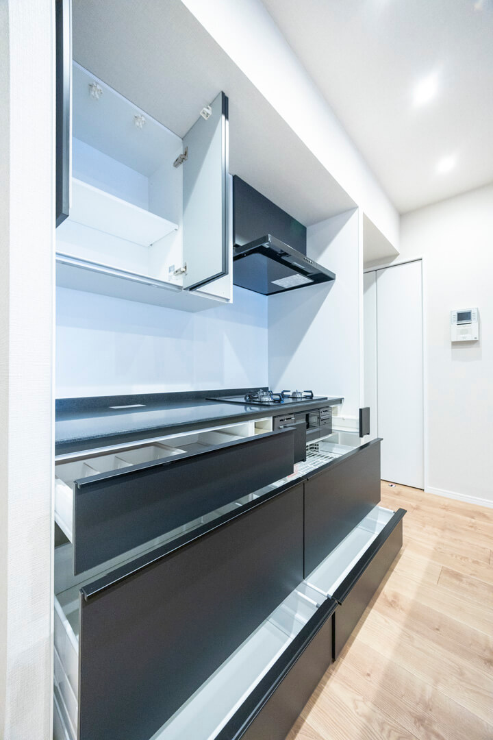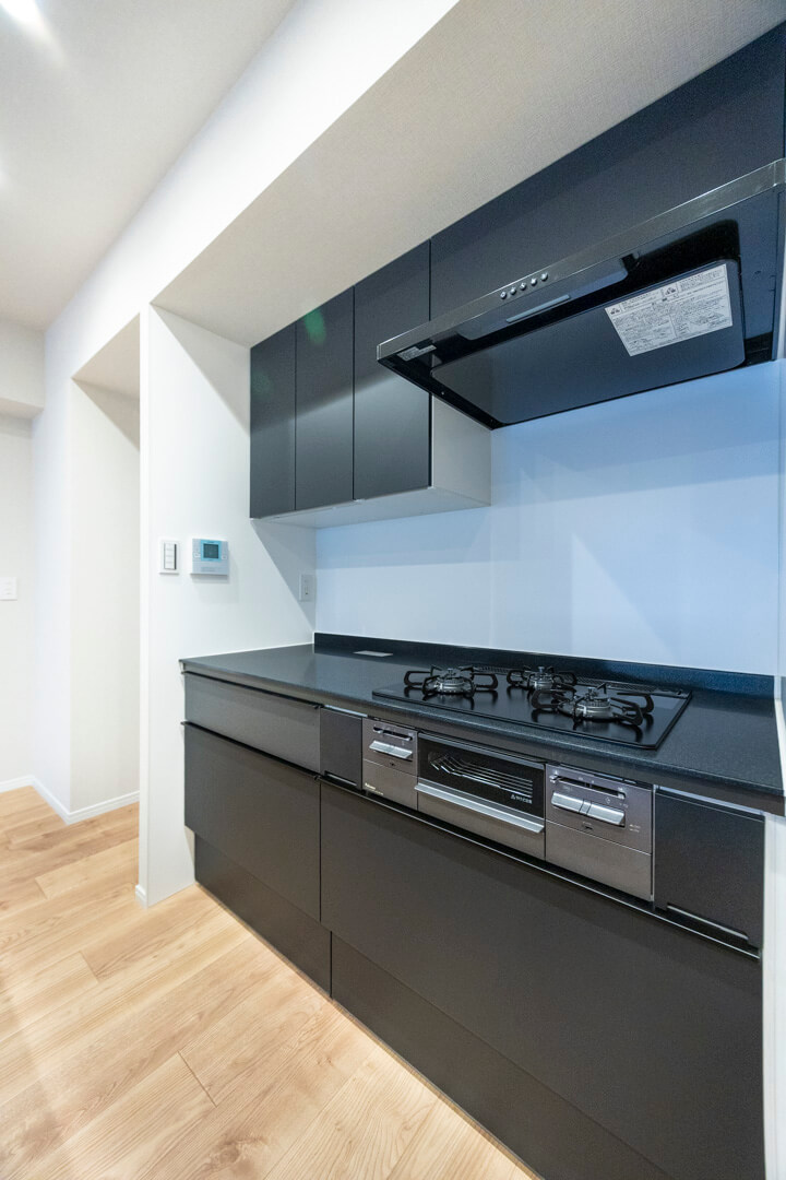 開放感たっぷりのアイランドキッチン。リビングダイニングを見渡せ、家族やゲストとのコミュニケーションも取りやすくなっています。Ⅱ型のシステムキッチンで、作業スペースも広々。マットな質感のブラックカラーでスタイリッシュな空気感も◎。家事の時短に心強い食洗機、料理が捗る3口ガスコンロ付きで設備も充実しています。