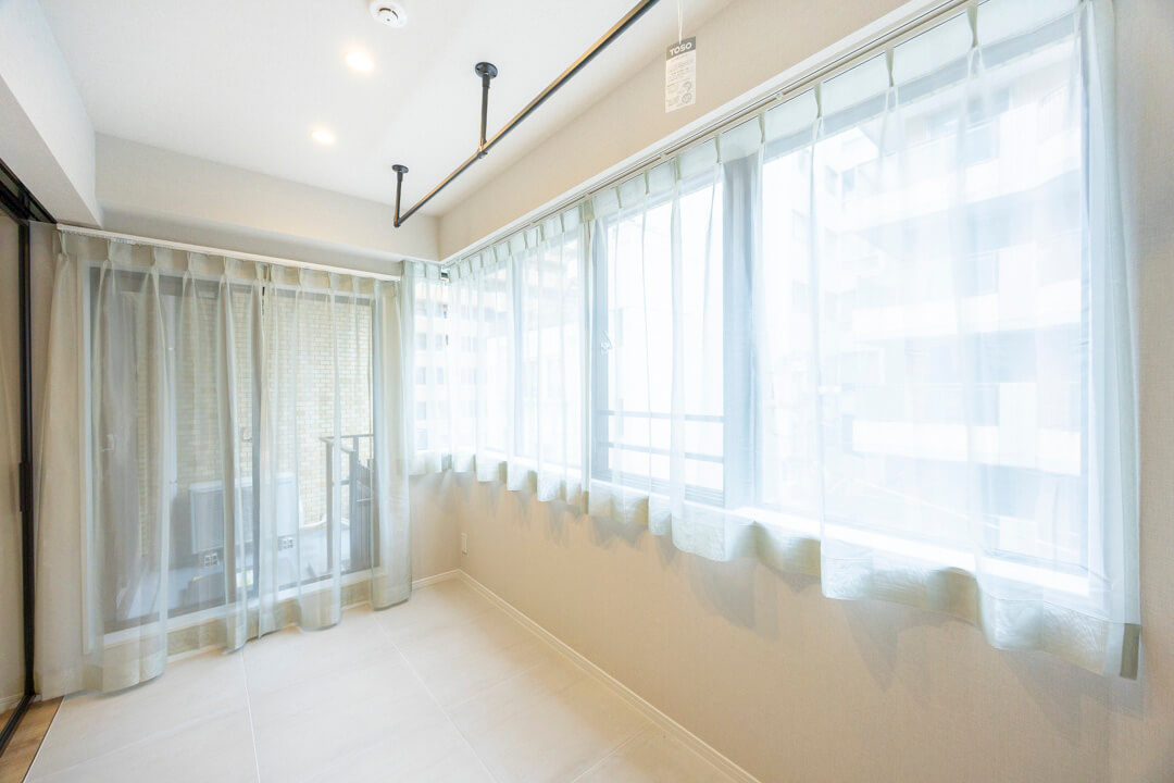キッチンスペースを含め、約18.1帖のLDK。家族でゆったり過ごせる広さです。窓際には約4.1帖のサンルームが付いていて、南向きで陽当り良好。ガラス戸になっていて、リビングと繋げて過ごすことができます。サンルームの天井にはハンガーパイプが設置されていて室内干しに便利。キッズルームや、植物とソファを並べて室内テラスのようにも使えます。