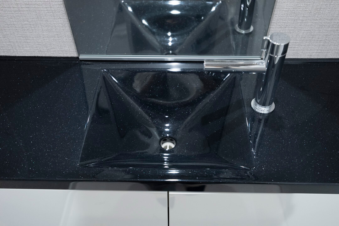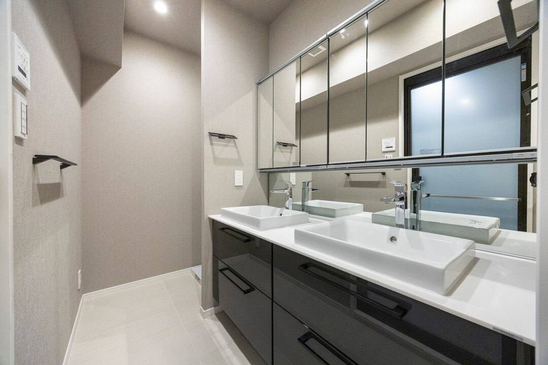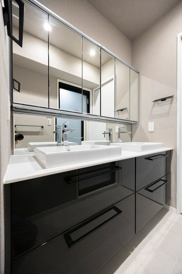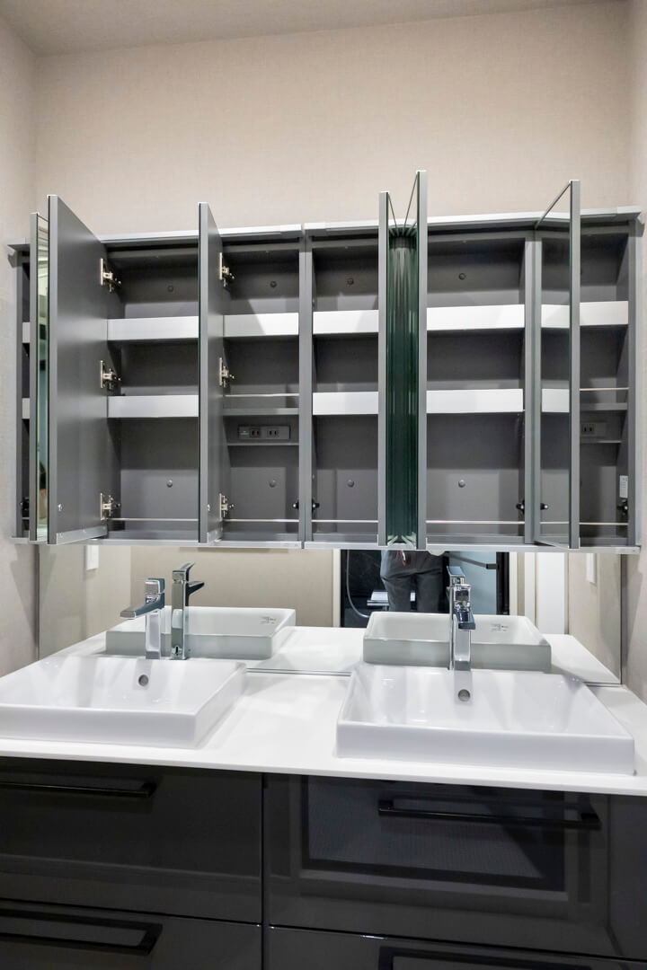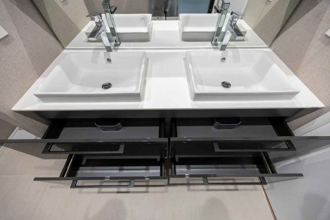 ホテルライクな2ボウルの洗面化粧台。家族で使用時間が重なってもそれぞれゆっくり使えます。洗面まわりの小物がすっきり整頓できるミラーボックスや、モノの出し入れがしやすい引き出し式のキャビネット付きで使い勝手の良さもポイントです。