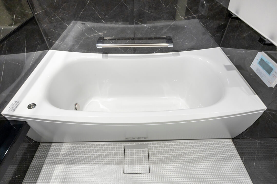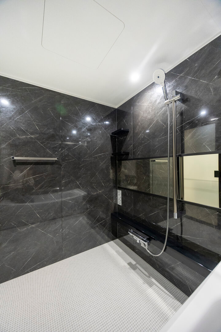 1620サイズのゆとりある広さのバスルーム。お子さんとの入浴タイムも広々過ごせます。モノトーンで統一されたシックな雰囲気。追い炊き機能の他、衣類乾燥・換気・暖房・涼風の4つの機能が備わっており、一年中快適にバスタイムが楽しめます。また、ランドリーパイプも付いていて雨の日や冬場の洗濯にも困りません。