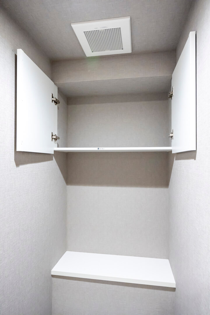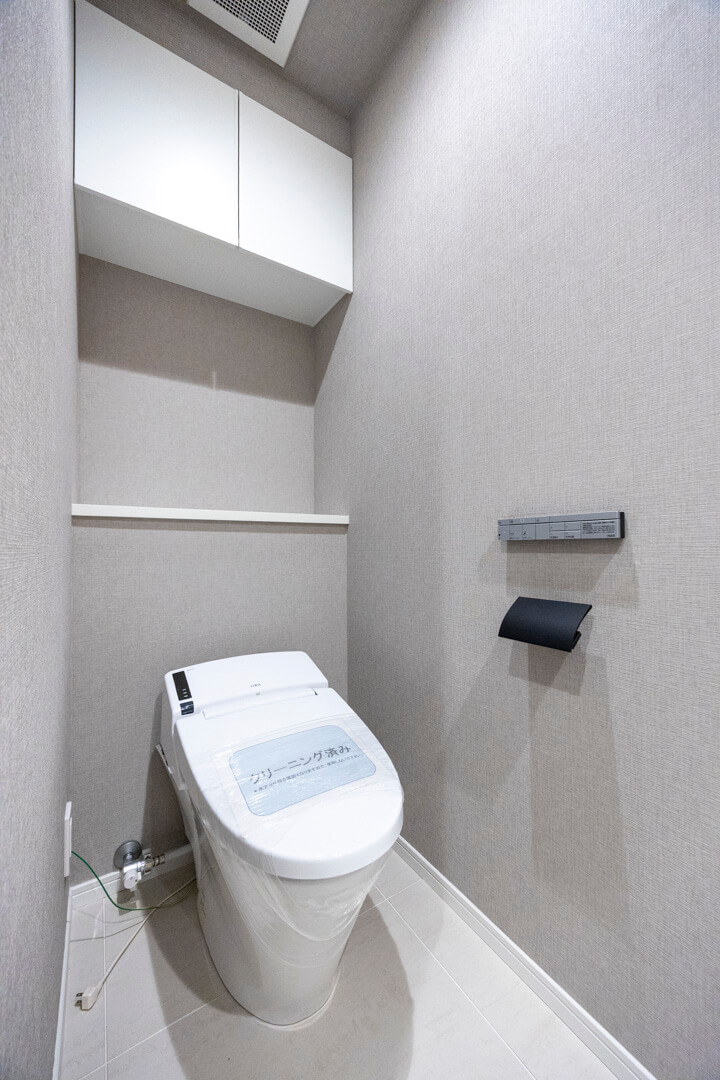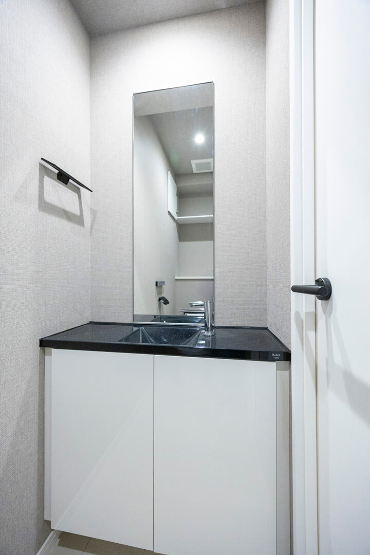 廊下に面したレストルーム。空間がすっきり見えるタンクレストイレです。独立型の手洗いカウンター、ウォシュレット、収納スペースも備わっています。