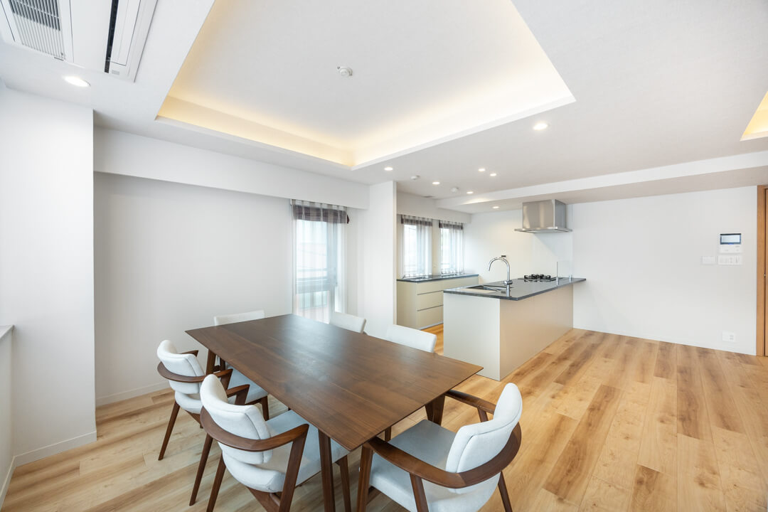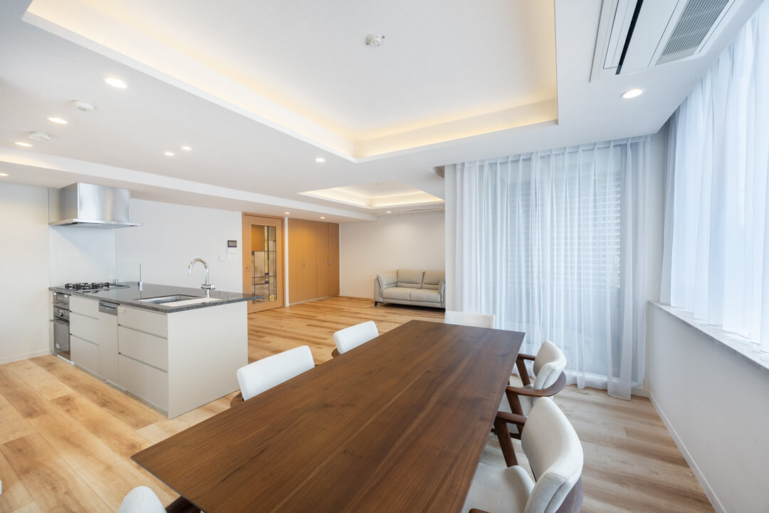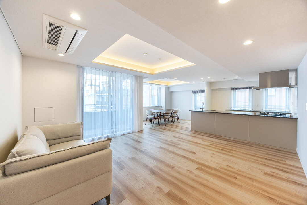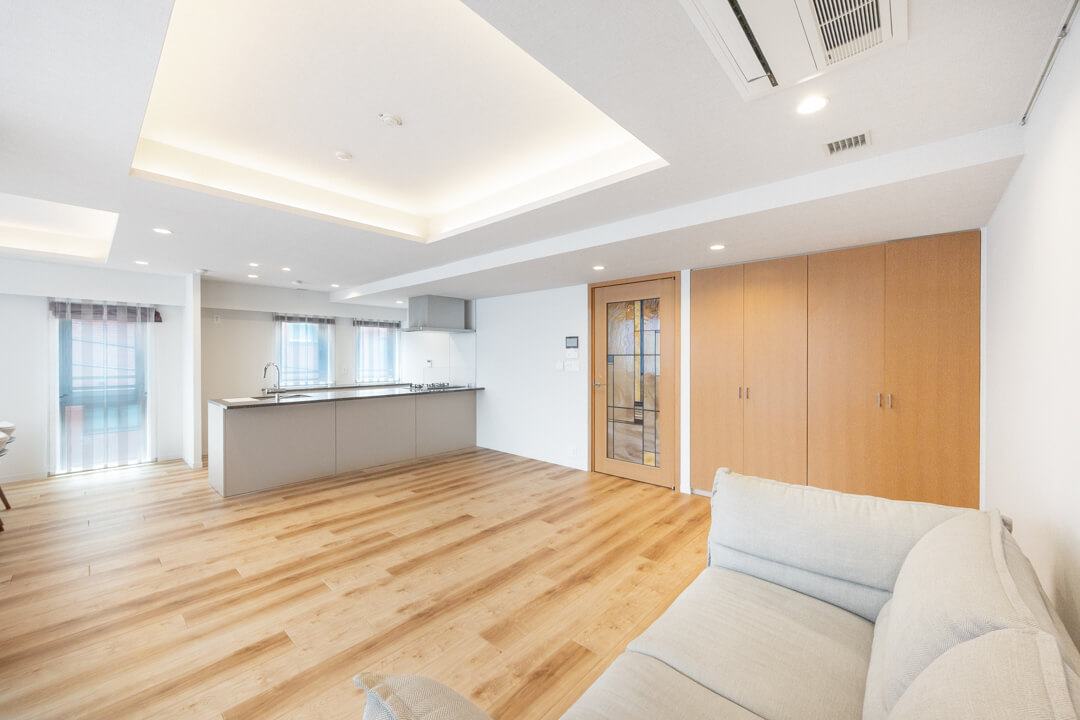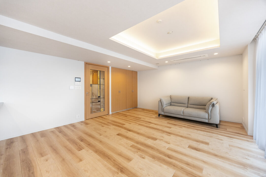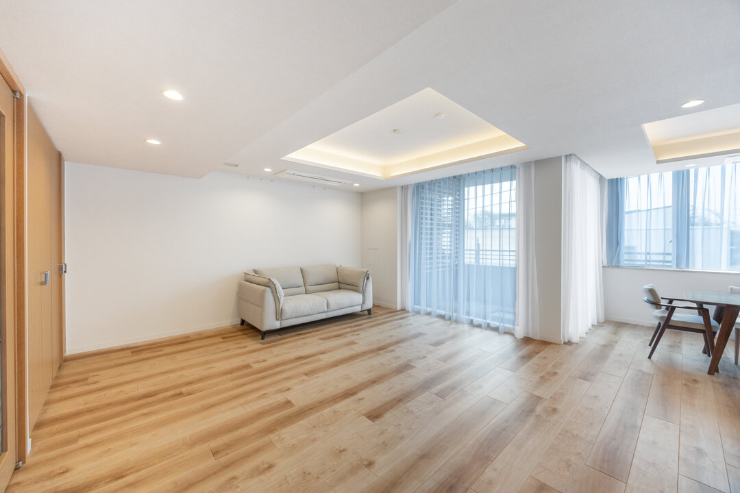 約26.1帖の開放感溢れるLDK。3面採光で、明るい光と心地よい風がたっぷり届きます。家族はもちろん、ゲストを招いてもゆったり過ごせそうですね。フローリングは自然な風合いの木目柄で、木の温もりを演出。さまざまなテイストの家具と合わせやすいのもポイントです。折り上げ天井には間接照明が施され、やわらかな明かりがリラックスタイムへ誘ってくれそうです。