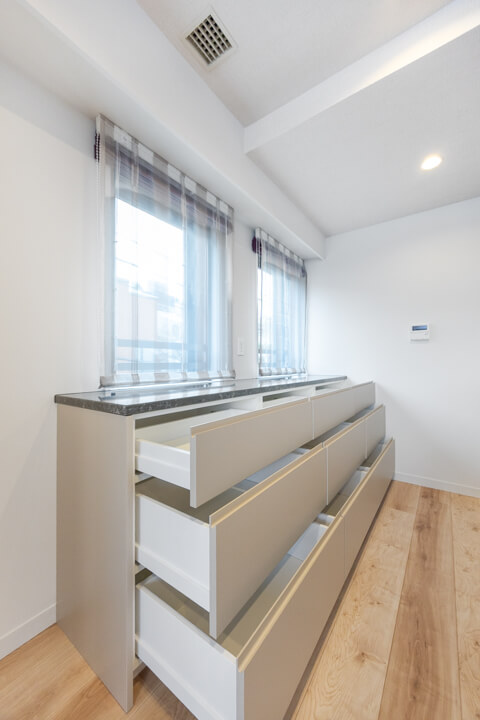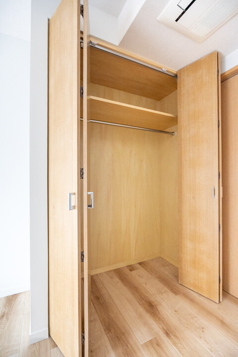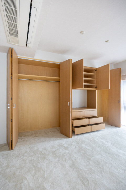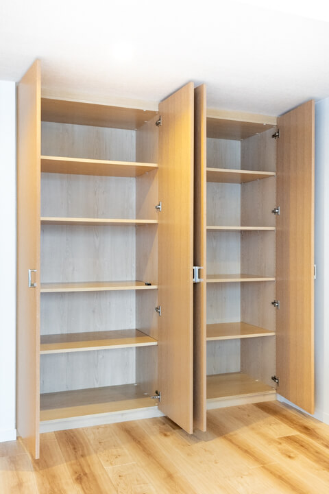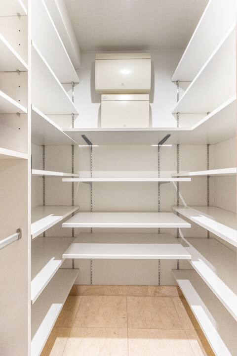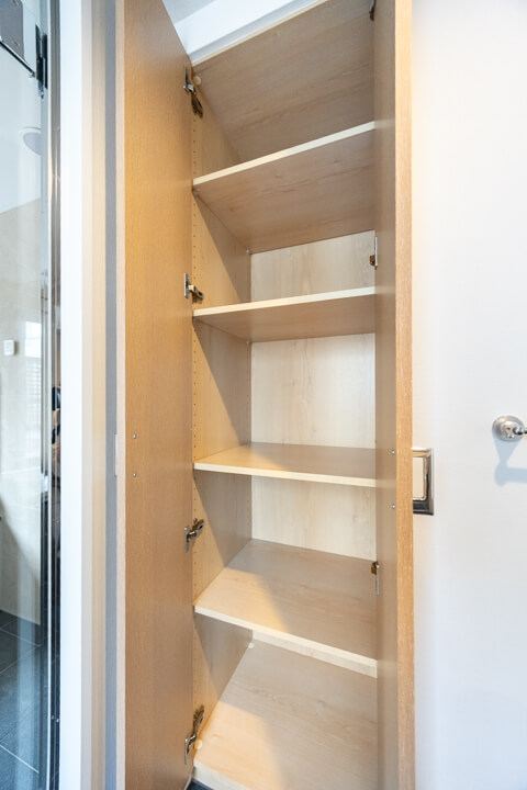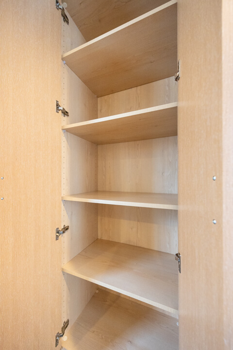 LDKに入ってすぐ左手には、大容量の収納を完備しています。可動棚なので自由度が高く、生活小物から日用品ストックまでたっぷり収納可能◎。すっきりとしたリビング空間をキープできそうです。