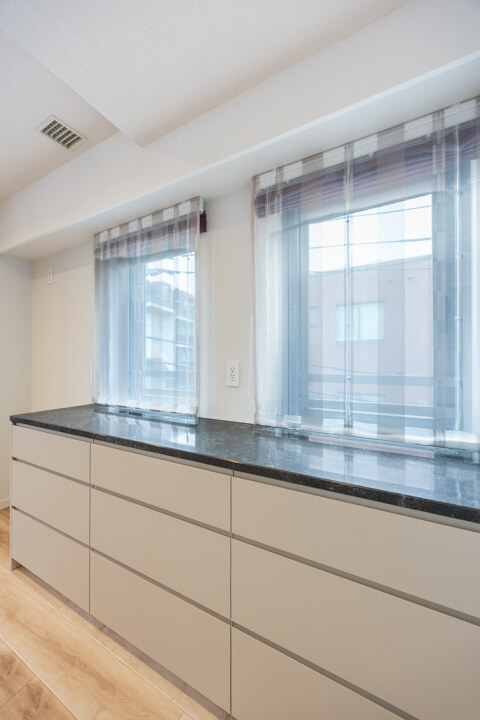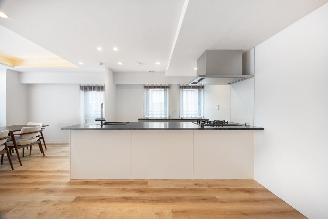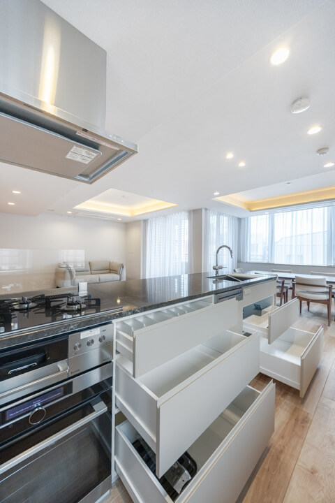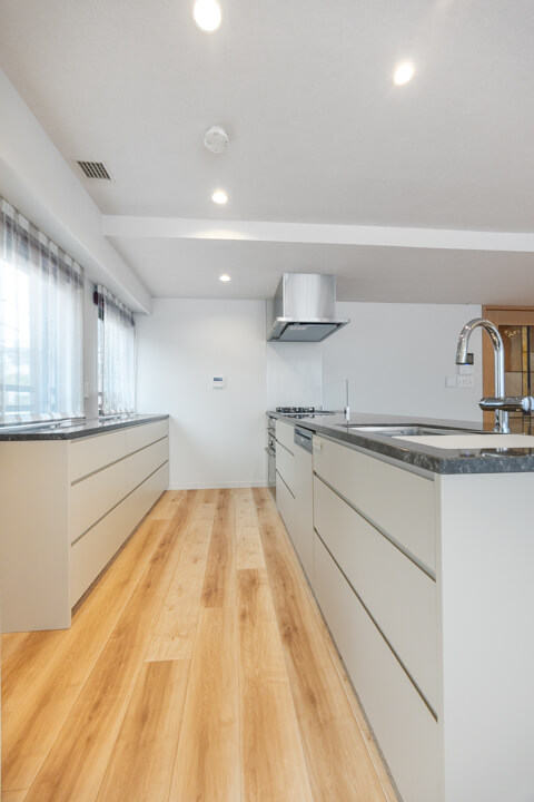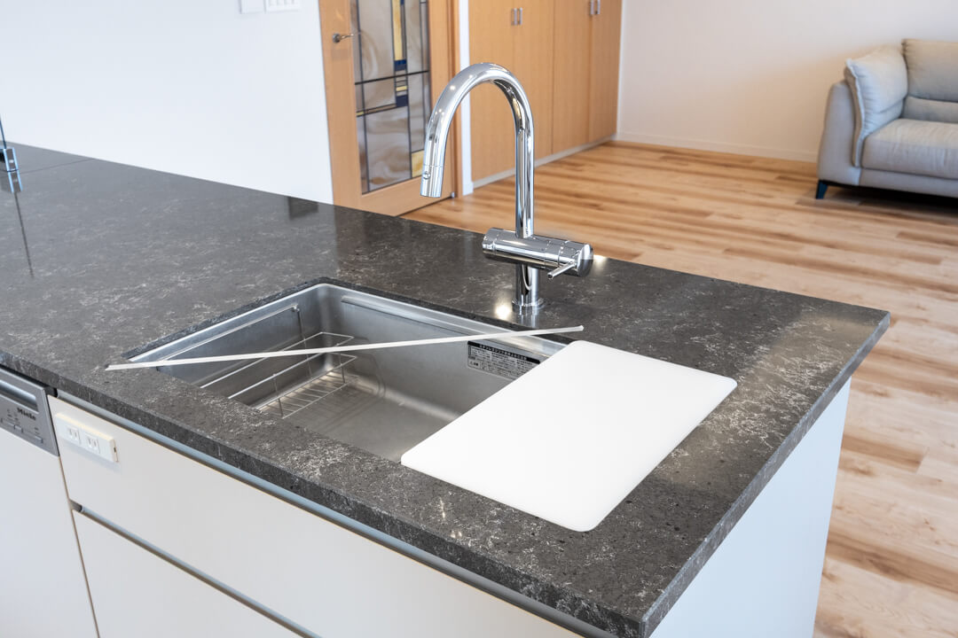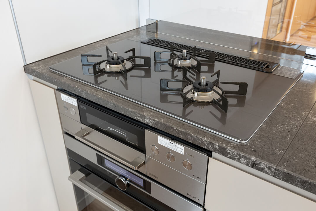 石調カウンターでスタイリッシュなキッチン。開放的な気分で調理ができる対面型です。家族やゲストとの会話も弾みそうですね。コンロ前にはガラスガードが設置されているので、リビング側への油跳ねの心配はありません。