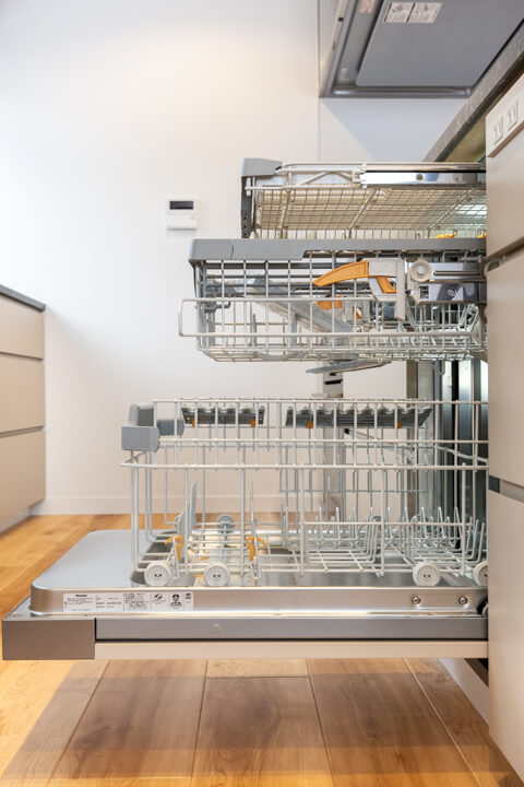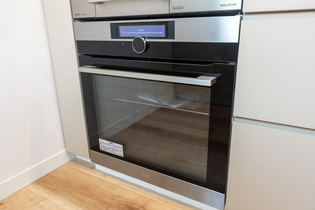 グリル付3口ガスコンロ・AEG製のオーブン内蔵で同時調理が可能。効率が上がり、料理のレパートリーも増えそうです。食洗機は容量の大きさで人気のMiele(ミーレ)製。後片付けの時短が叶いますよ。さらに、ディスポーザーも搭載されているので、掃除の手間が軽減され、悪臭の原因を防いでくれます。